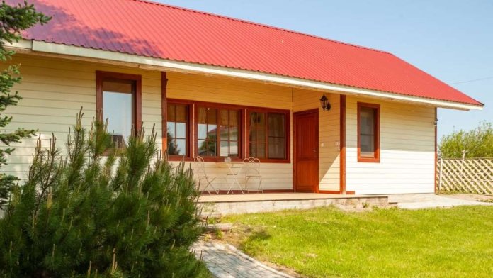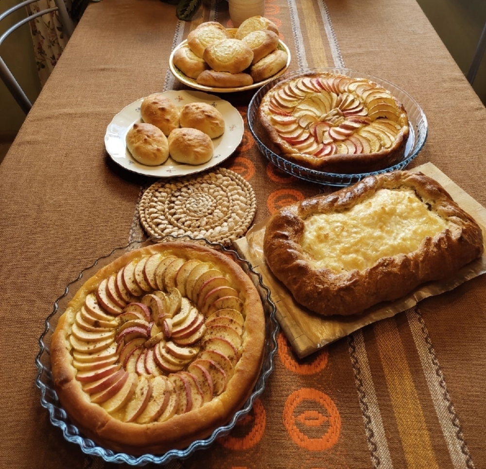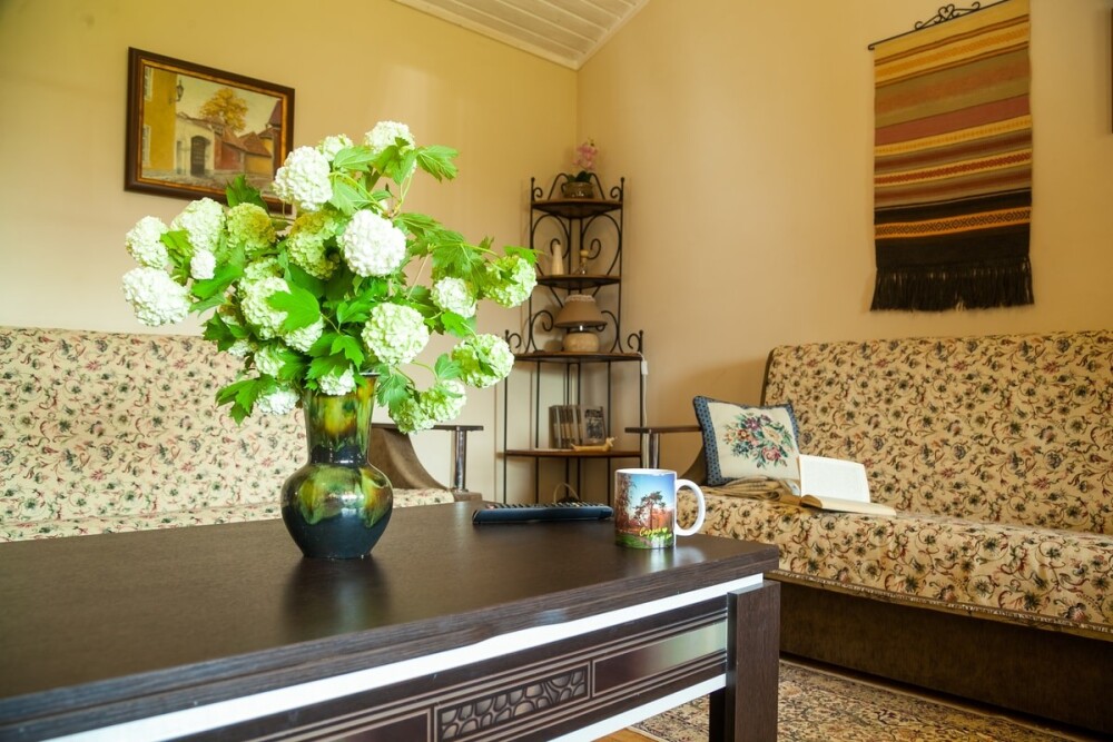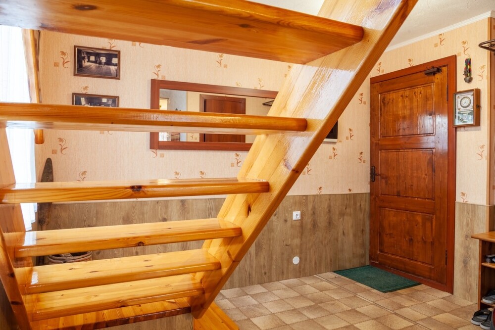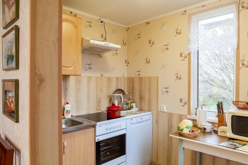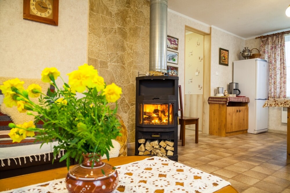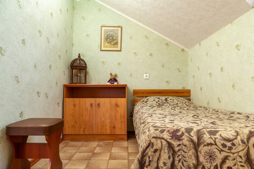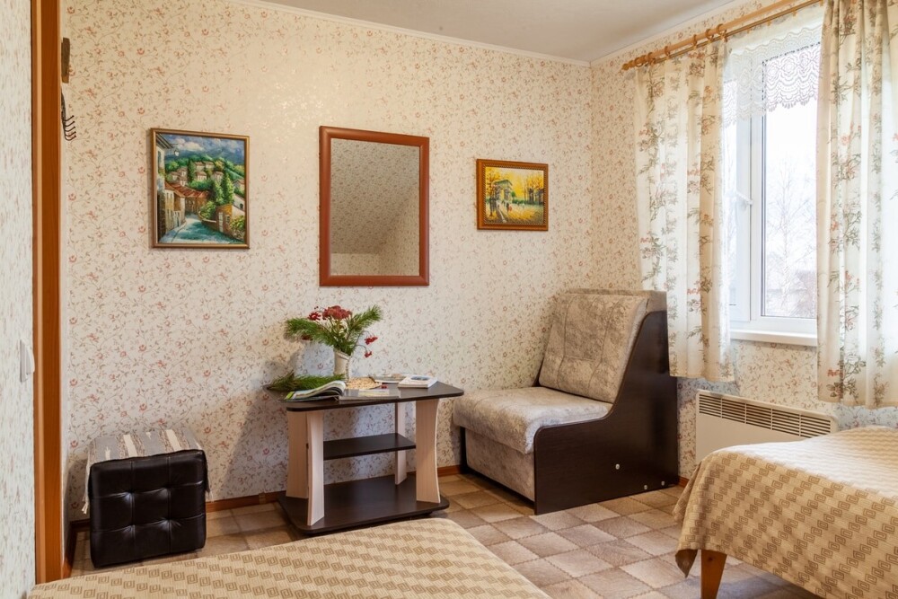 Холл с большими окнами и высокими потолками с балками. В этой же комнате 2 раскладных дивана (для комфортного сна предоставим доп. наматрасники), журнальный стол (раскладывается), телевизор, зеркало, старинный сундук, шкаф с сувенирами и зона прихожей. Через дверь - кухня с полным набором посуды, электрическая варочная панель; далее - маленькая комната с диванчиком (раскладывается) и телевизором, из этой комнаты лестница ведёт в спальню с 2 основными местами. В доме санузел, горячая вода. Отопление - электрические тёплые полы (кафель, ламинат). Зимой тепло.