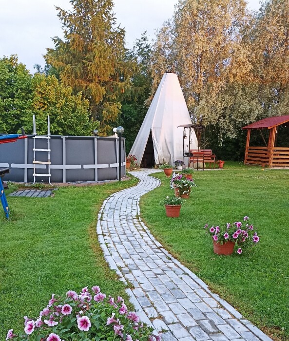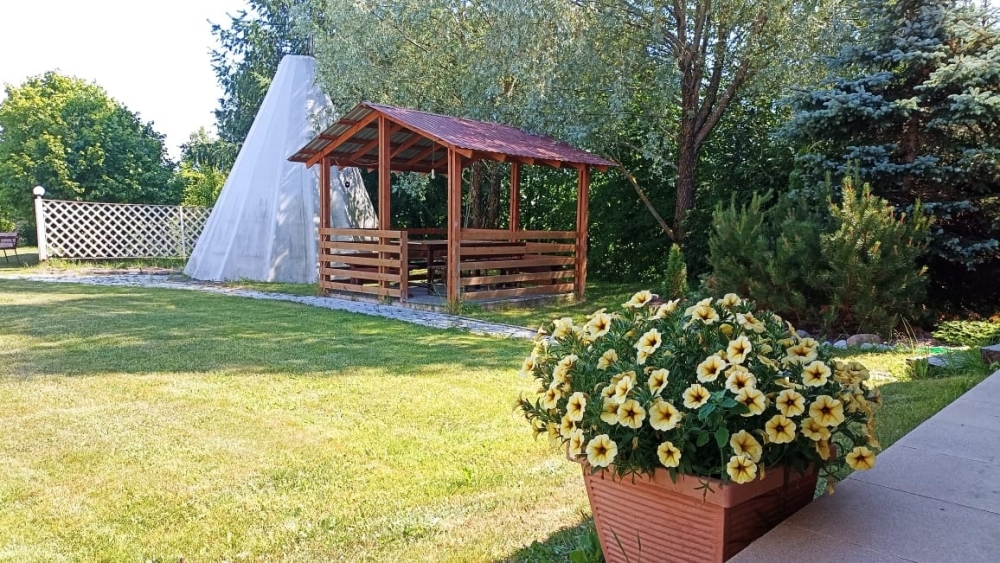 Во дворе - сад, вигвам, летний бассейн, баня, мангал с шампурами, детский спортивный комплекс, домик для детей, песочница, территория для игр.