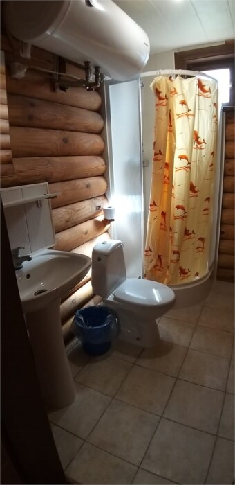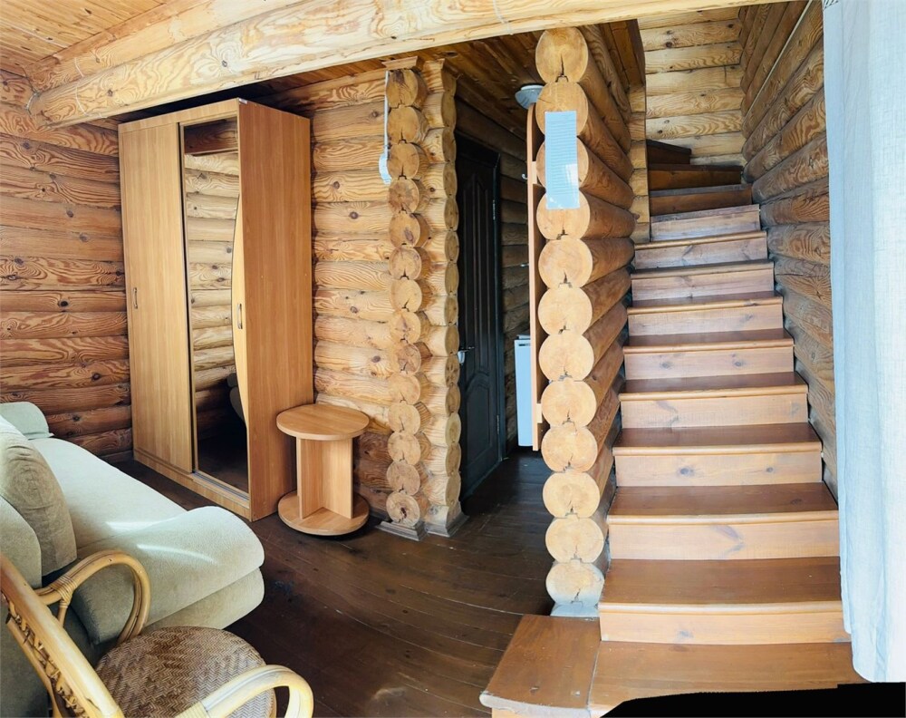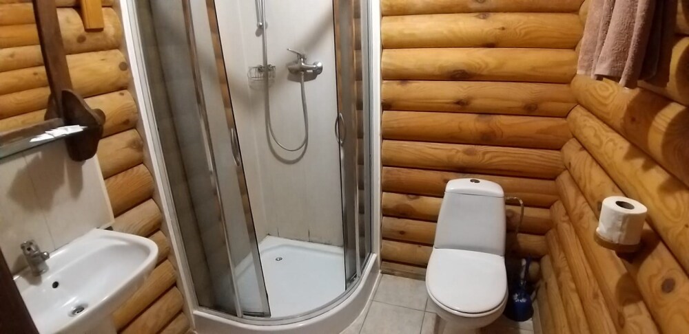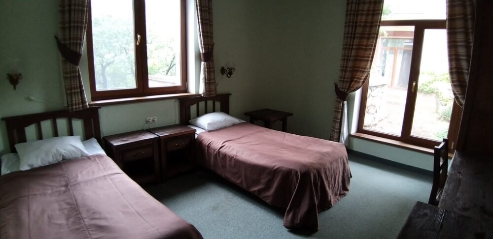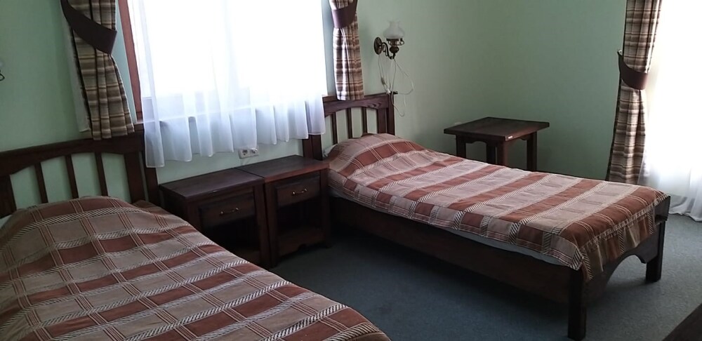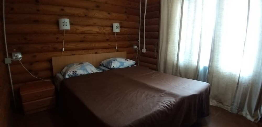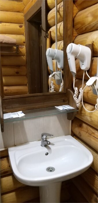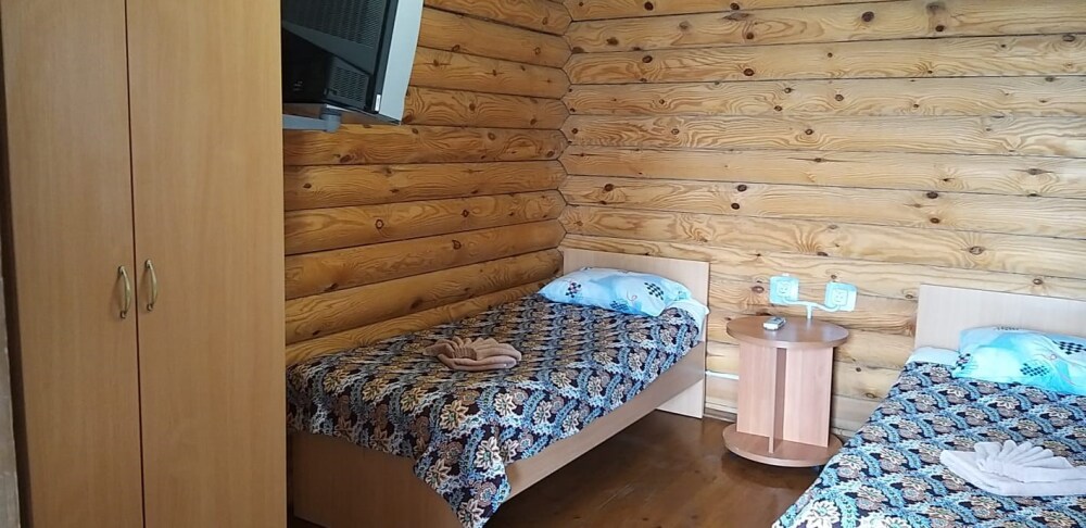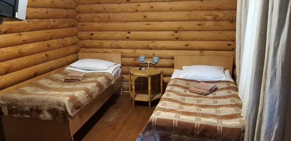 Эконом в сруб: однокомнатный двухместный номер для комфортного и бюджетного проживания с двумя односпальными кроватями, санузлом, кондиционером, горячей водой, холодильником, феном.