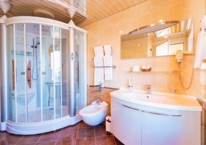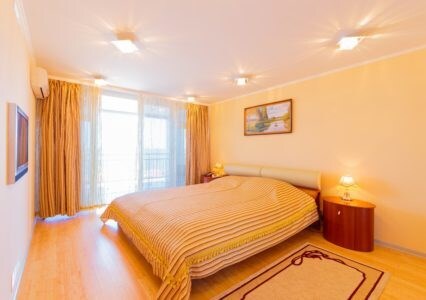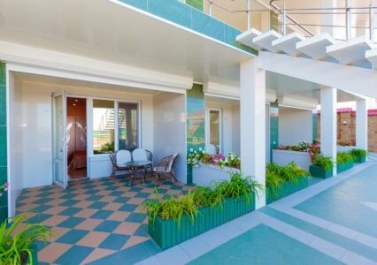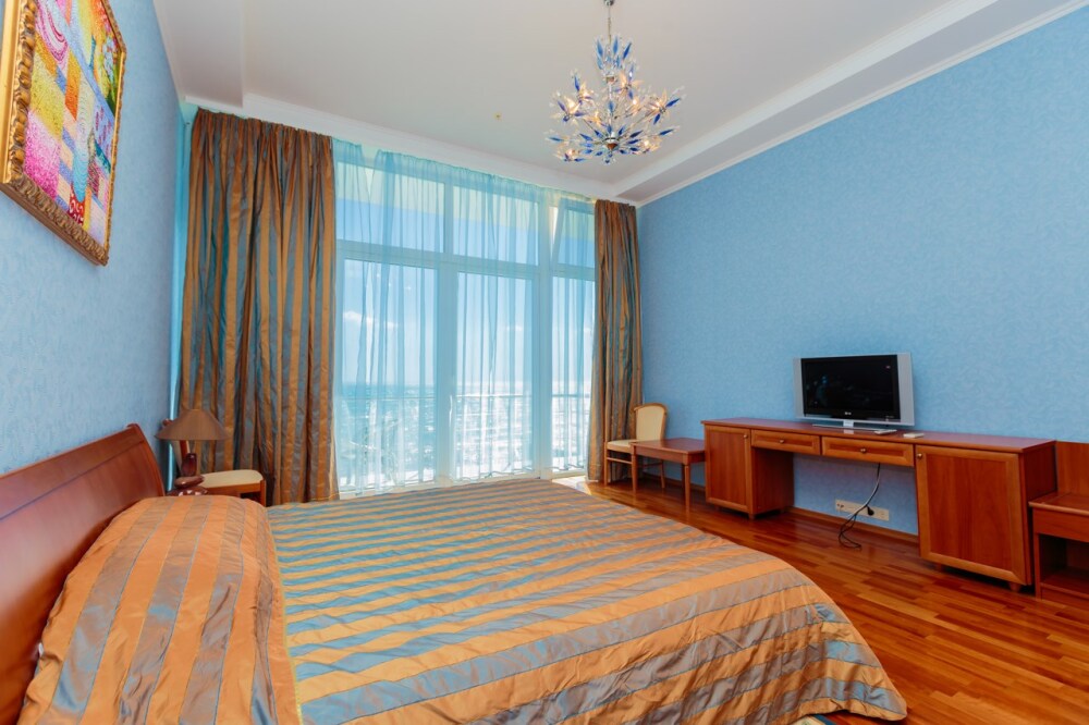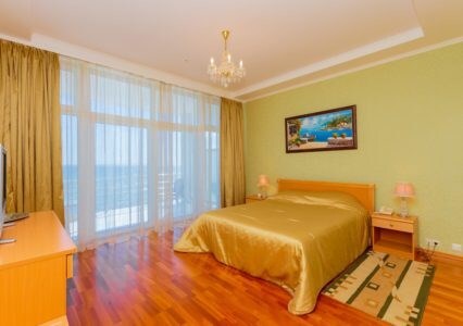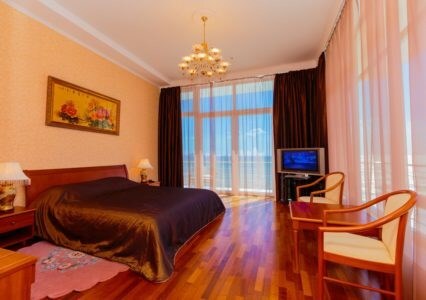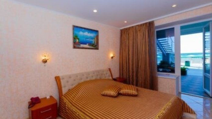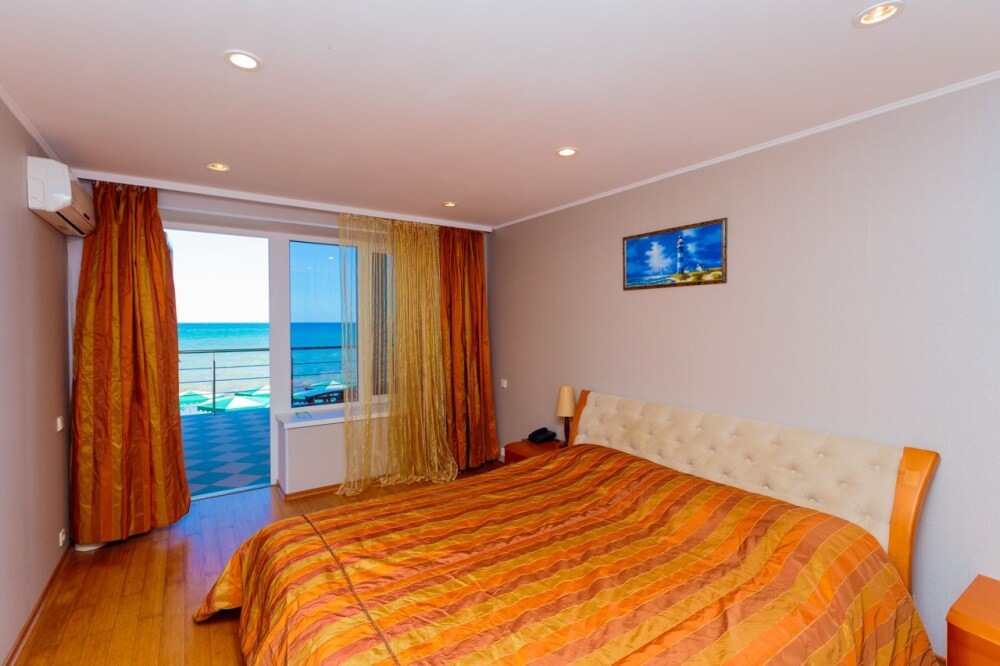 Просторные номера с удобной и современной мебелью, большие ванные комнаты с итальянской сантехникой. Панорамный номер с балконом с видом на море.