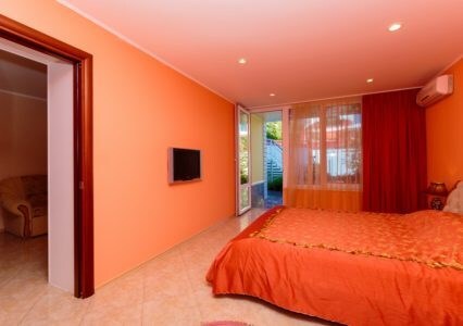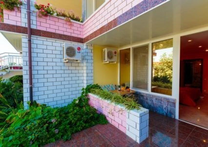 Двухкомнатный номер с двумя ванными комнатами, расположен в «Итальянском дворике», терраса в уютном зеленом оазисе. Идеальное место для тихого уютного отдыха.