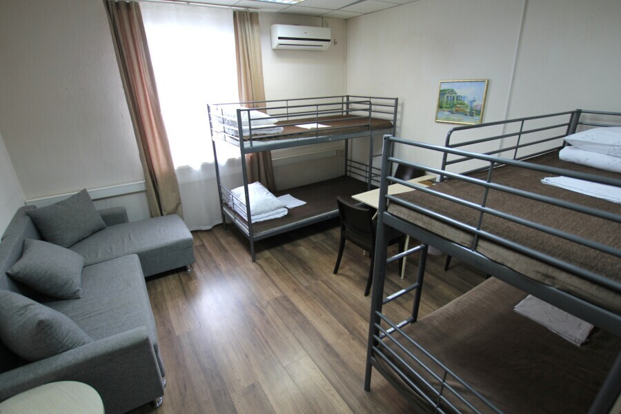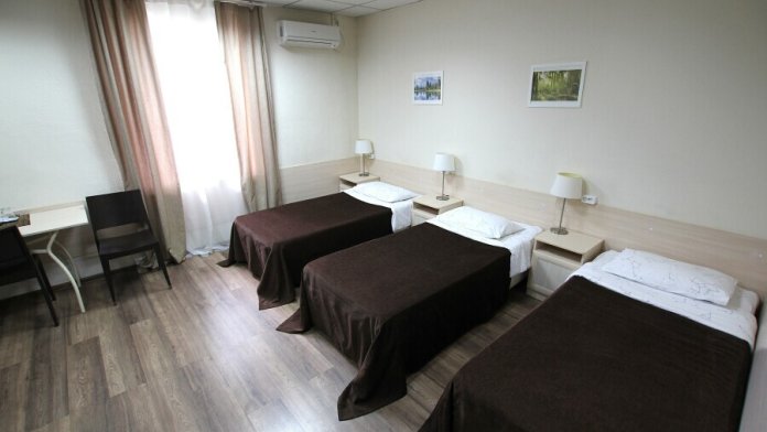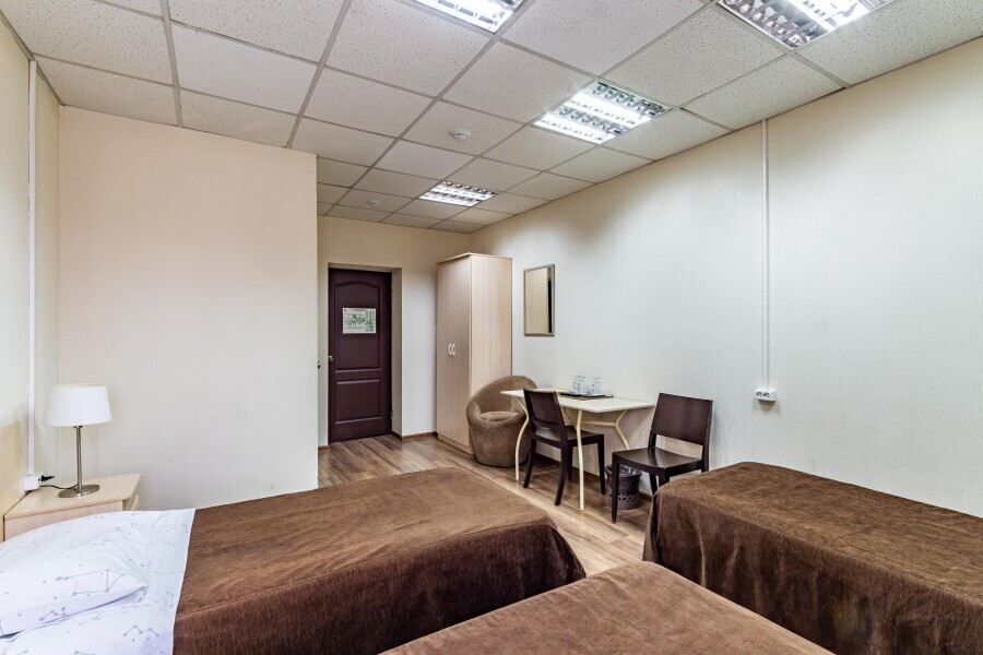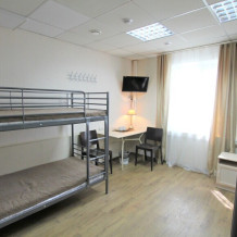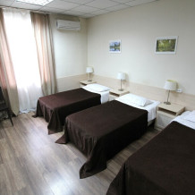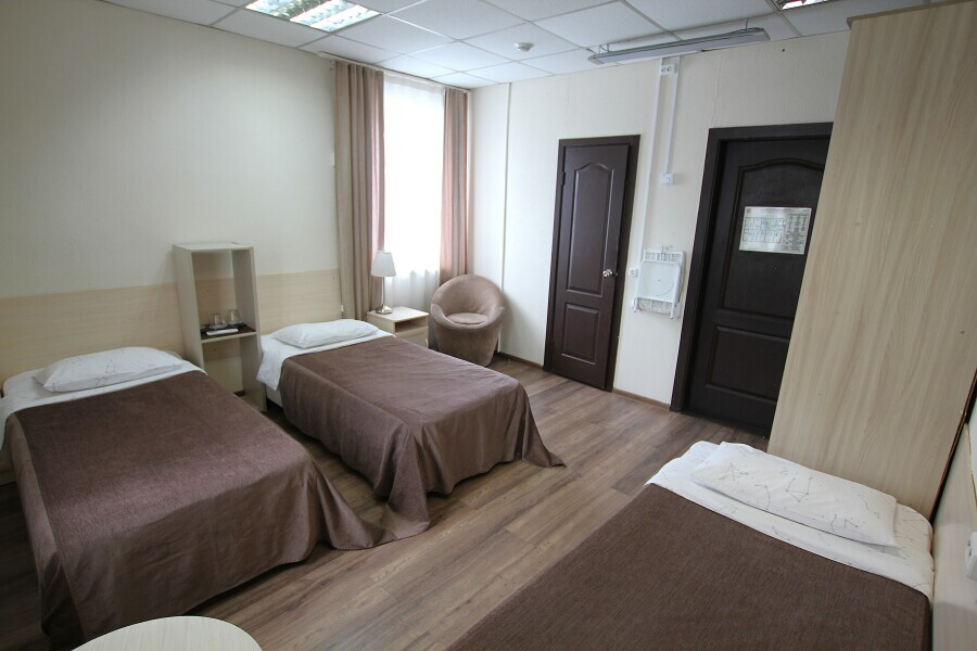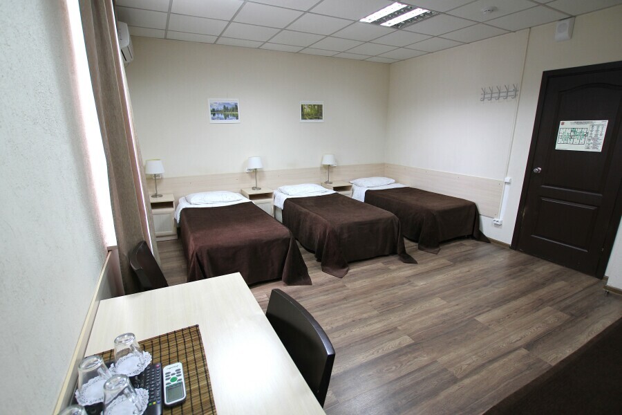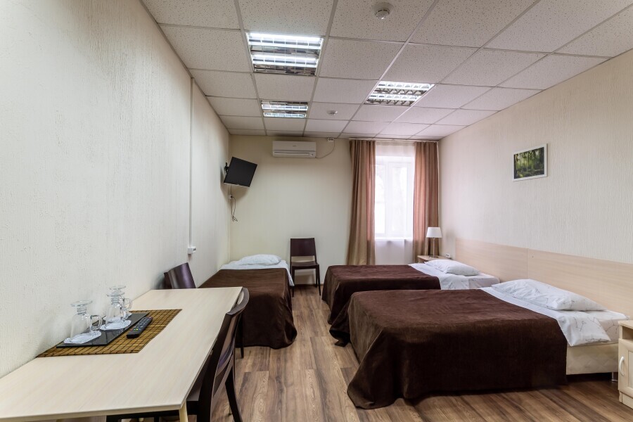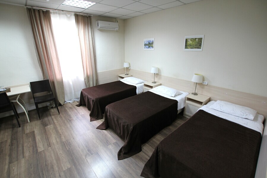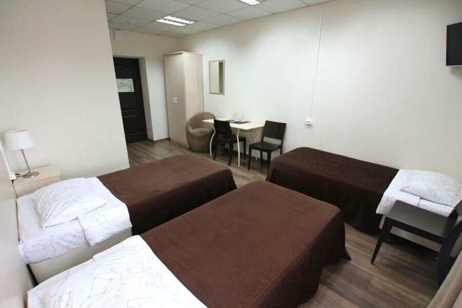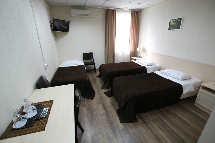 Просторный номер для трех человек. В номере имеются три односпальные кровати, с ортопедическими матрасами, для комфортного сна. Стол для приема пищи, телевизор, кондиционер, сушилка для белья, гладильная доска. Шкафы для размещения вещей. Душ и туалет в номере. На этаже имеется микроволновка, холодильник и кулер с горячей и холодной водой.