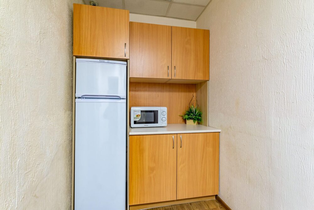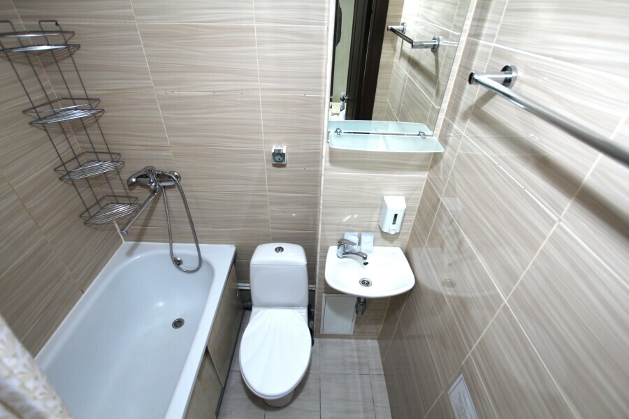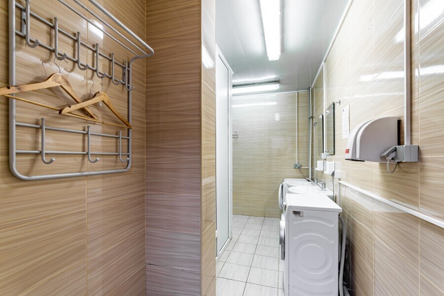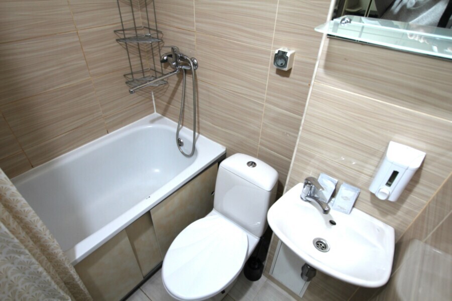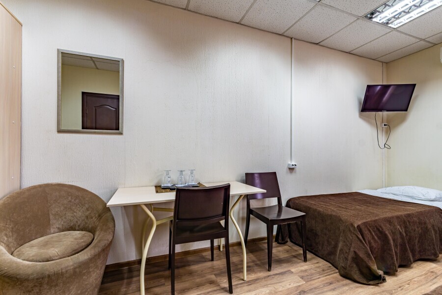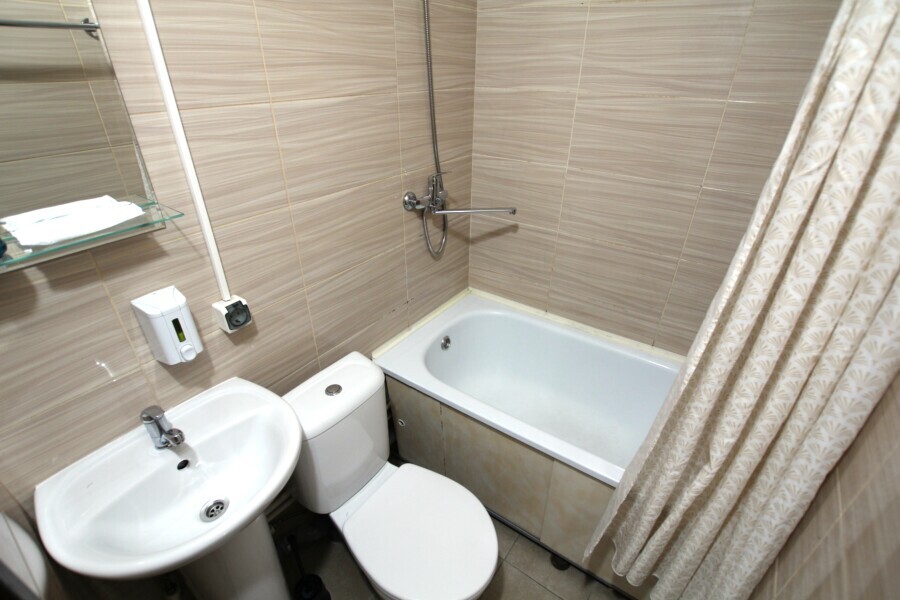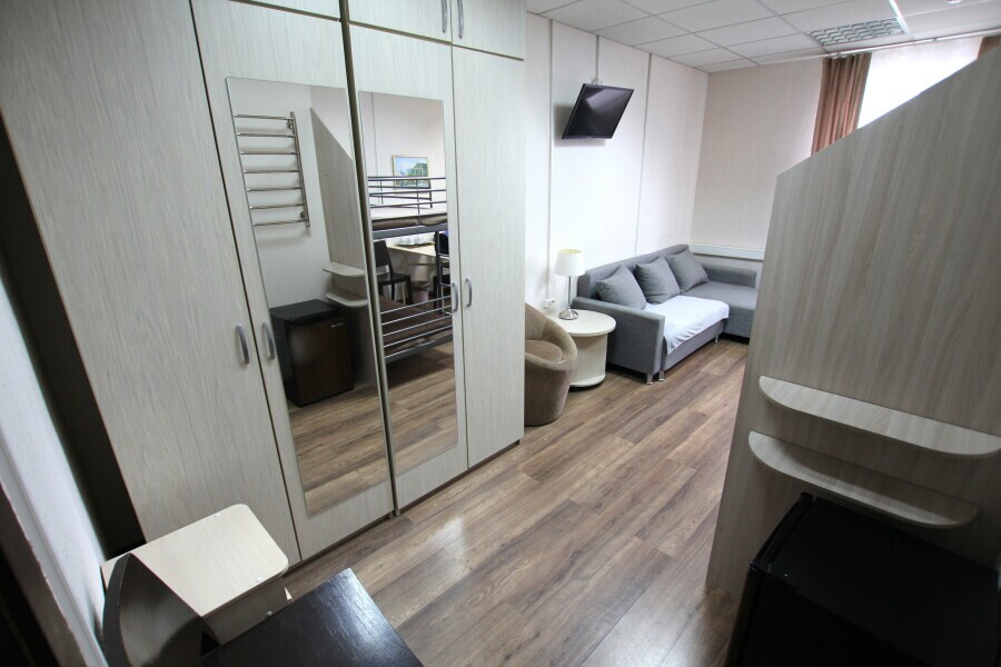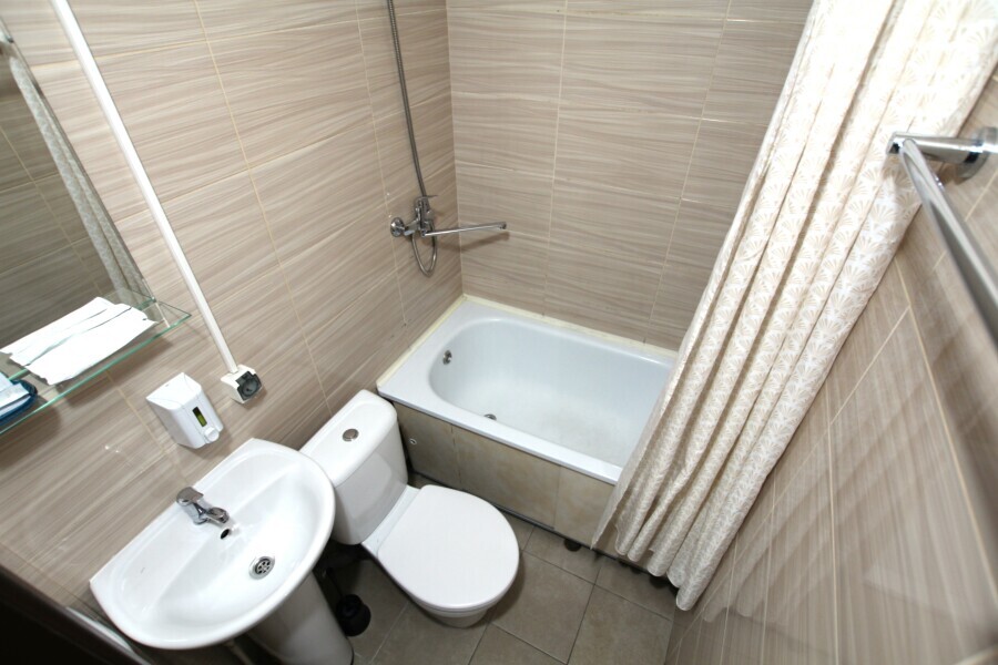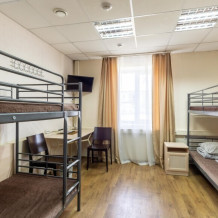 Просторный номер для трех человек. В номере имеются три односпальные кровати, с ортопедическими матрасами, для комфортного сна. Стол для приема пищи, телевизор, кондиционер, сушилка для белья, гладильная доска. Шкафы для размещения вещей. Душ и туалет в номере. На этаже имеется микроволновка, холодильник и кулер с горячей и холодной водой.