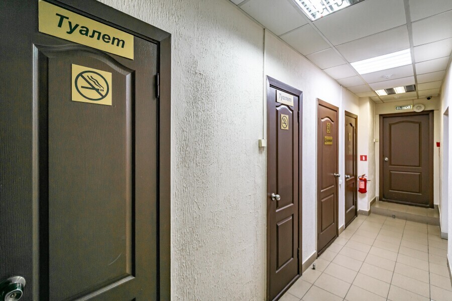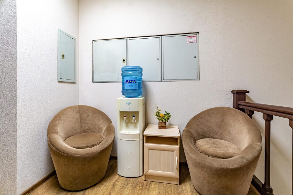 Кулер, микроволновка, холодильник, душ и туалет на этаже.