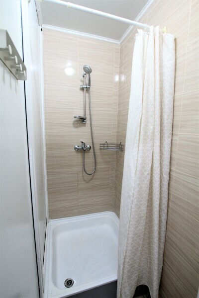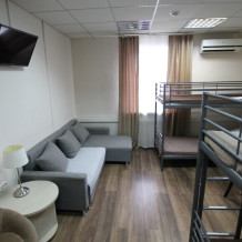 Просторный номер для семьи с детьми. В номере имеются две двухярусные кровати и диван двухспальный. Стол для приема пищи, телевизор. кондиционер, сушилка для белья, гладильная доска. Шкафы для размещения вещей. Душ и туалет в номере.