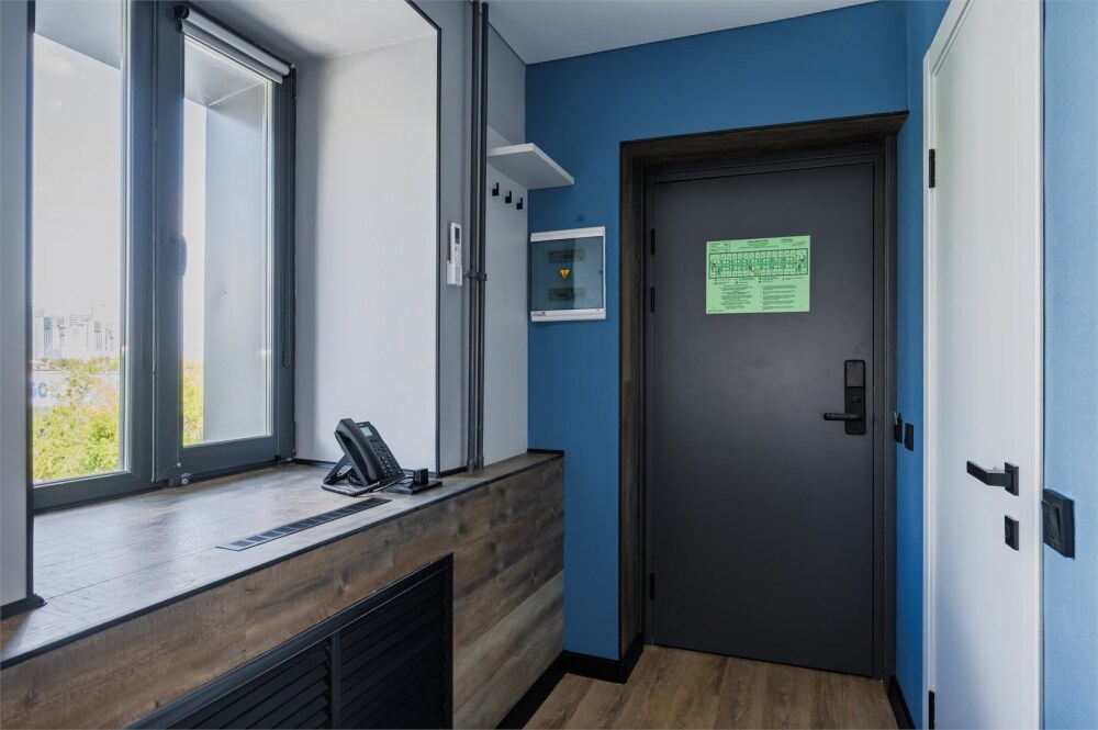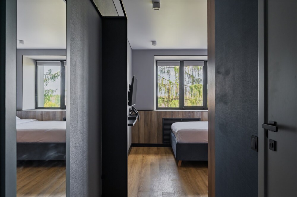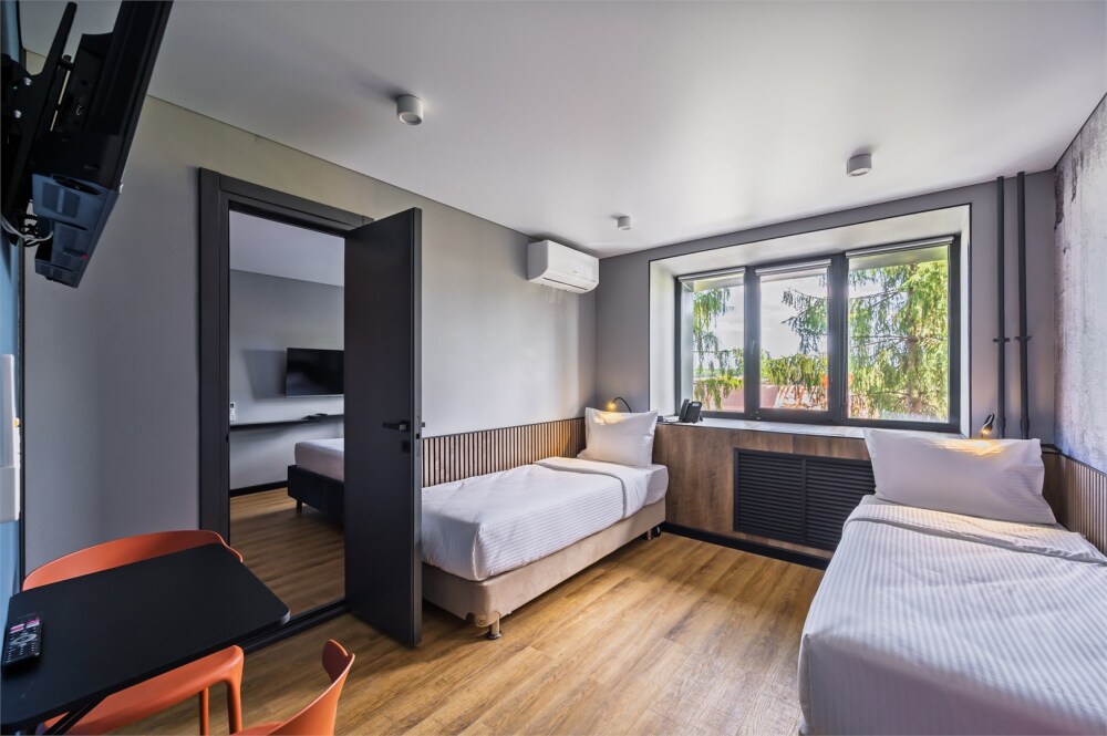 Оснащение соединенного номера: 2 кровати single (с возможностью сдвинуть в одну), 1 кровать kingsize, ортопедические матрасы, шкафы, закрытая система хранения вещей, рабочая зона, кухонная зона (холодильник, микроволновая печь, чайник, стиральная машина), 2 санузла, ванна, набор посуды и столовых приборов, набор гигиенических принадлежностей, полотенца, кондиционер, 2 телевизора 43 дюйма, сверхбыстрый wi-fi, ультрасовременное освещение, шторы блэкаут.
