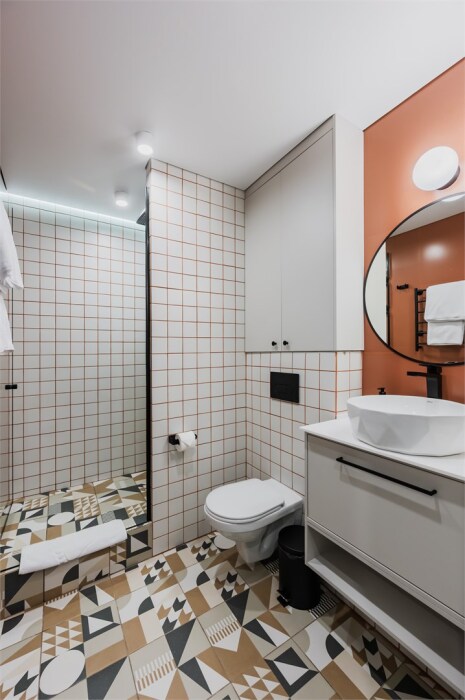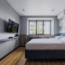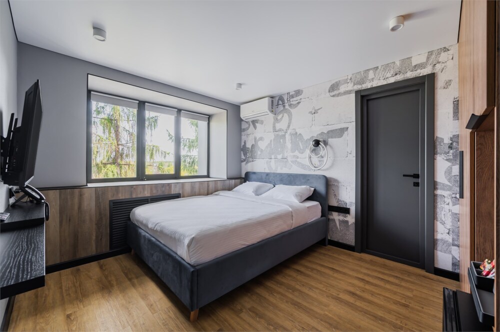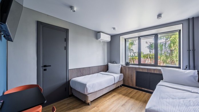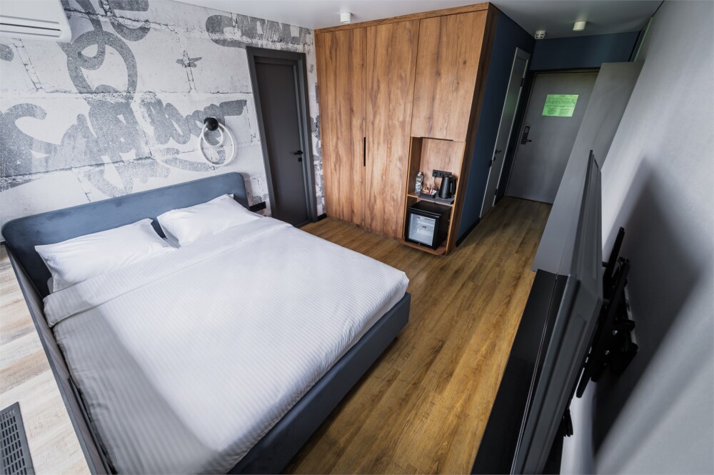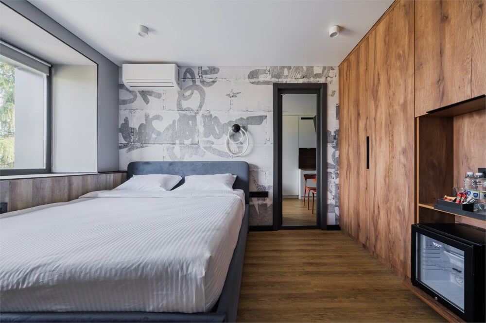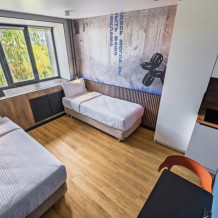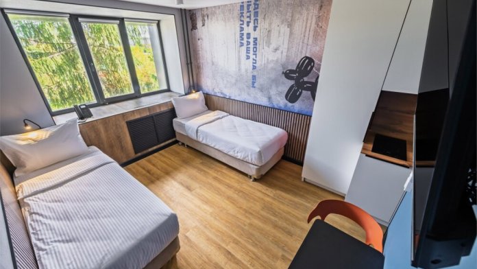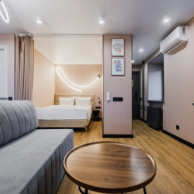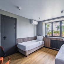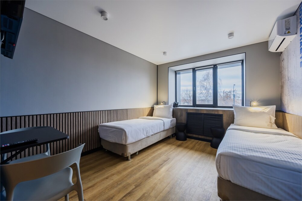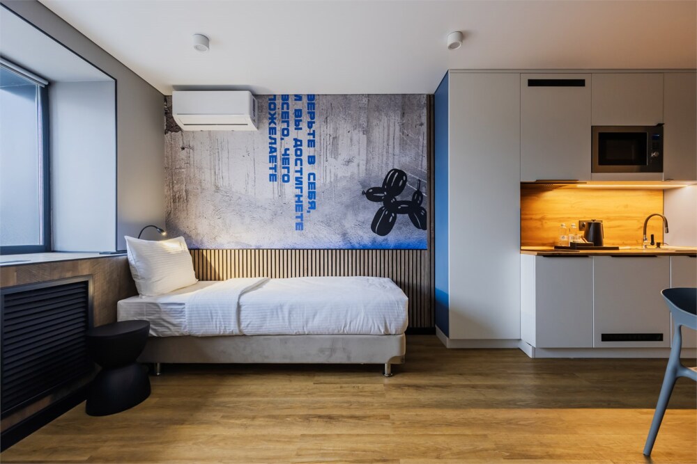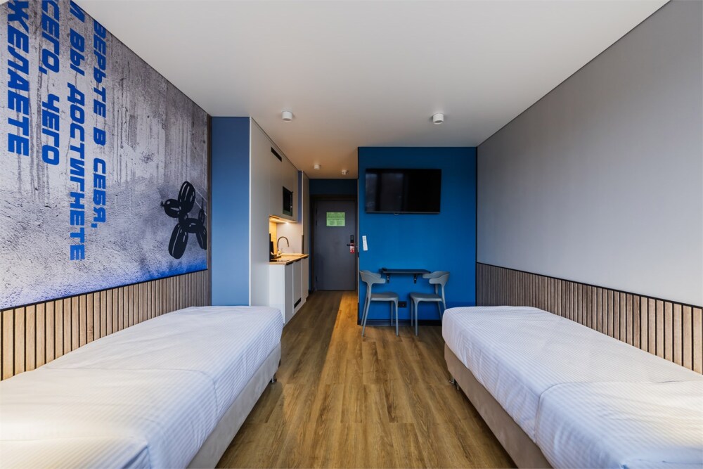 Оснащение номера: 2 кровати Single (с возможностью сдвинуть в одну); Ортопедические матрасы Ascona; Закрытая система хранения вещей; Рабочая зона; Кухонная зона (холодильник, микроволновая печь, чайник, стиральная машина); Набор посуды и столовых приборов; Полотенца; Кондиционер; Телевизор 43 дюйма; Несколько сценариев освещения.