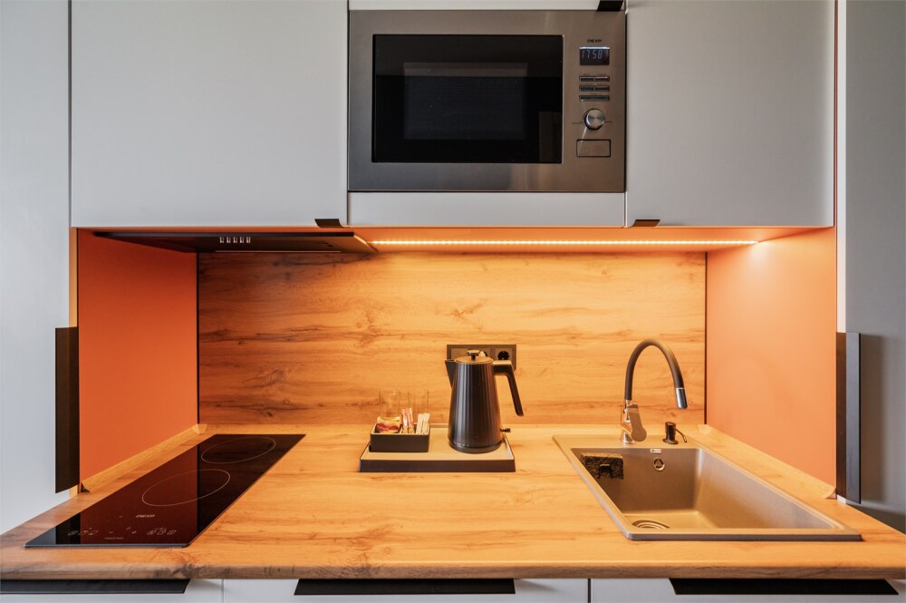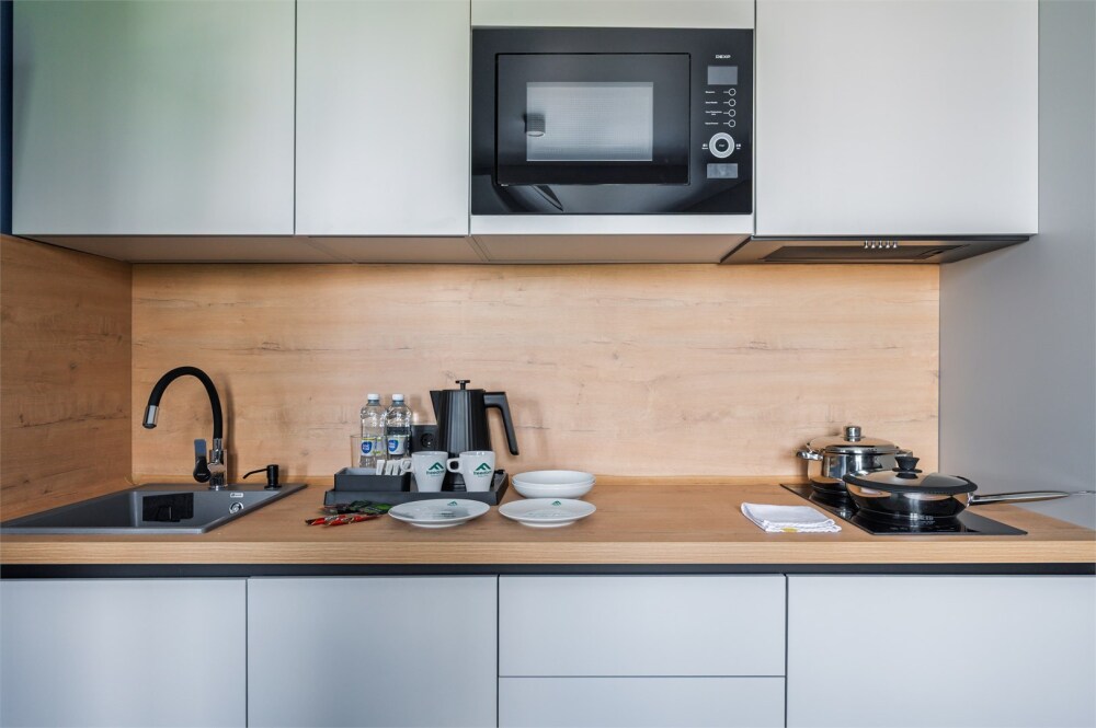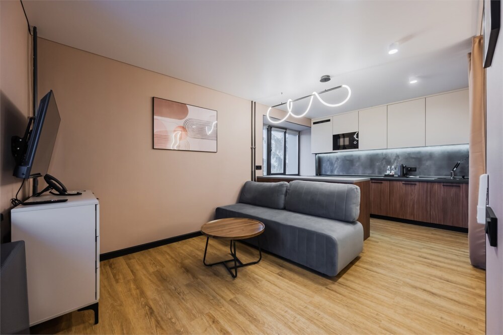 Оснащение номера: двуспальный раскладной диван, закрытая система хранения вещей, рабочая зона, обширная кухонная зона (холодильник, микроволновая печь, чайник), набор посуды и столовых приборов, полотенца, кондиционер, телевизор 32 дюйма.