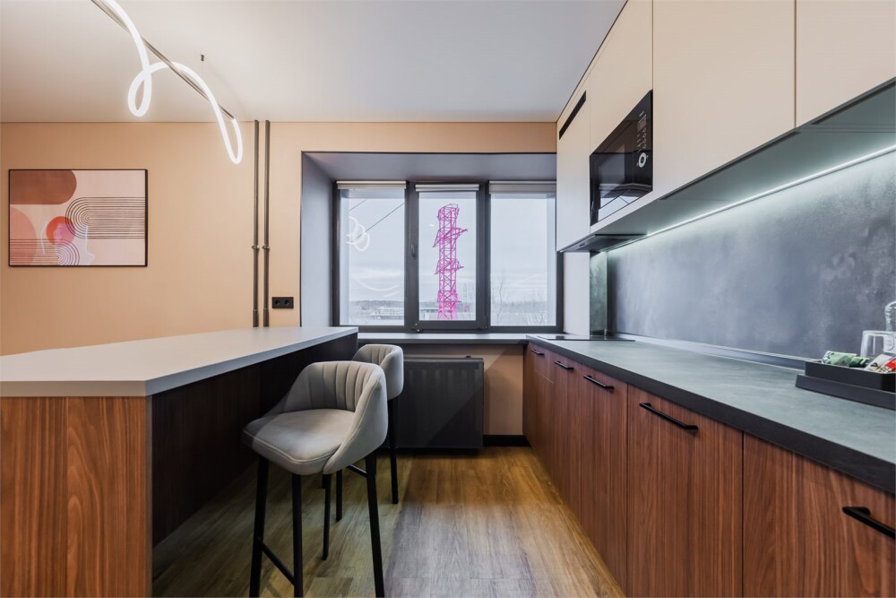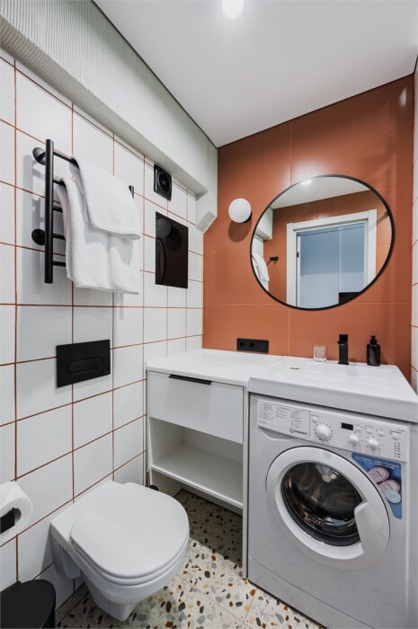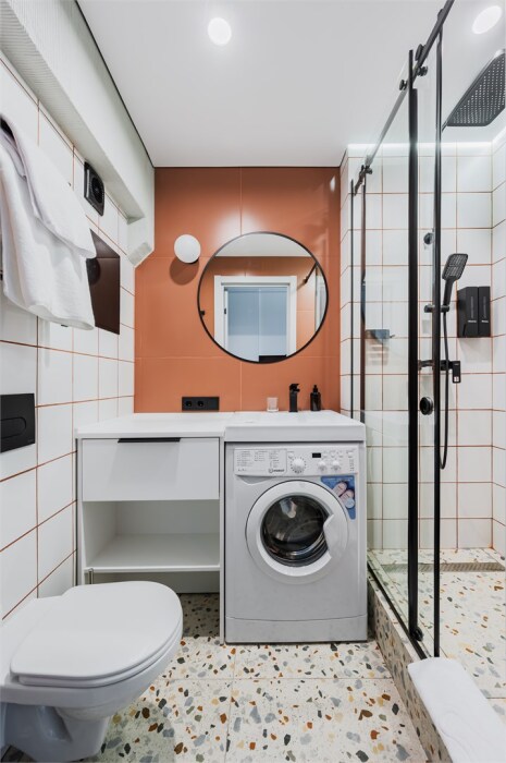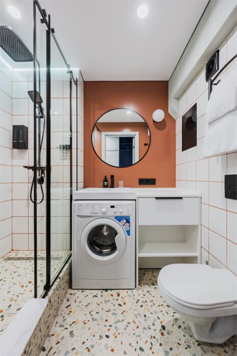 Оснащение номера: закрытая система хранения вещей, рабочая зона, обширная кухонная зона (холодильник, микроволновая печь, чайник), набор посуды и столовых приборов, полотенца, кондиционер, телевизор 43 дюйма, стиральная машина.