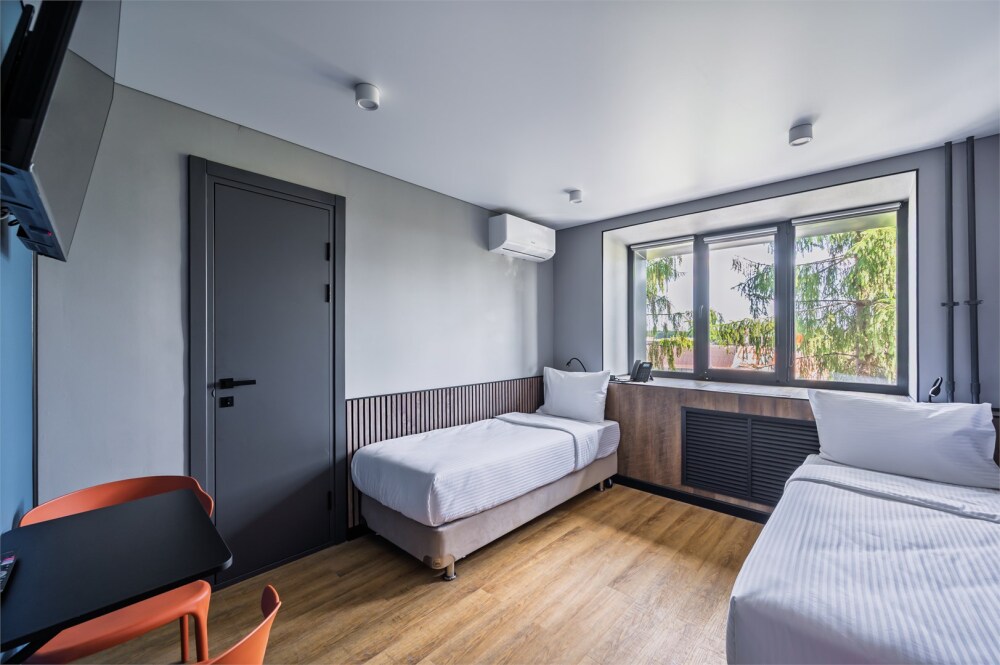 Оснащение номера: 2 кровати single (с возможностью сдвинуть в одну), ортопедические матрасы ascona, закрытая система хранения вещей, рабочая зона, кухонная зона (холодильник, микроволновая печь, чайник, стиральная машина), набор посуды и столовых приборов, полотенца, кондиционер, телевизор 43 дюйма.