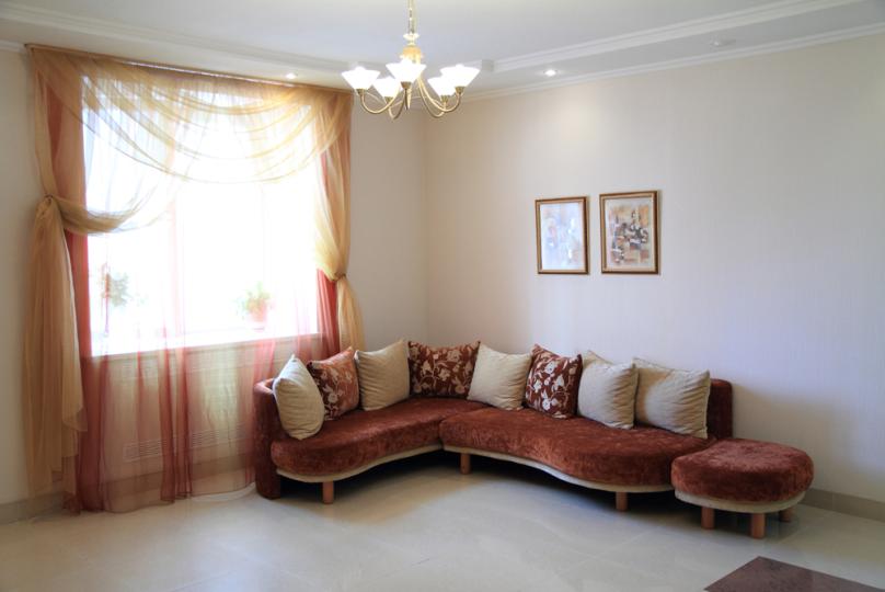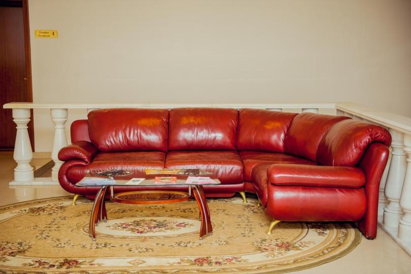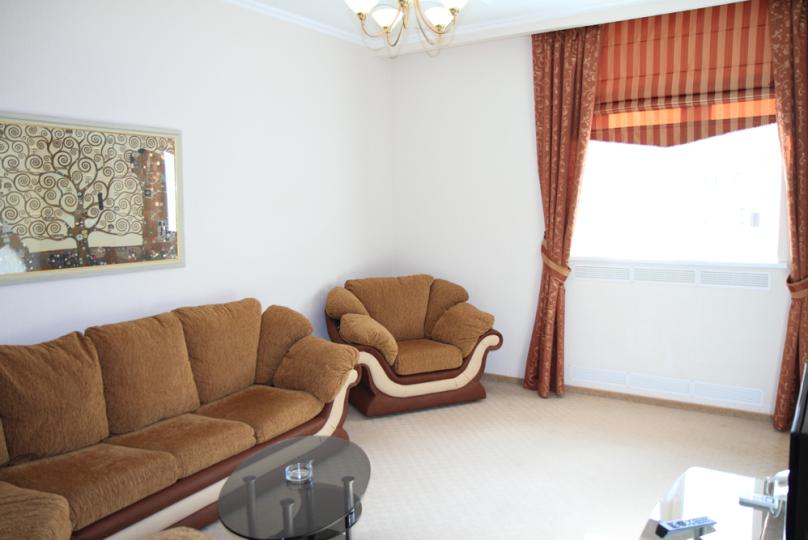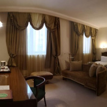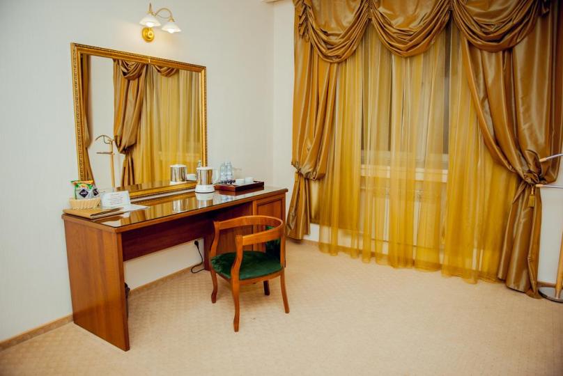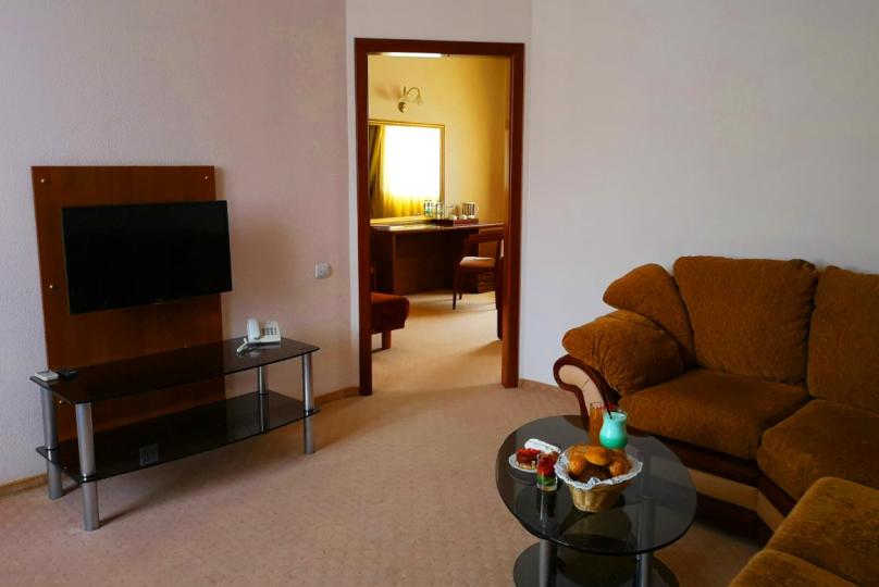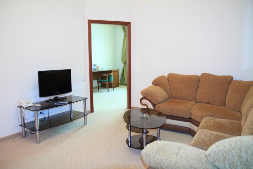 Номер категории Люкс с двумя полутораспальными кроватями. Гостиная: трехместный раскладной диван и кресло, журнальный столик, телефон, большой плазменный телевизор, кондиционер, телефон. Спальная комната: тумбочки, универсальный стол фабрики Tomasella (Италия), мини-бар.
