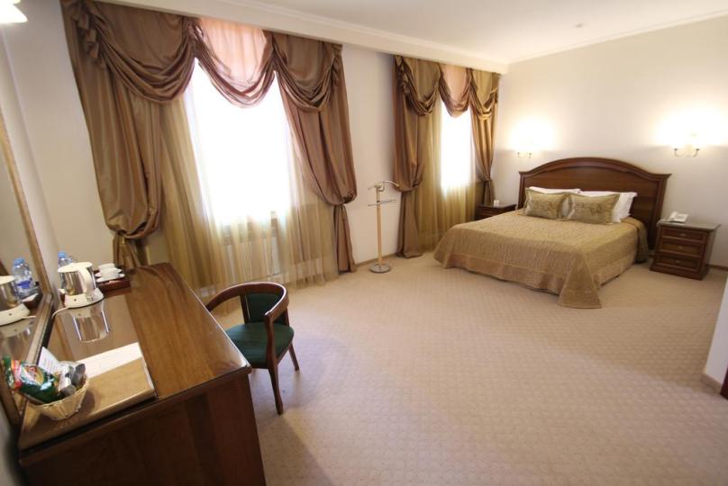 Стандартный двухместный номер с одной двуспальной кроватью, зеркальный шкаф-купе для одежды и багажа, сейф, мебель фабрики Tomasella (Италия), универсальный стол, мини-бар, телевизор-слим Samsung, телефон, ванная с банными принадлежностями и аксессуарами, фен, кондиционер.