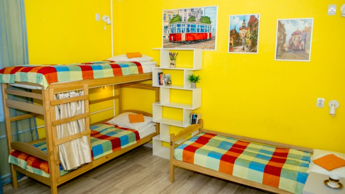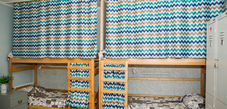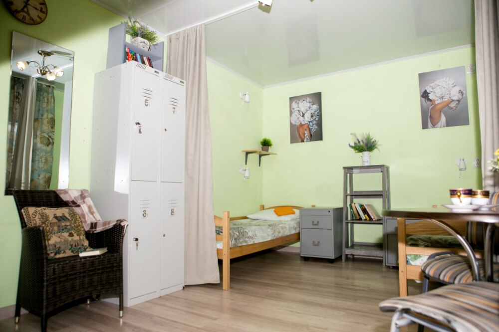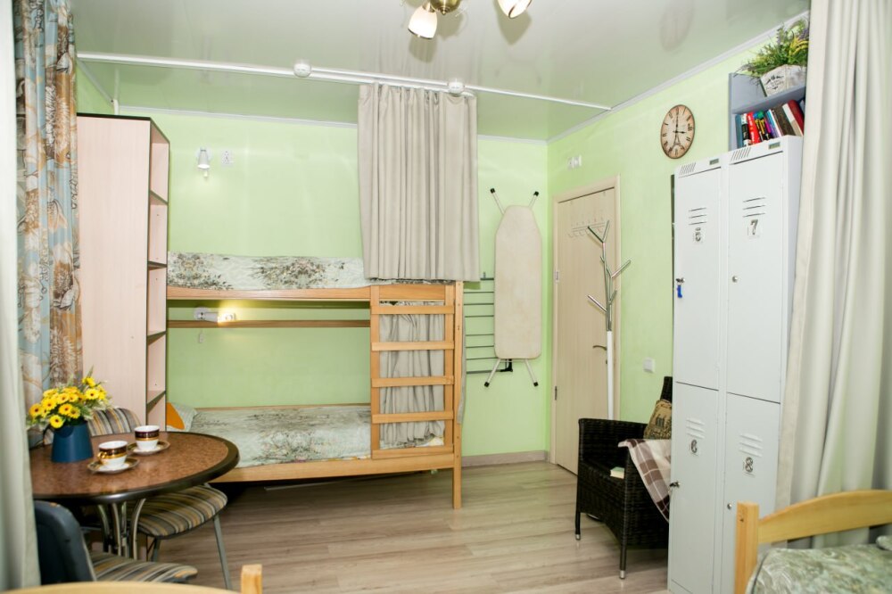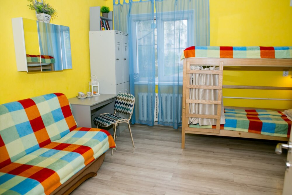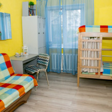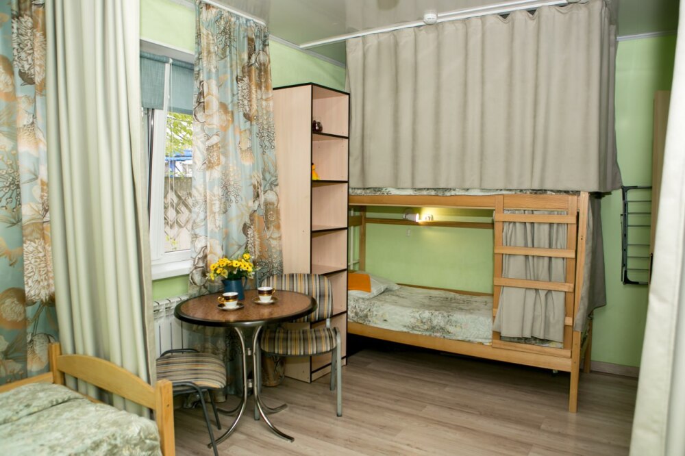 Отдельная светлая, уютная комната. В комнате удобные высокие матрасы, большой раскладывающийся диван, тумбочки, стол и металлические, запирающиеся шкафчики. У нас все продумано для комфортного проживания, чтобы гости чувствовали себя как дома. Зеркало, фен, розетки и светильники над каждым спальным местом создают удобство и комфорт. Выдаются банные полотенца. Здесь будет удобно гостить и семейным парам, и гостям, кто хочет пожить один в комнате.