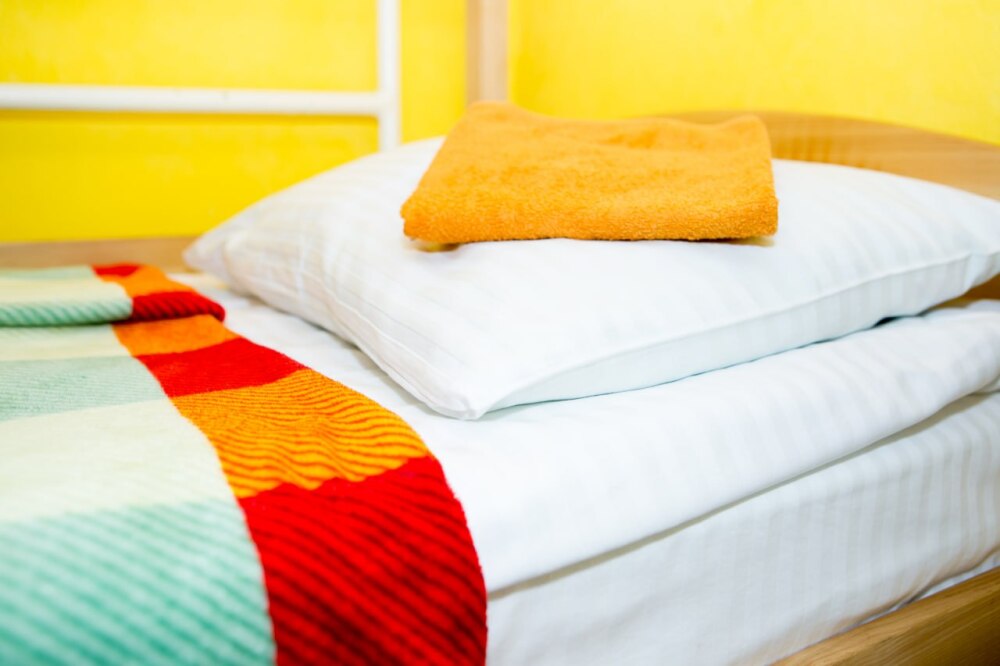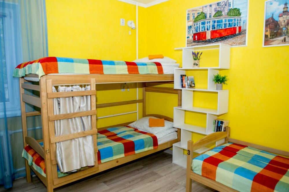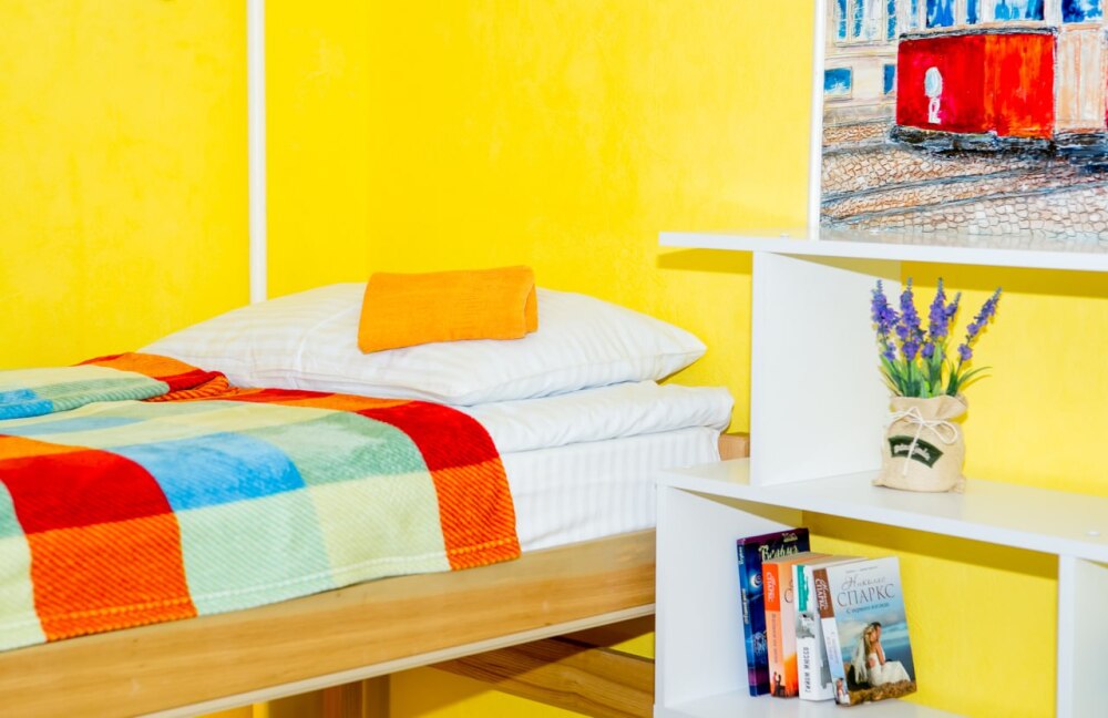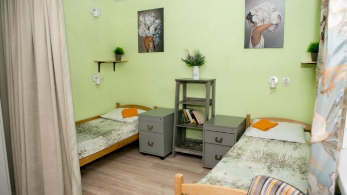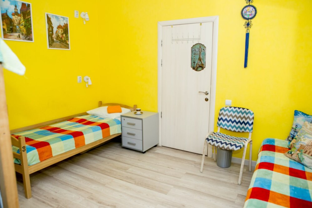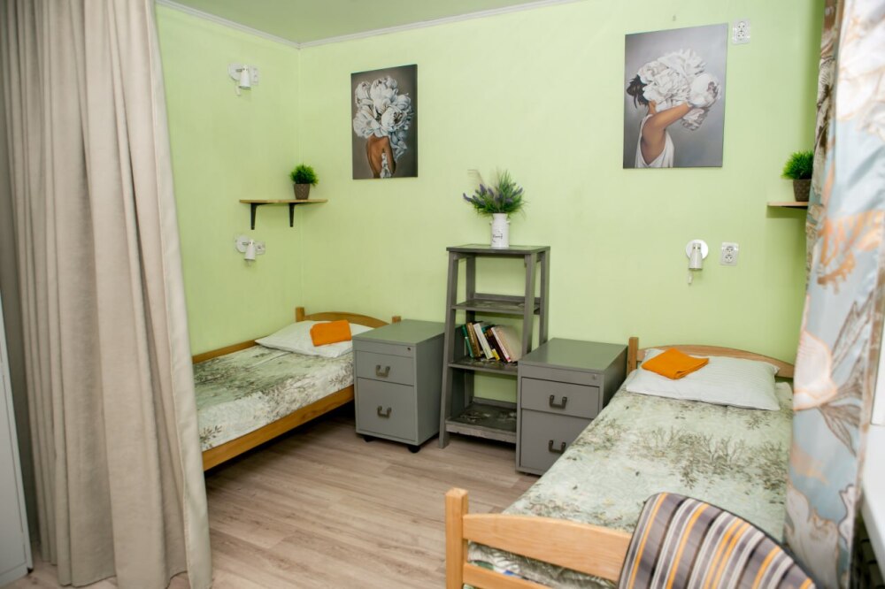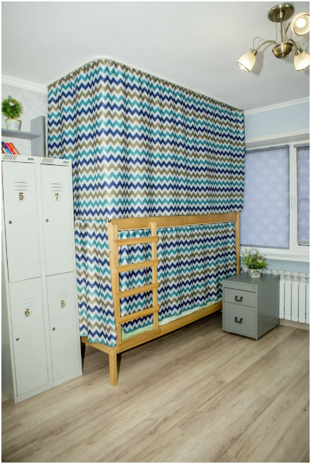 Спальные места в квартире. Чистые и уютные комнаты, качественный ремонт: стеклопакеты, кровати с ортопедическими матрасами, индивидуальные лампы для чтения, тумбочки, полочки, столы для занятия или чаепития, стулья, индивидуальные шкафчики для вещей, бесплатный Wi-Fi, белье и полотенца.