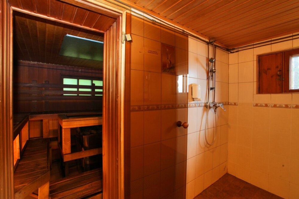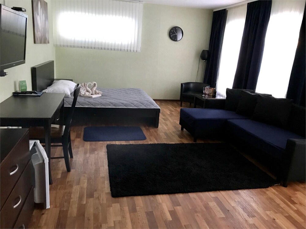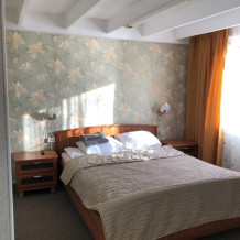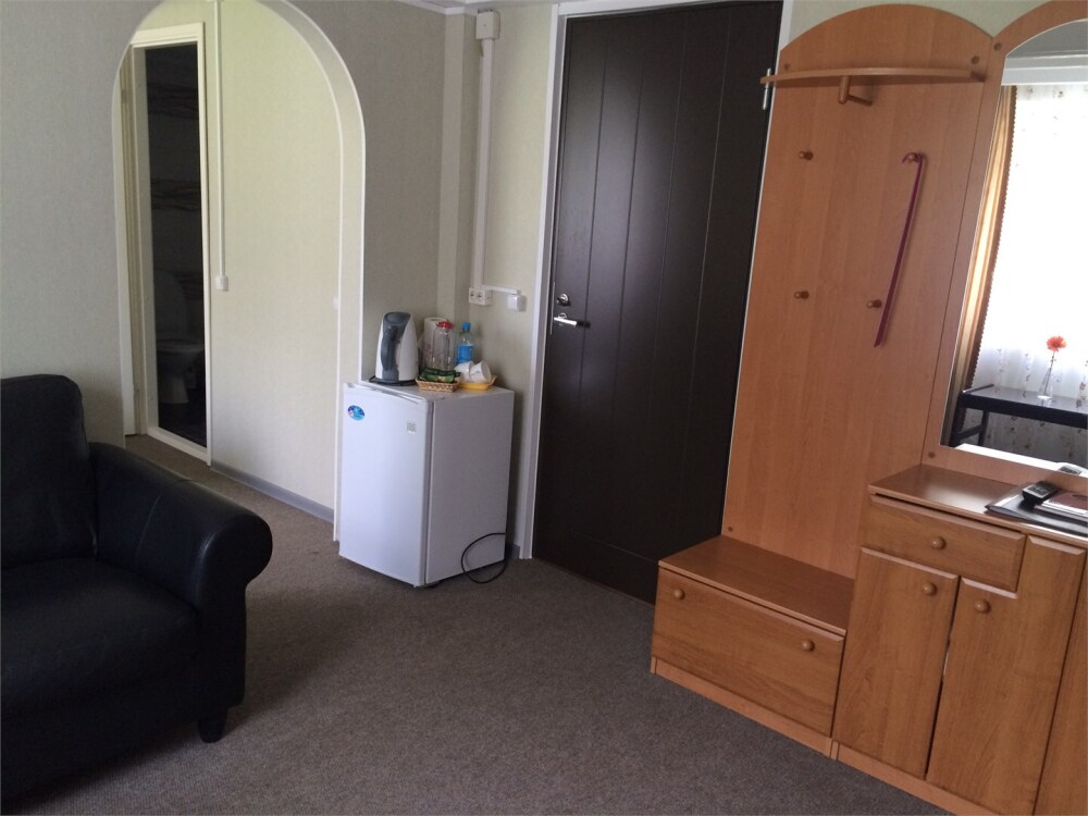 В номере: гостиная совмещенная с кухней, минимальный набор посуды, холодильник, микроволновая печь, электрочайник, цветной телевизор, 2 санузла, душ на домик.