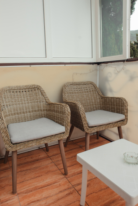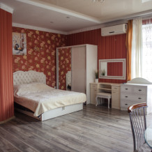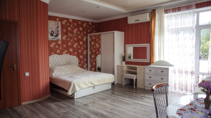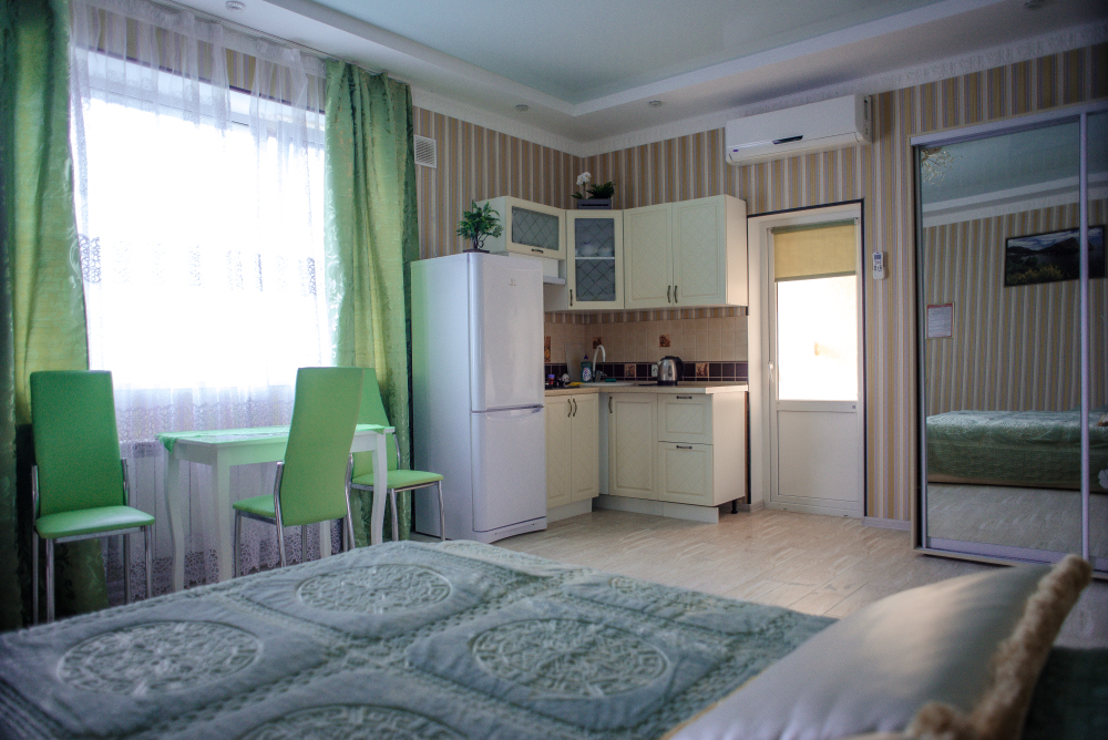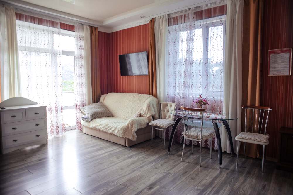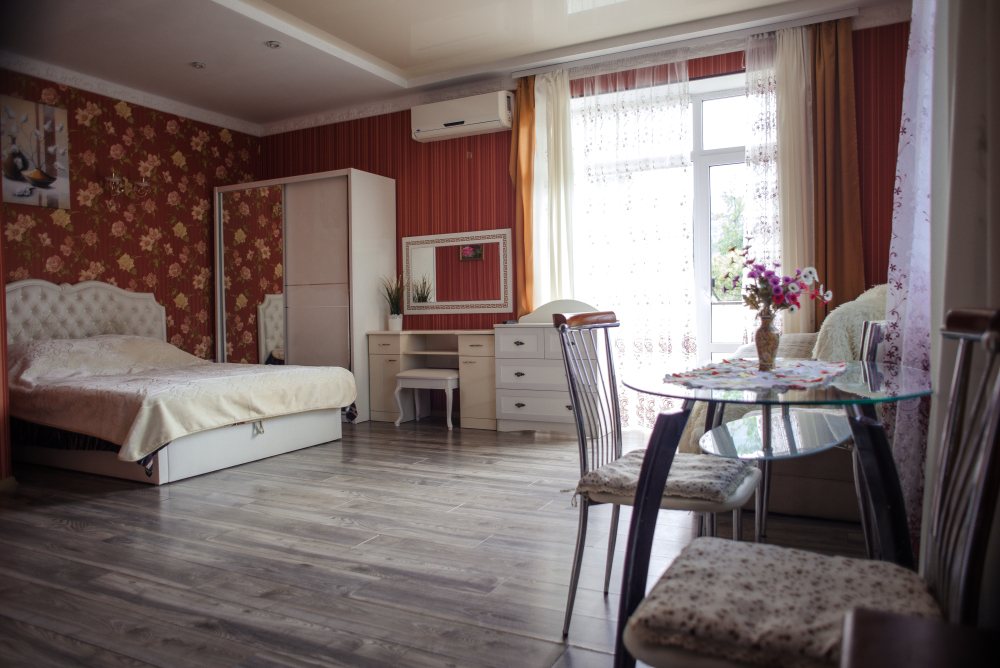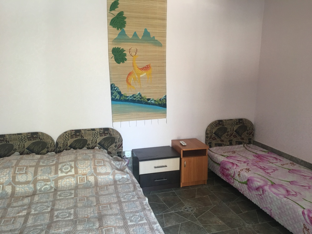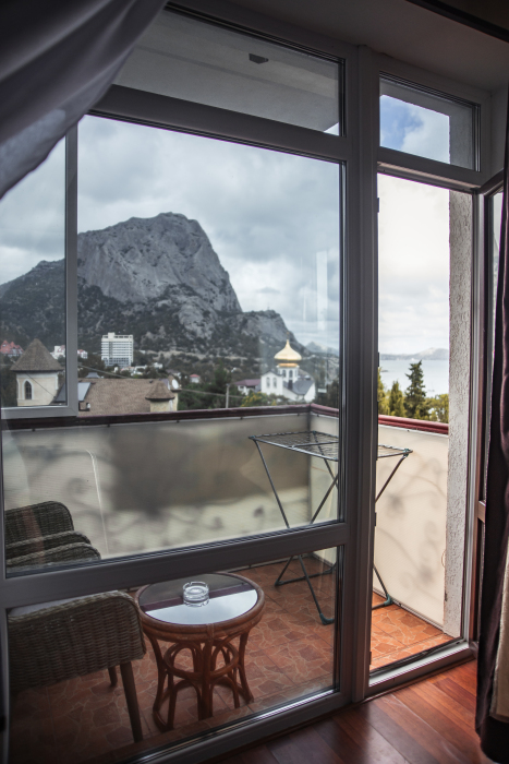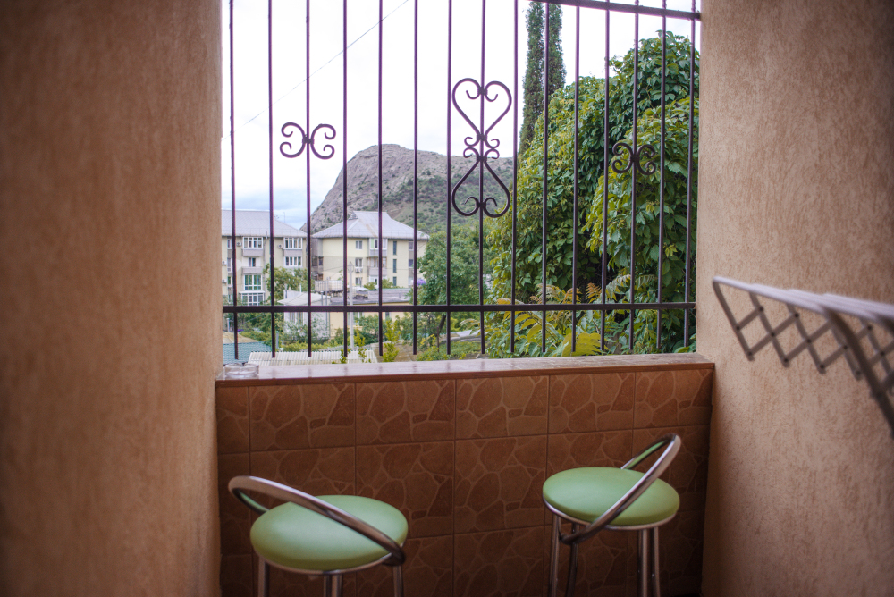 Все номера оборудованы кондиционером, холодильником, чайником, сейфом, феном и имеют выход на балкон, с которого можно наблюдать за крымскими красотами и морем. В просторном дворе есть зона отдыха с телевизором, стол с плетеными креслами, дополнительная кухня на свежем воздухе.