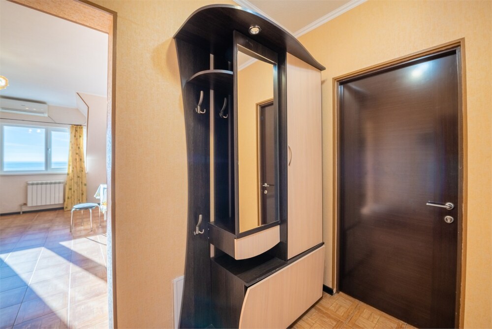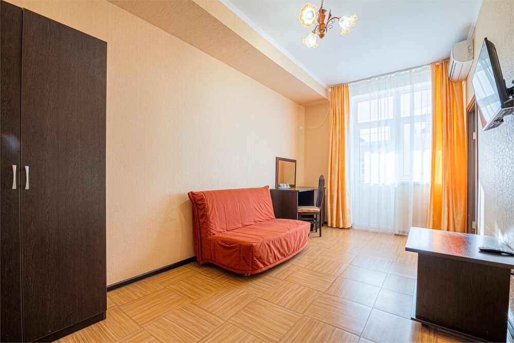 Просторный однокомнатный номер с двуспальной кроватью, раскладным диваном, кухней и балконом.