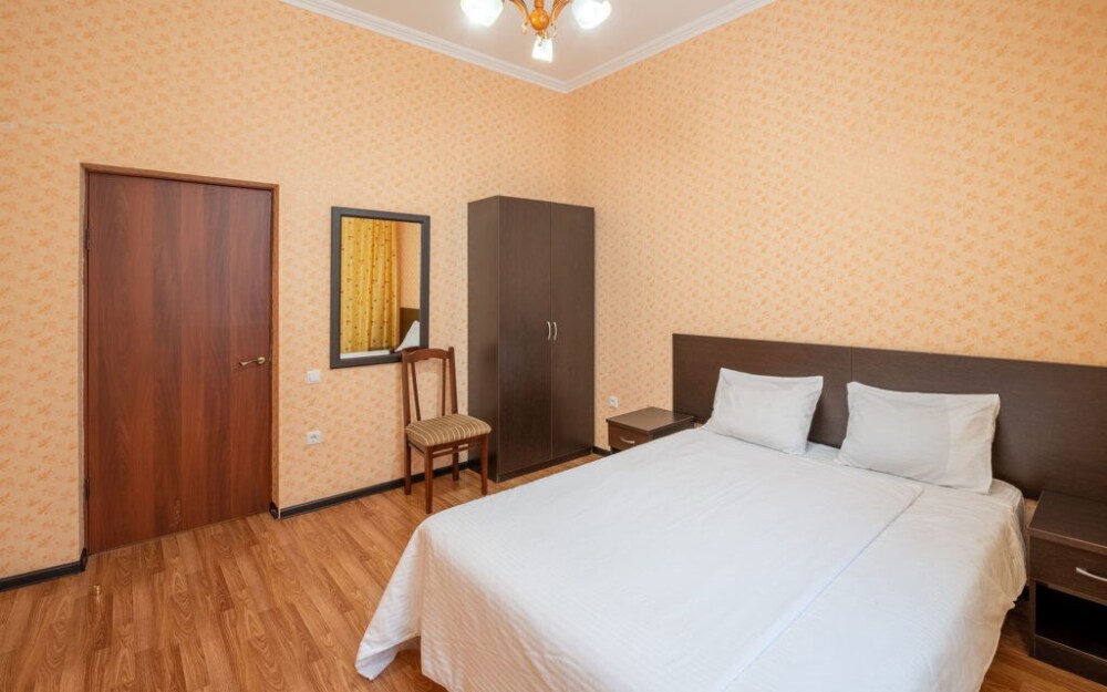 Уютный однокомнатный номер с двуспальной кроватью или двумя односпальными кроватями и креслом-кроватью, либо раскладной кроватью.