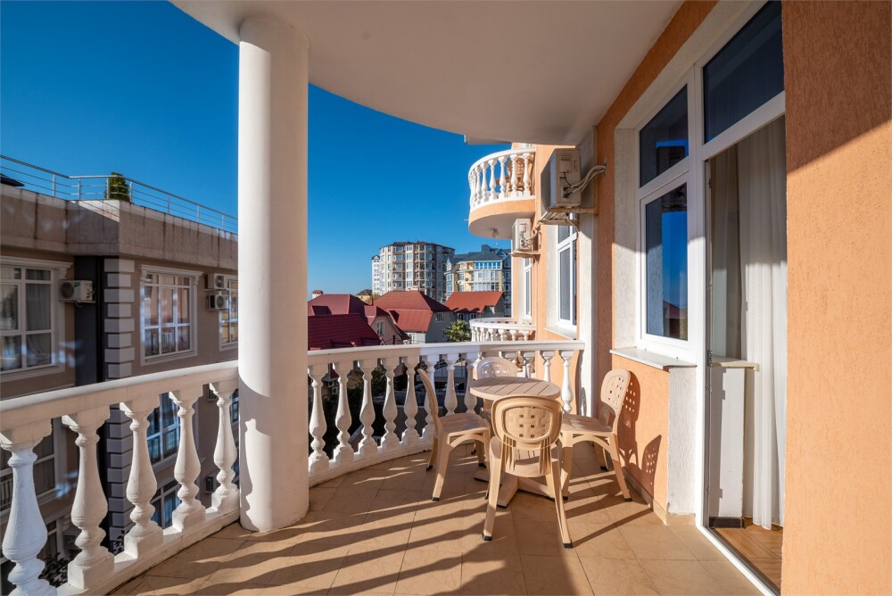 Уютный номер с двуспальной кроватью или двумя односпальными кроватями, креслом-кроватью, либо раскладной кроватью и балконом с видом на море.