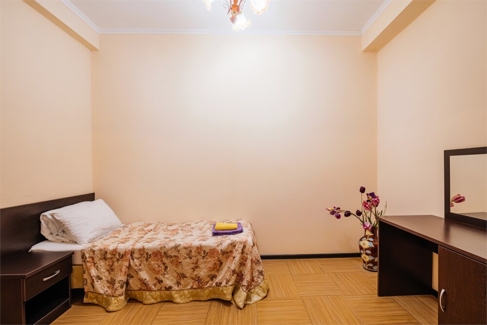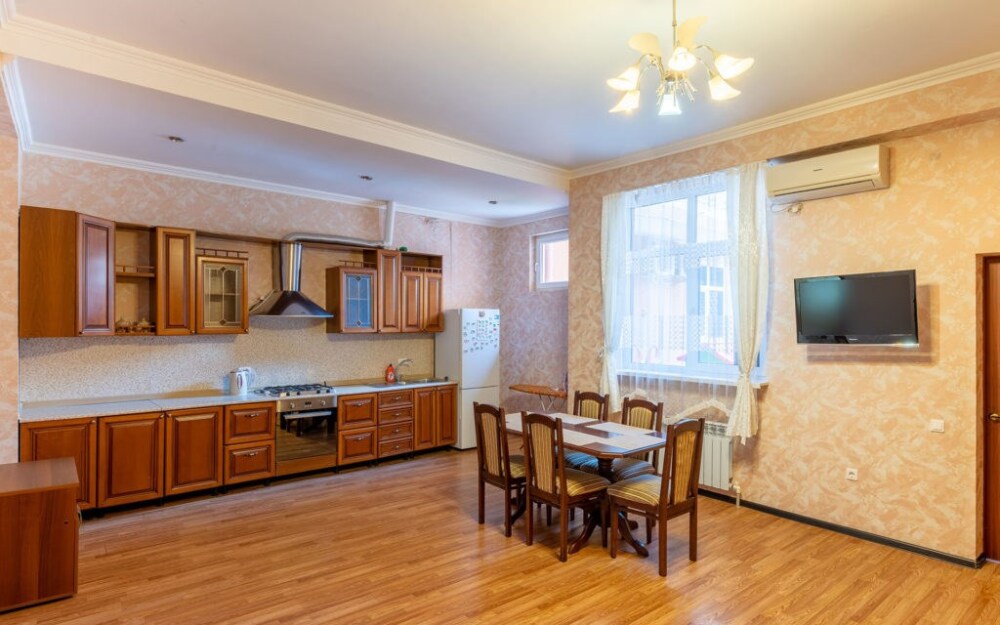 Просторный трехкомнатный номер с двумя двуспальными кроватями, двухместным раскладным диваном, кухней и балконом.