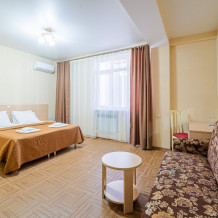 Комфортный однокомнатный номер с двуспальной кроватью, двухместным раскладным диваном и балконом.