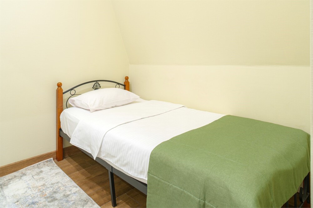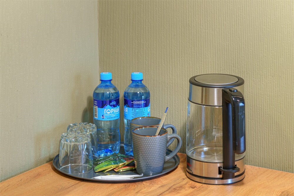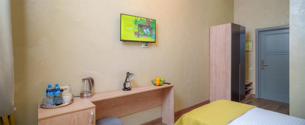 Уютный однокомнатный номер, состоящий из небольшой прихожей и спальной комнаты. В номере удобная современная мебель, широкая кровать, а также организованное рабочее пространство с письменным столом. В каждом номере имеются гигиенические принадлежности и банные комплекты (халаты и тапочки). Подходит для размещения 1-2 человек.