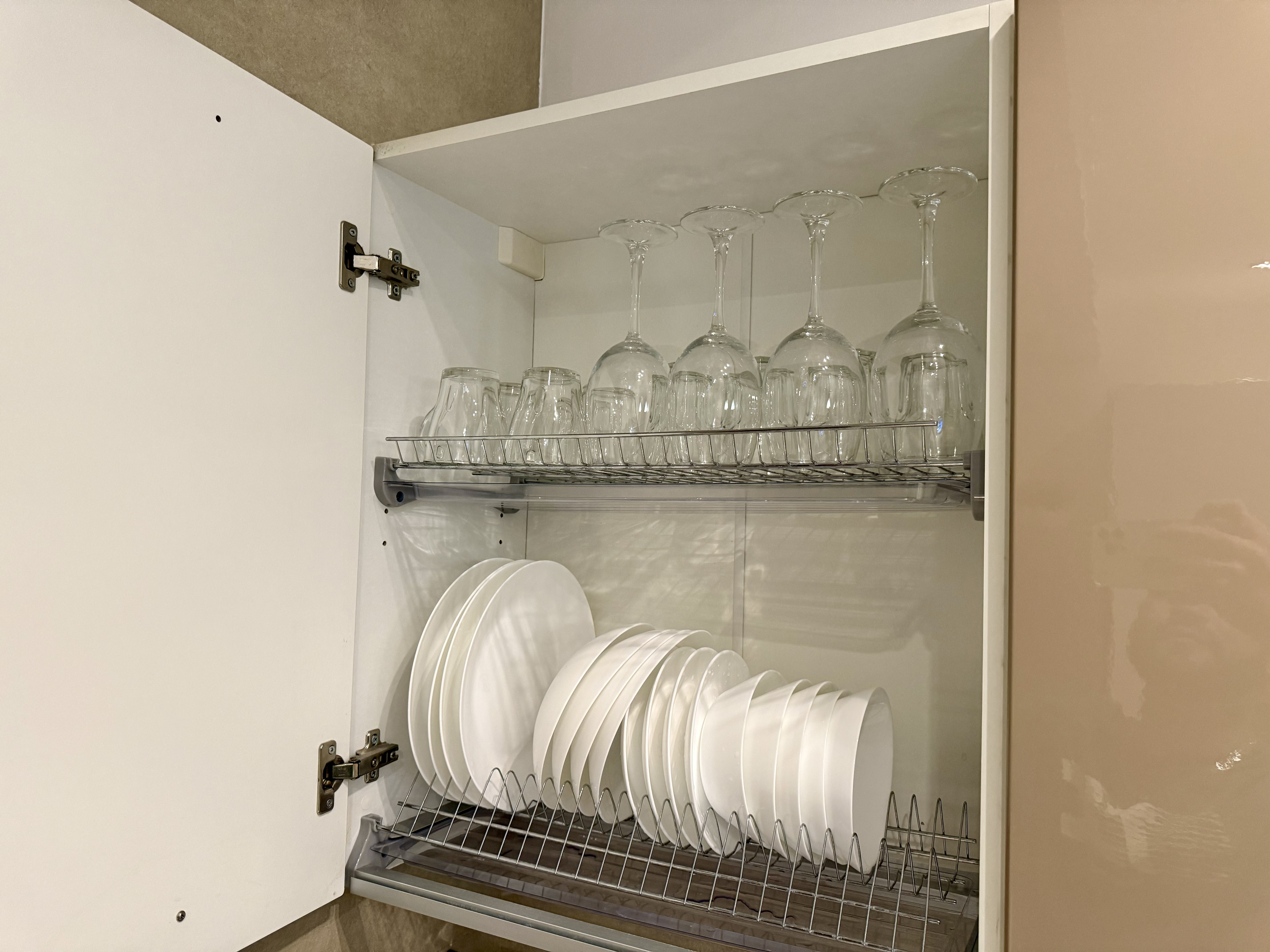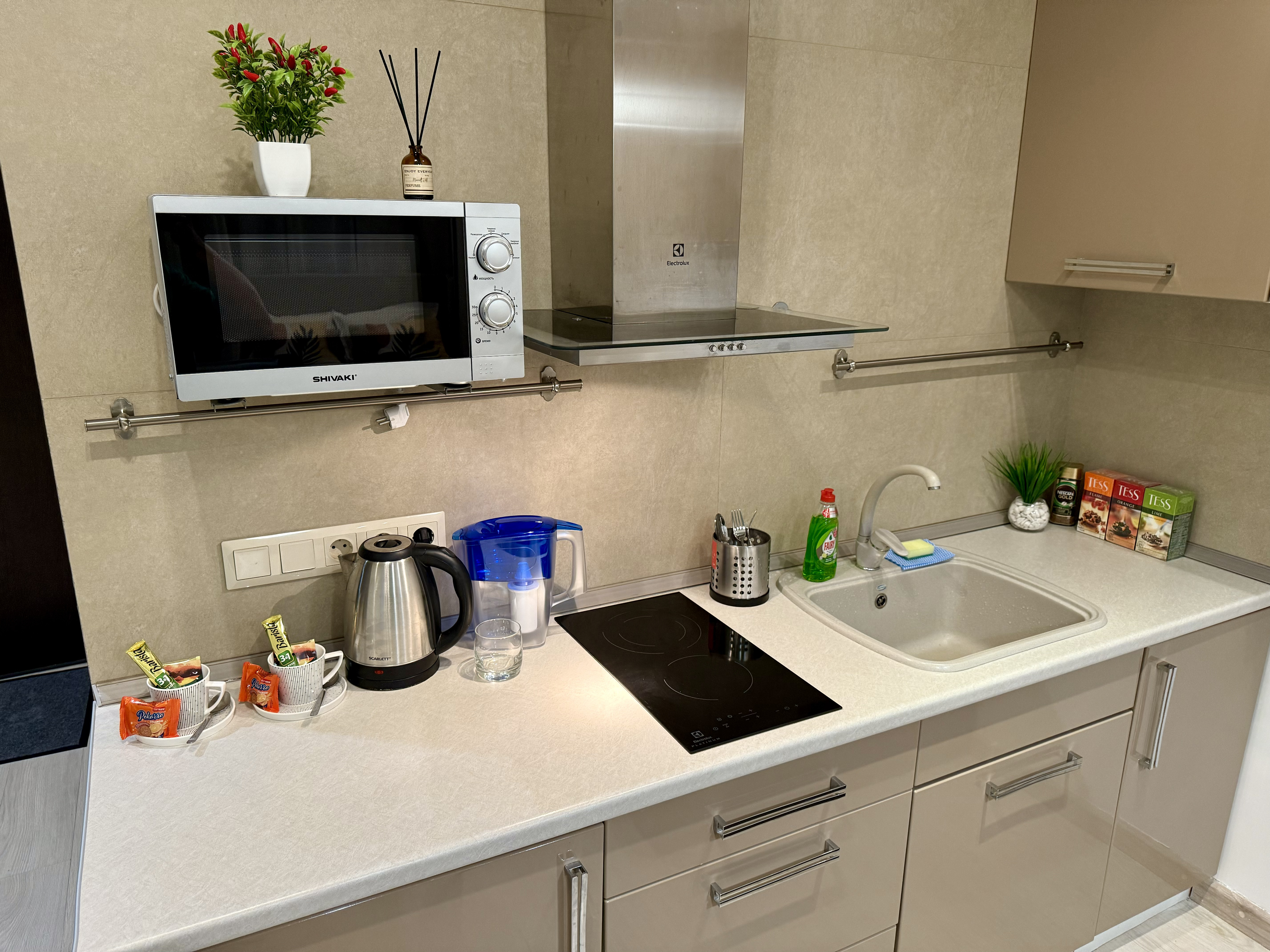 - На кухне вся техника: чайник, СВЧ, плита, духовка, холодильник.