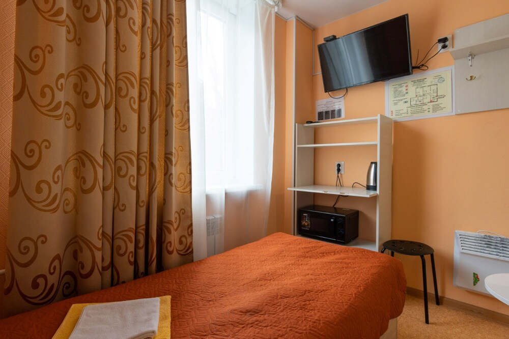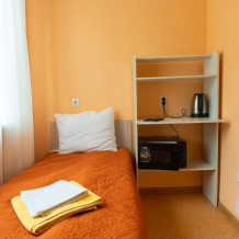 В милом, уютном номере находится одноместная кровать с удобным ортопедическим матрасом, расположенная напротив плазменного телевизора. Для Вашего комфорта в номере имеется чайник и микроволновая печь.