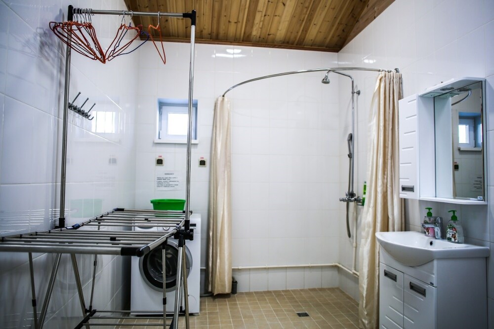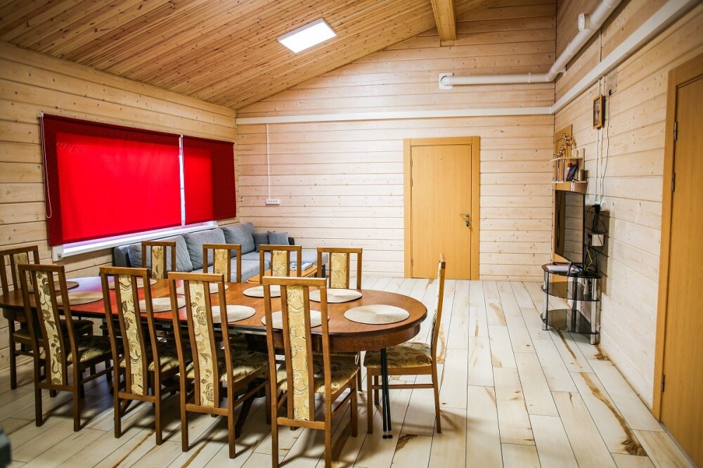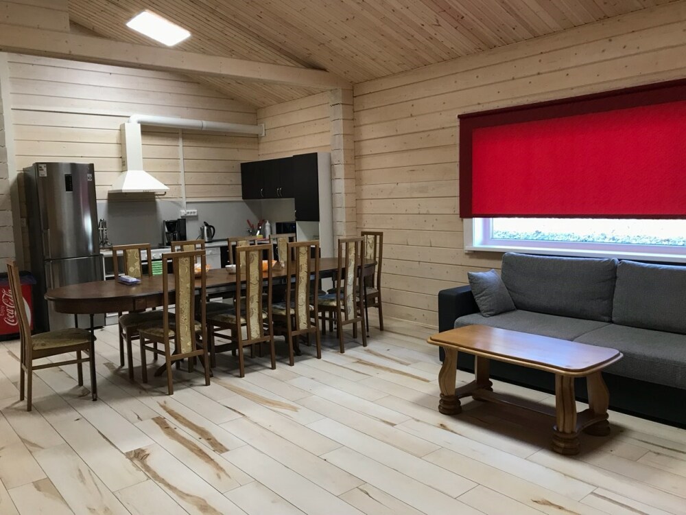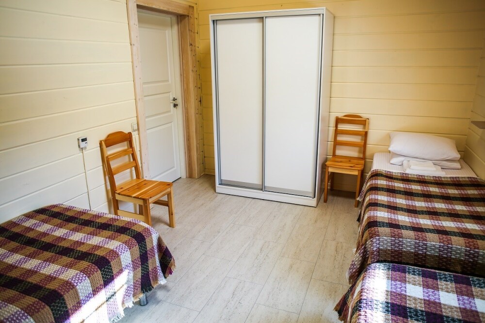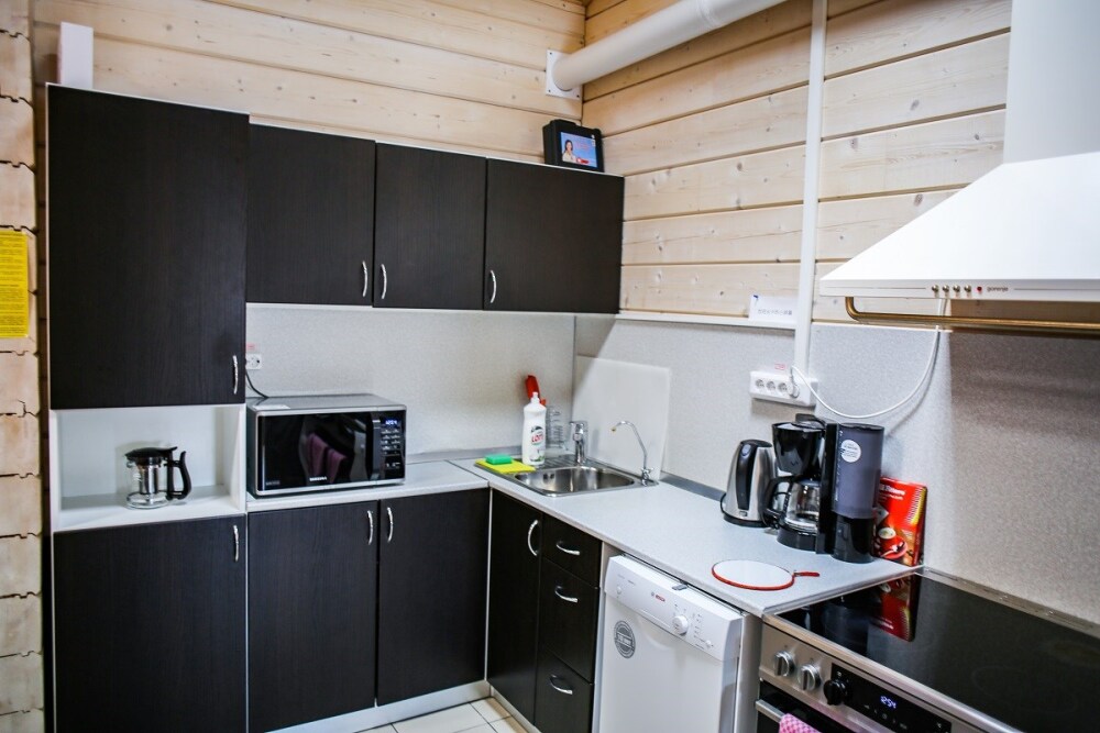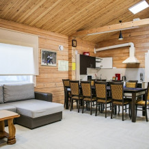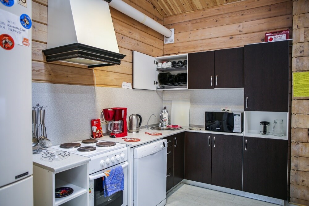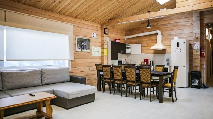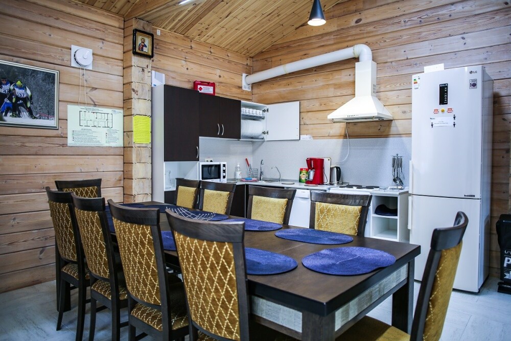 Дома оснащены уютной гостиной комнатой с диваном, большим обеденным столом, телевизором SMART, кухонным уголком, оборудованным бытовой техникой (плитой, холодильником, посудомоечной машиной, микроволновой печью, чайником, кофеваркой, кухонными принадлежностями, посудой), тремя душевыми комнатами совмещенными с сан. узлами, стиральной и сушильной машиной. В каждом коттедже индивидуальная система отопления, система “теплый пол”, а также сервисная комнатой для хранения и подготовки спортивного инвентаря. Бесплатный доступ в интернет (Wi-Fi).