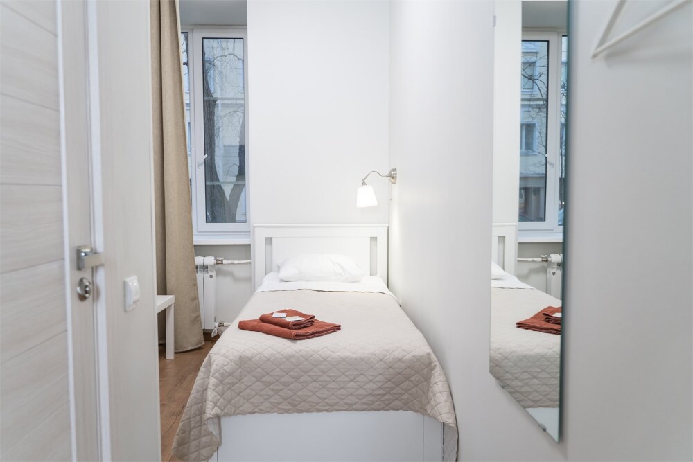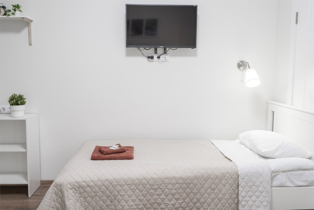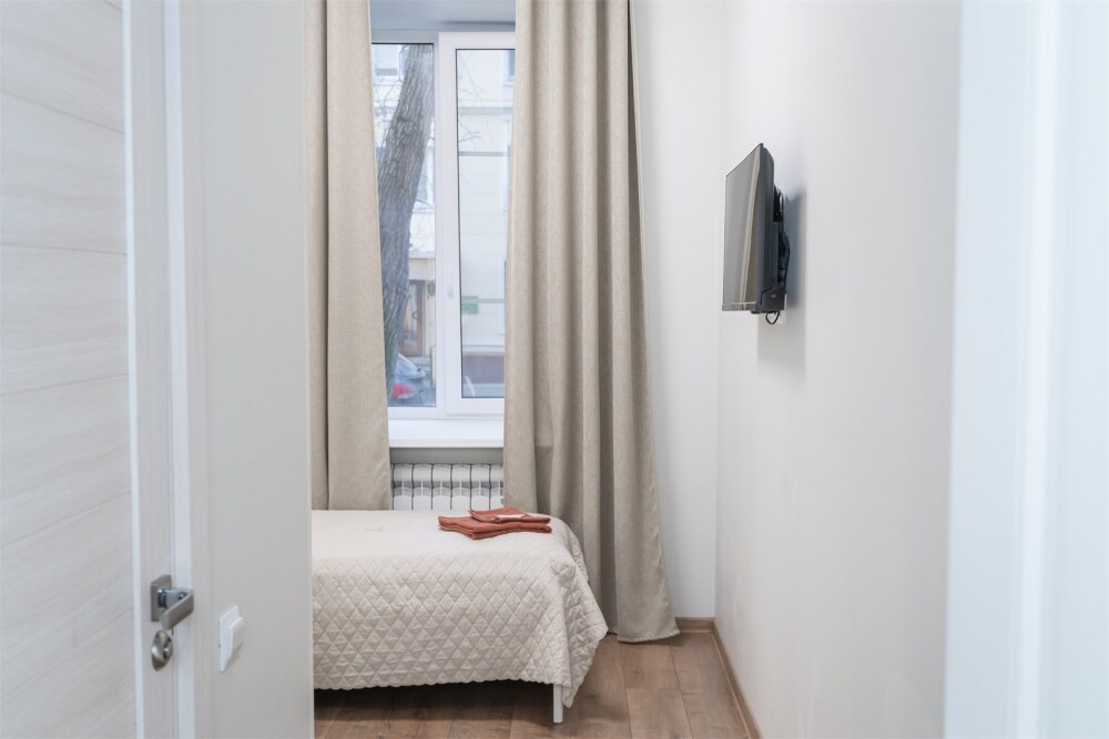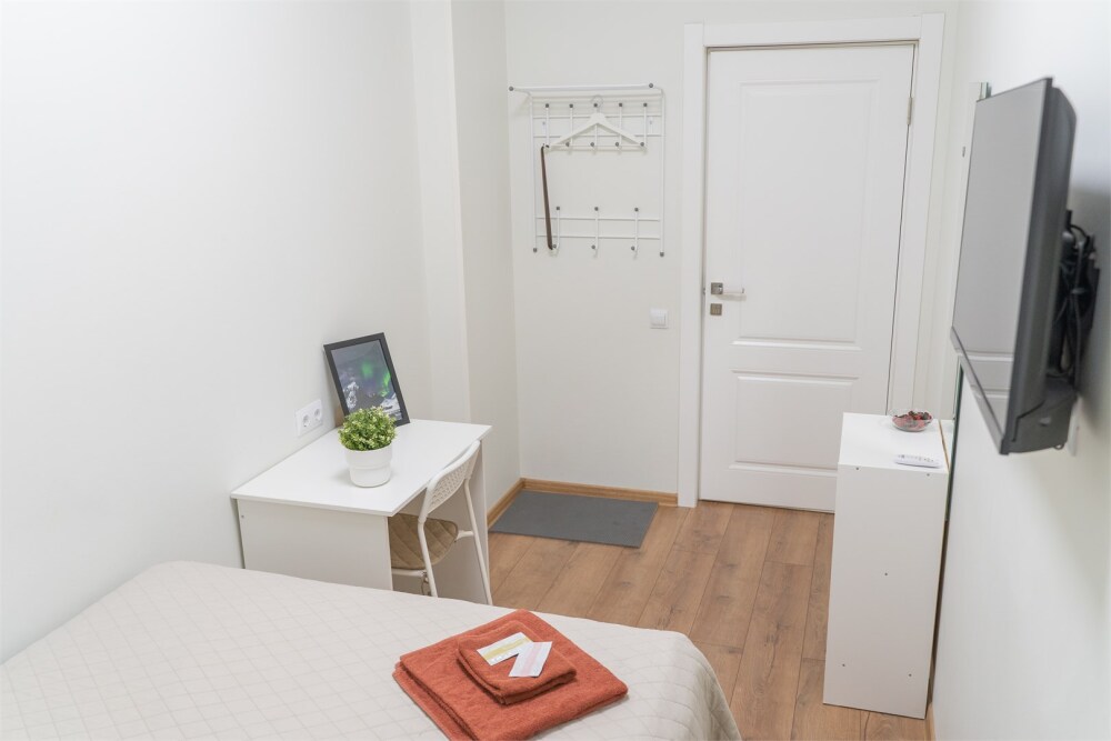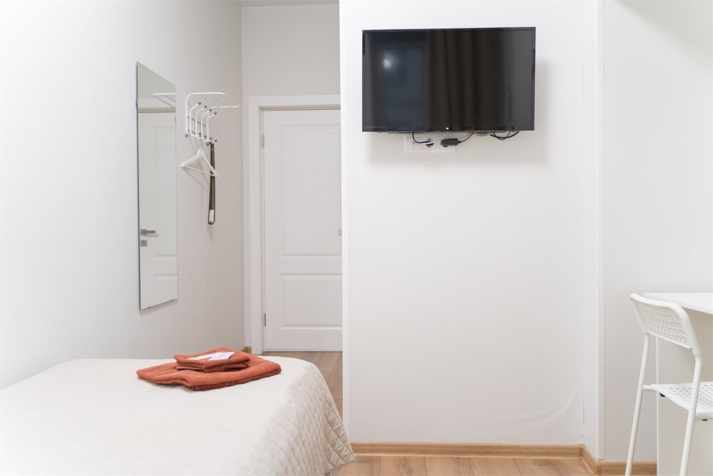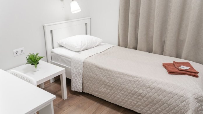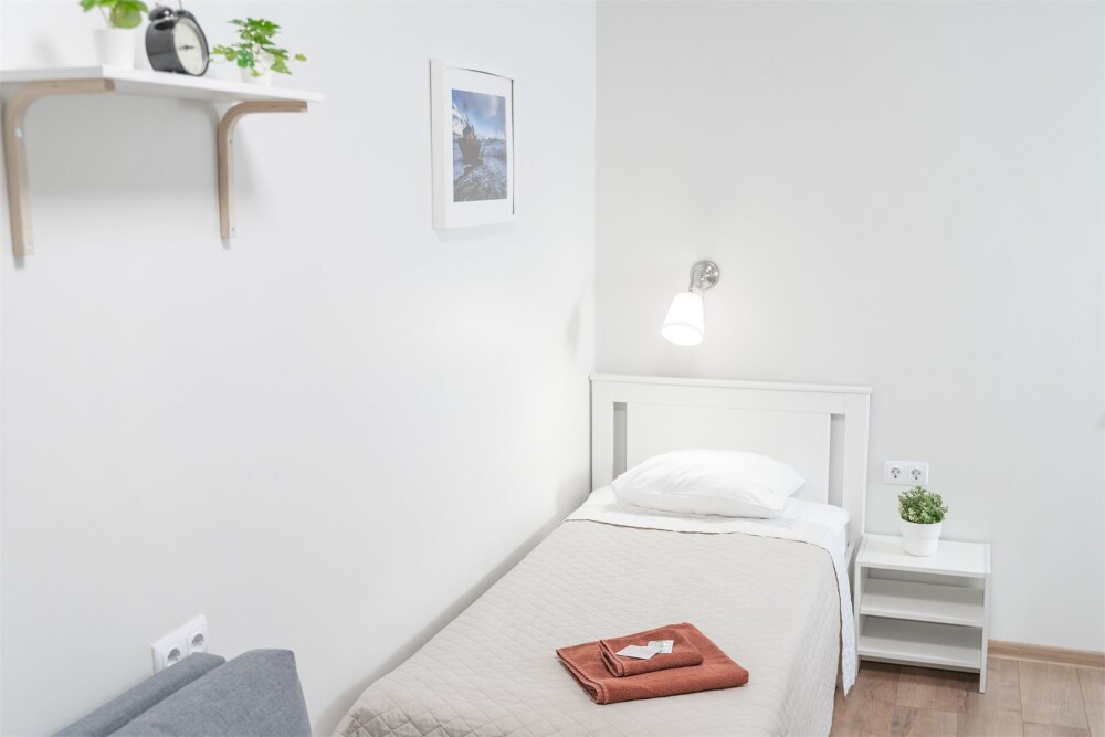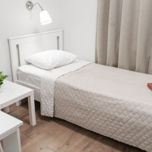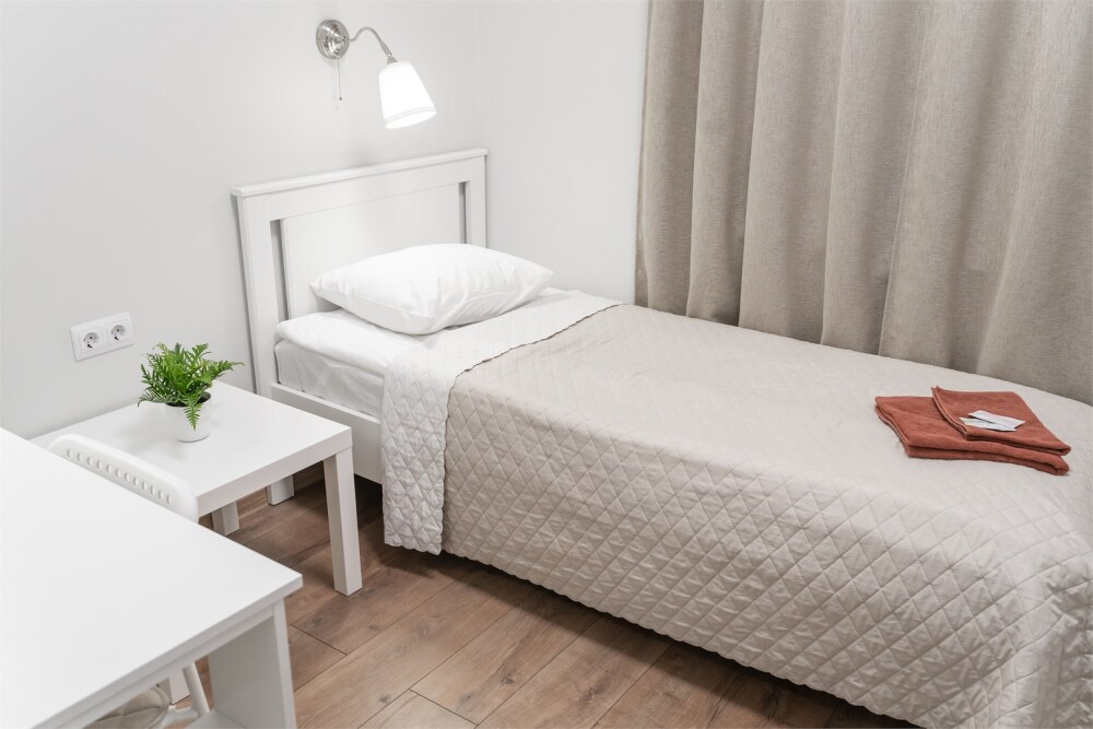 Уютный номер меблирован удобной односпальной кроватью. Номер постоянно отапливается. В номере собственная ванная комната. Также в распоряжении гостей кухня с зоной отдыха.