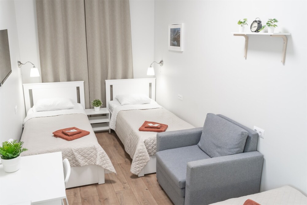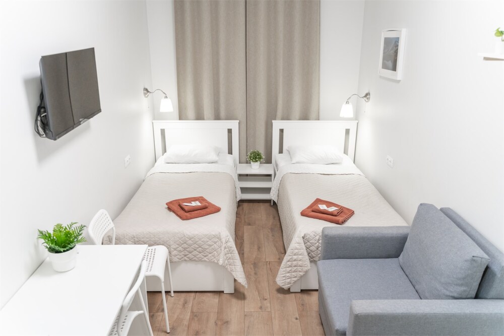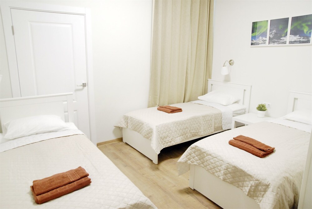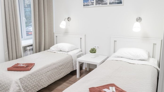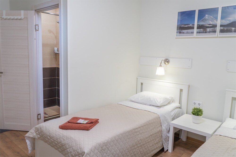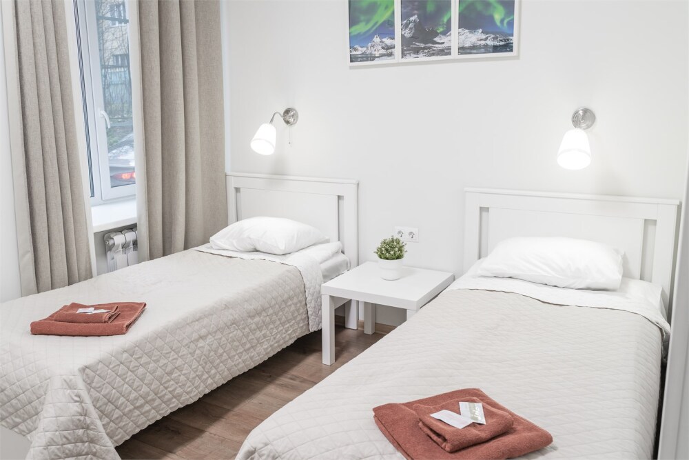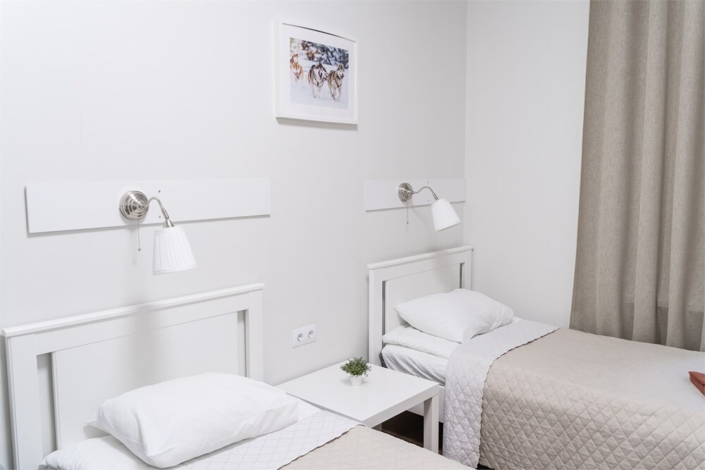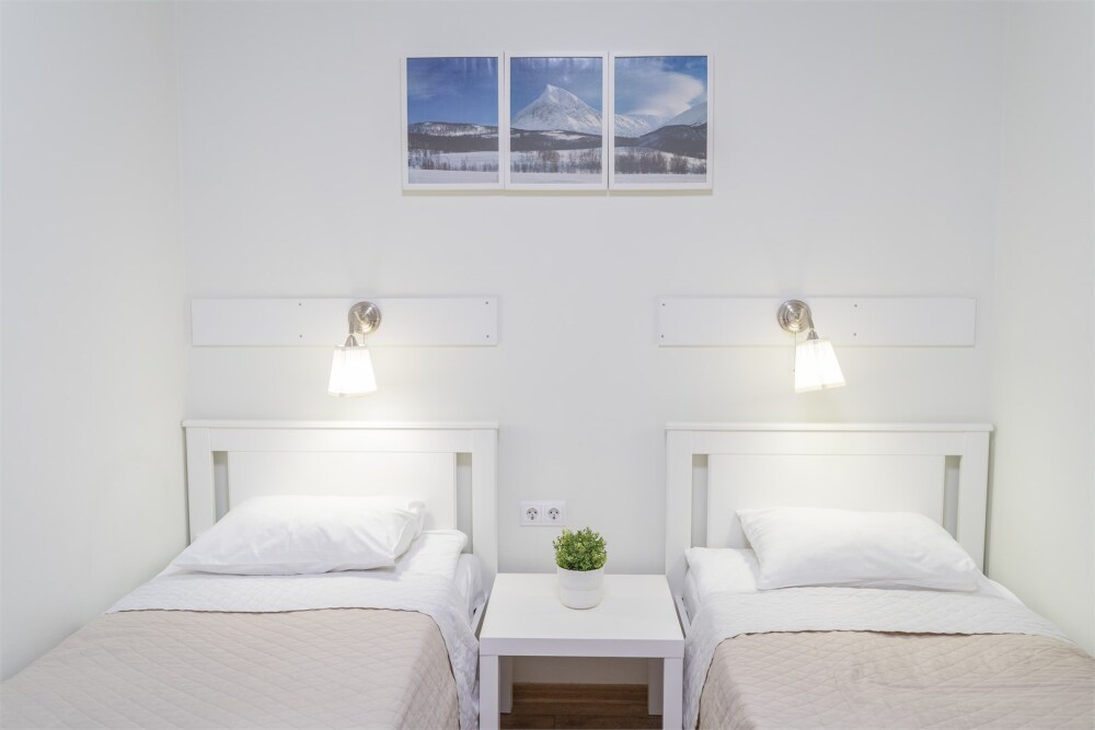 Уютный номер меблирован удобными односпальными кроватями. Номер постоянно отапливается. В номере собственная ванная комната. Также в распоряжении гостей кухня с зоной отдыха.