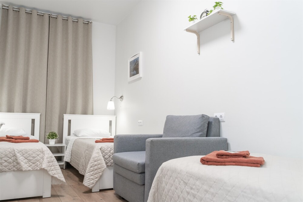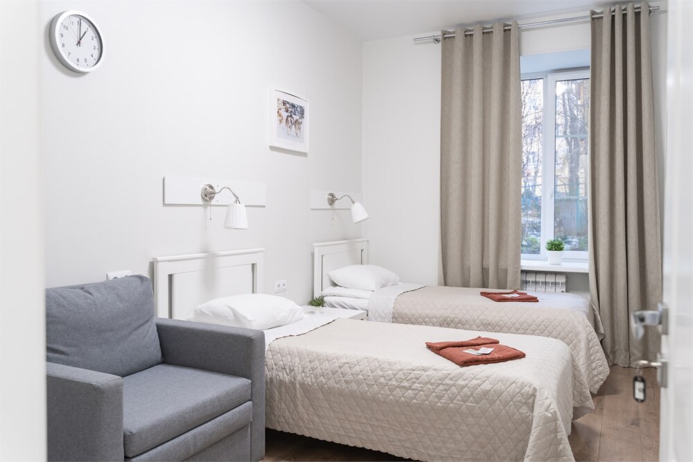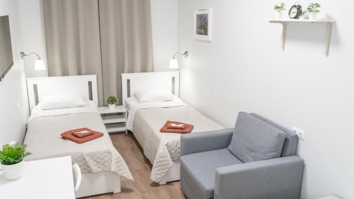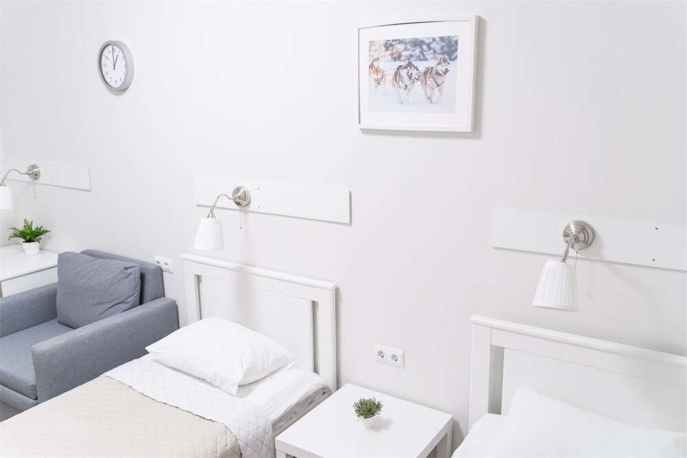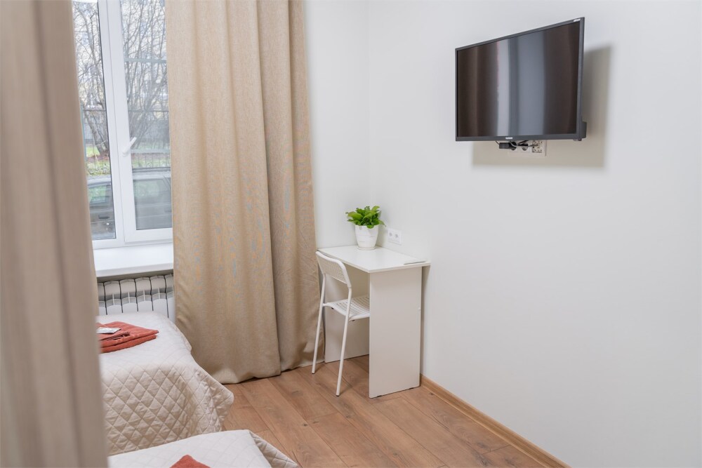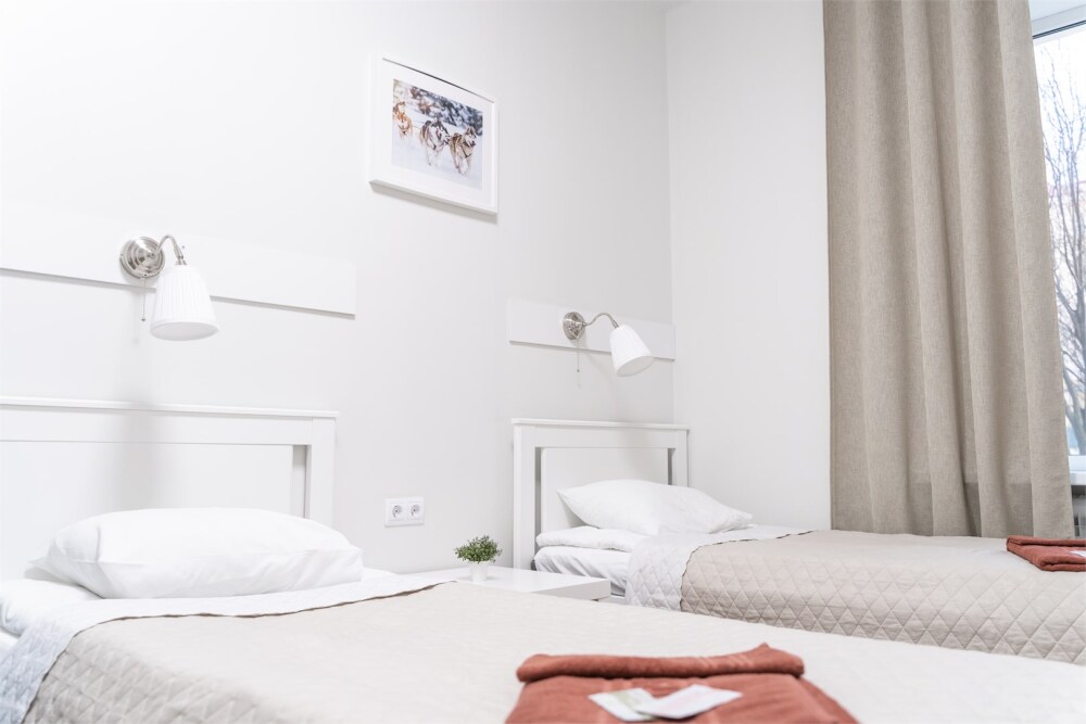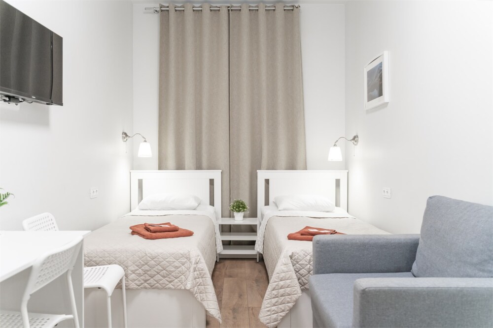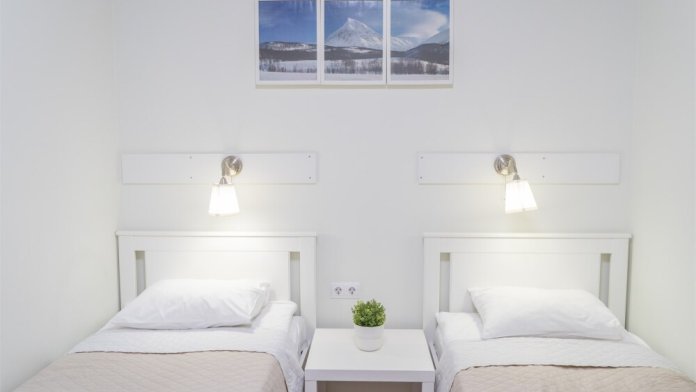 Уютный номер меблирован удобными односпальными кроватями. Номер постоянно отапливается. В номере собственная ванная комната. Также в распоряжении гостей кухня с зоной отдыха.