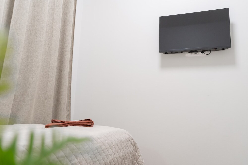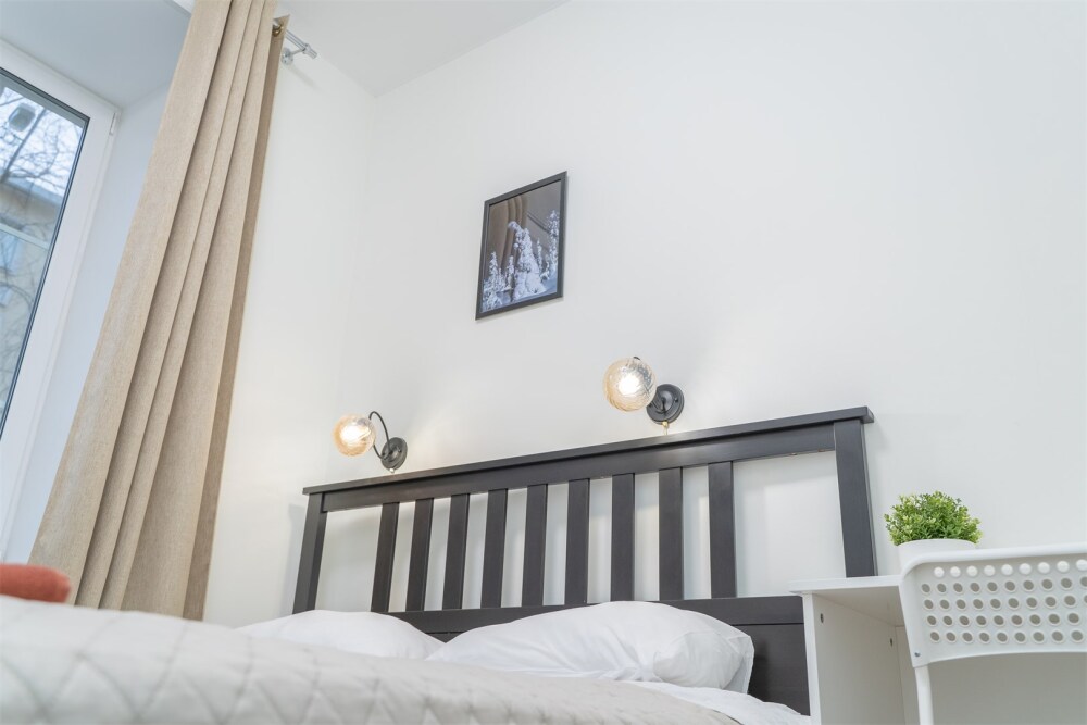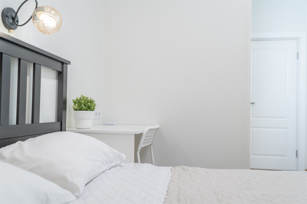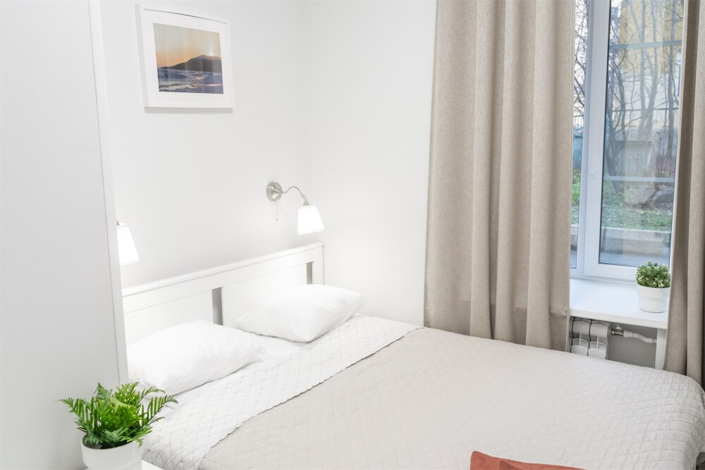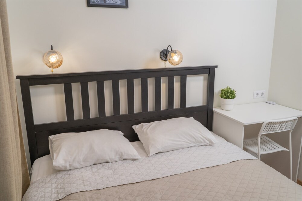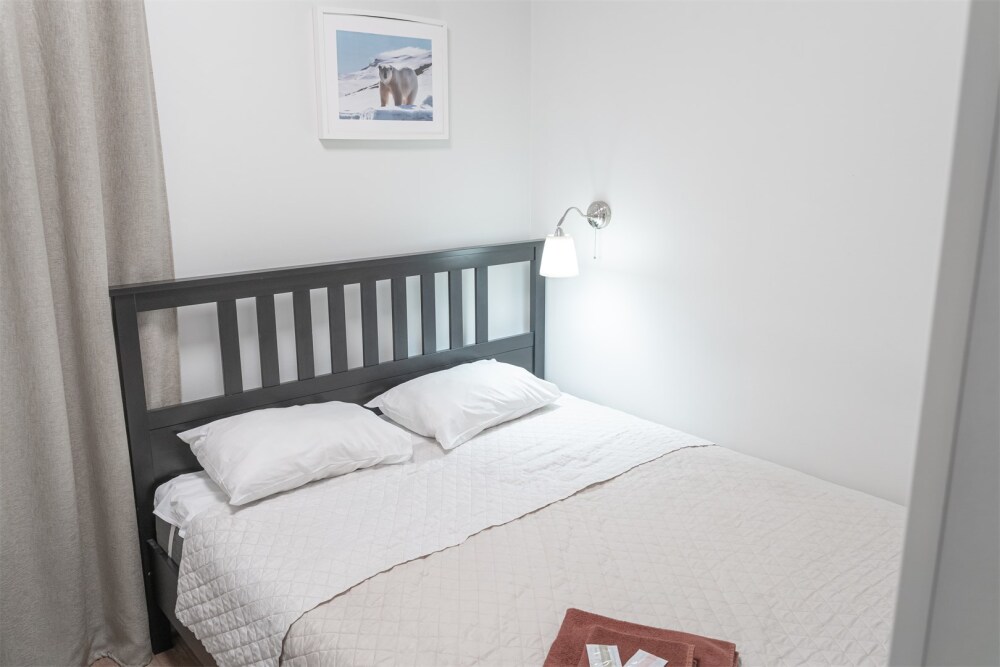 Комфортный номер для одного/двух гостей с большой кроватью размера queen-size. В номере собственная ванная комната. Также в распоряжении гостей кухня с зоной отдыха.