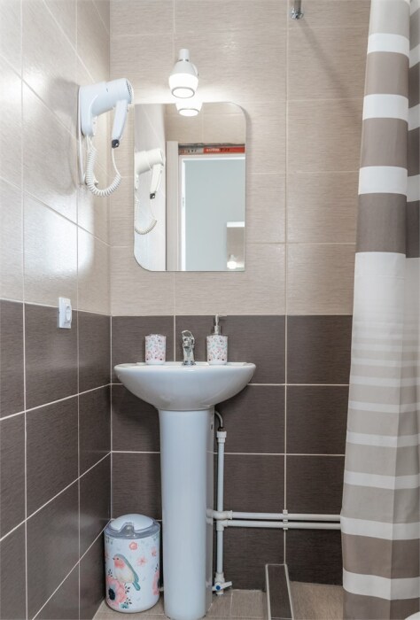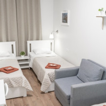 К Вашим услугам бесплатные туалетные принадлежности, предоставляется комплект полотенец. В номере также: тумбочки для каждого гостя , бра и розетки у каждой кровати, бесплатный интернет и телевидение.