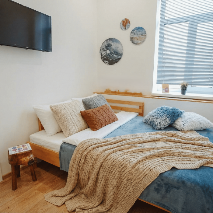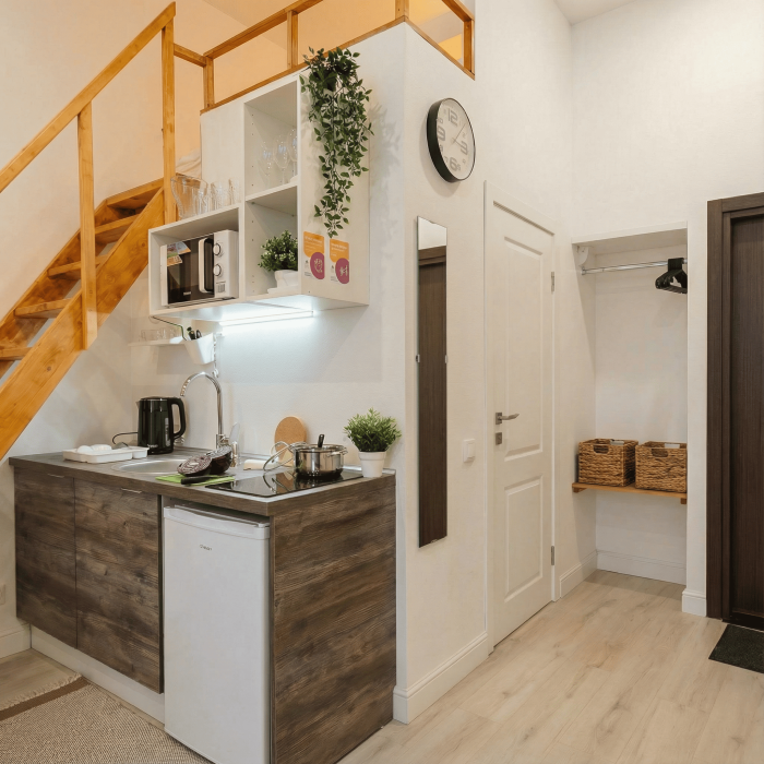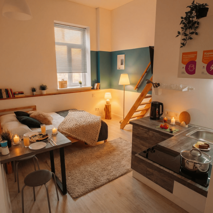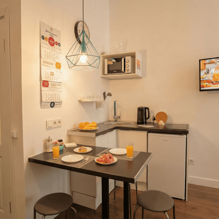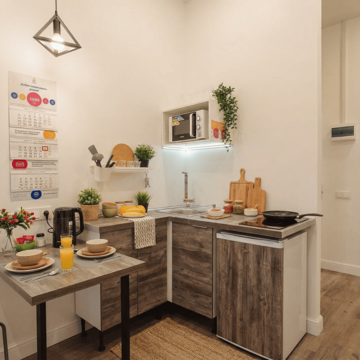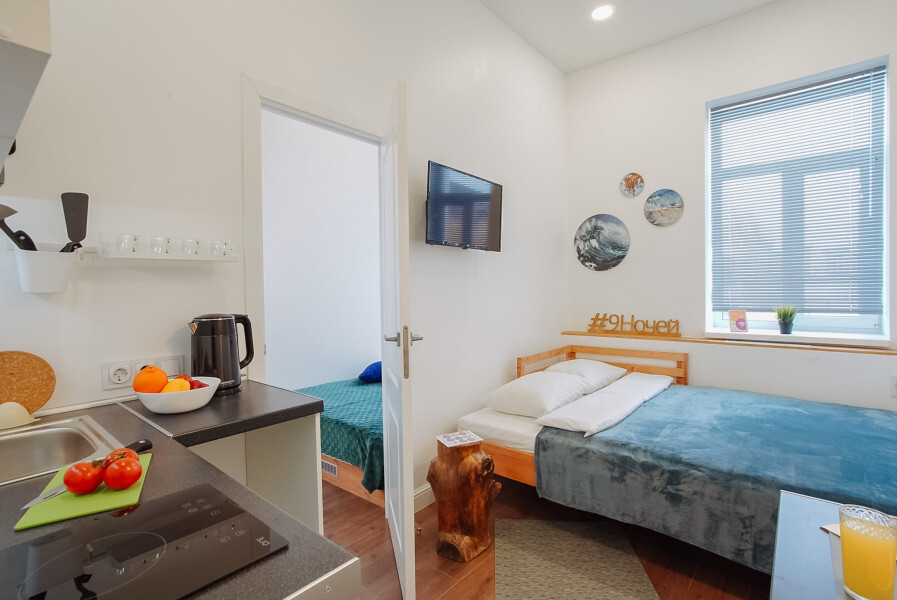Апартаменты включают в себя клининг, современную мебель, бытовую технику, свежее бельё и посуду. Гигиенические принадлежности и полотенца предоставляются каждому гостю.