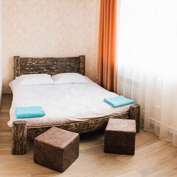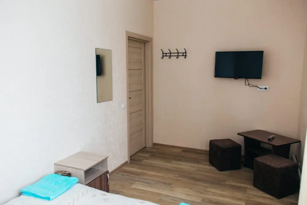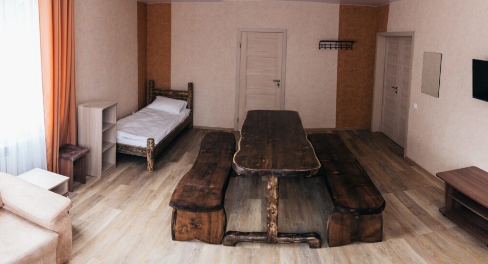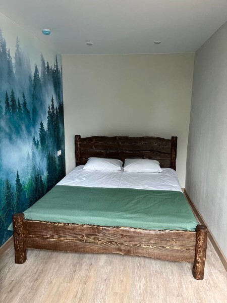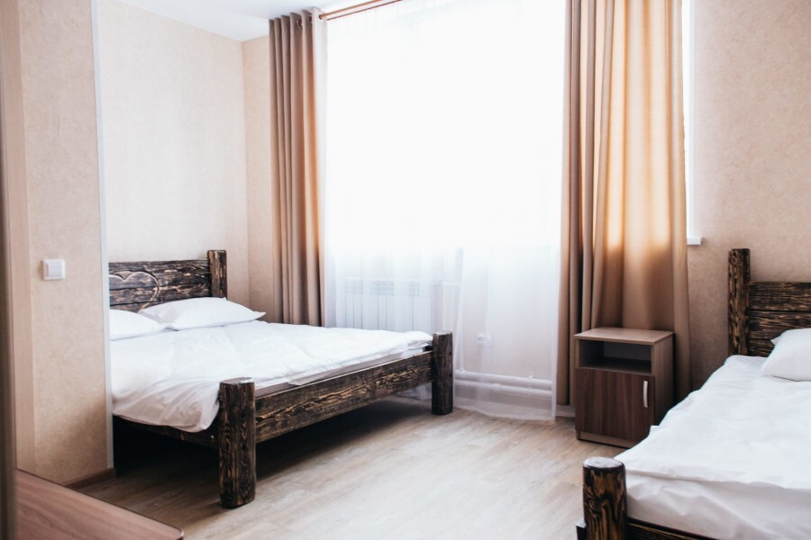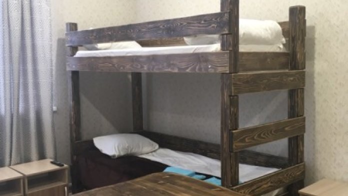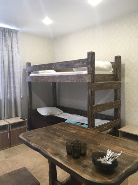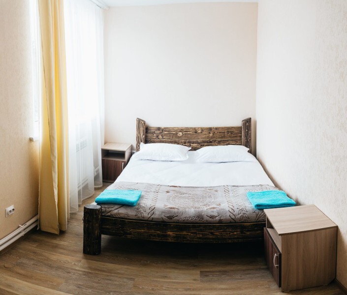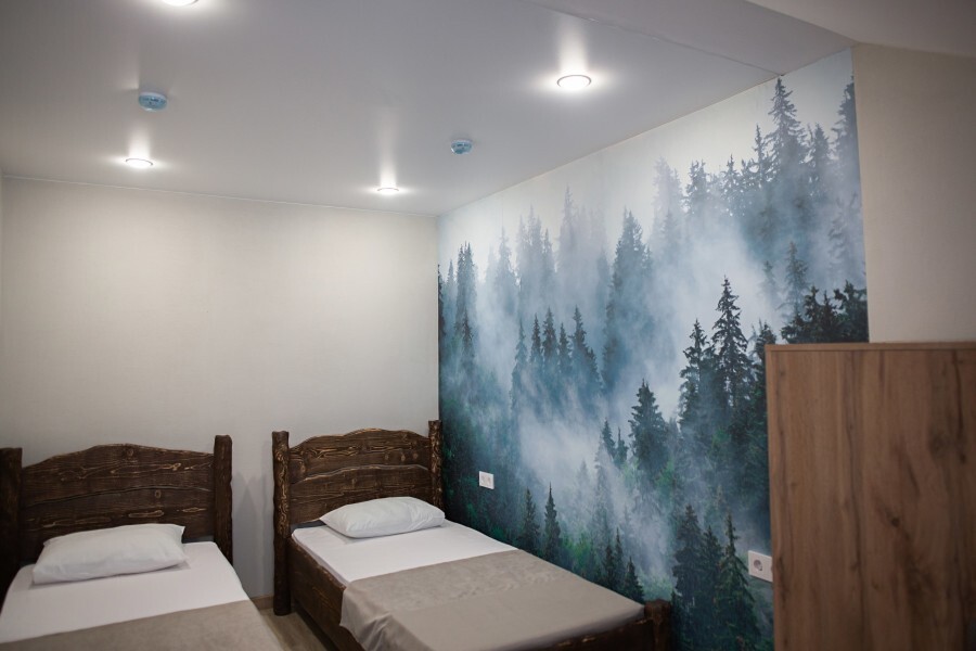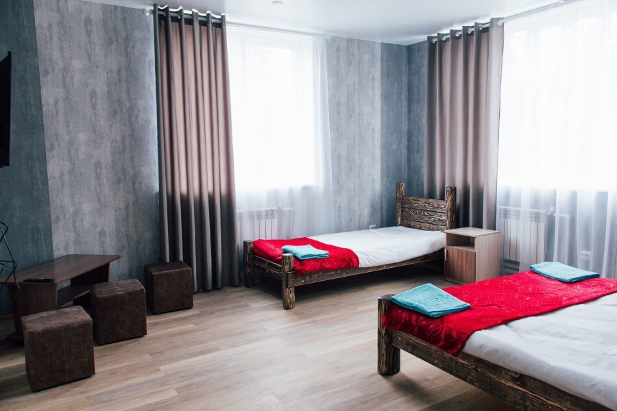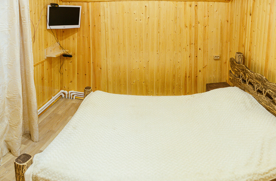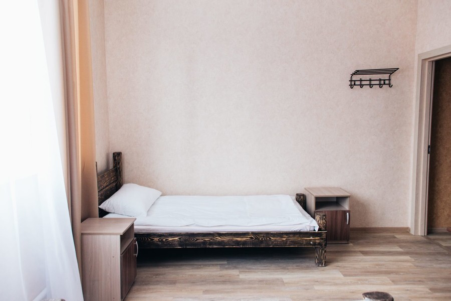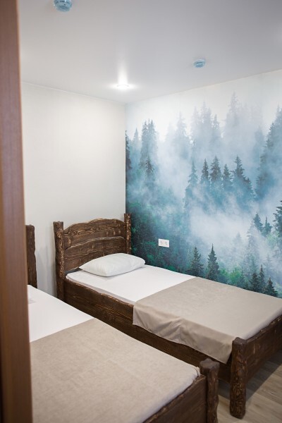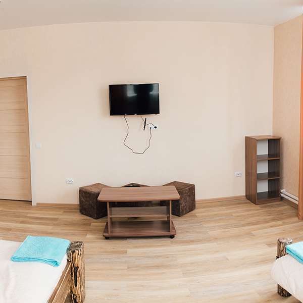Просторный номер с двумя кроватями ручной работы и ортопедическими матрасами. В номере есть стол, вешалка, телевизор и чайник. Общая кухня на этаже.