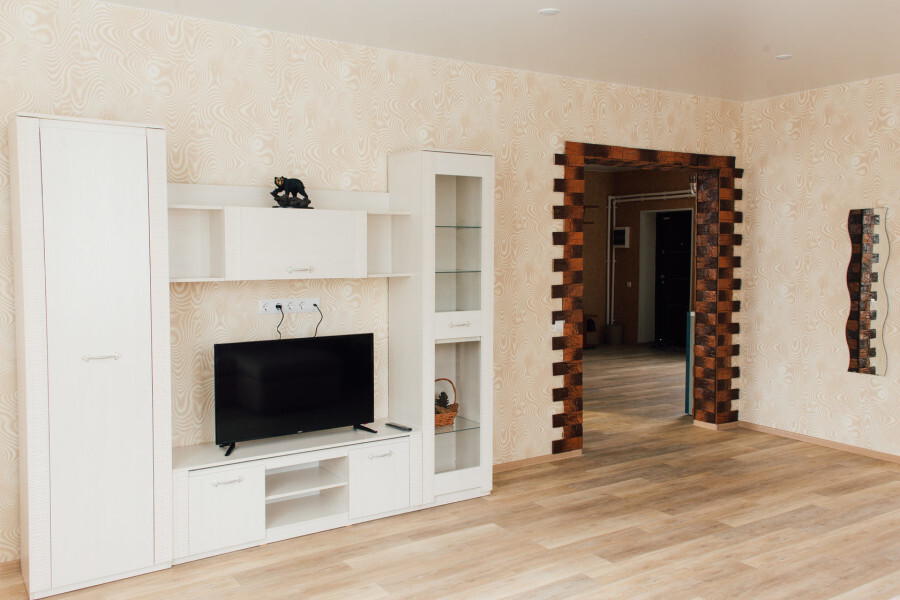 Гостиная: большой диван, телевизор, журнальный столик.