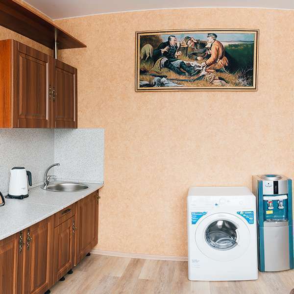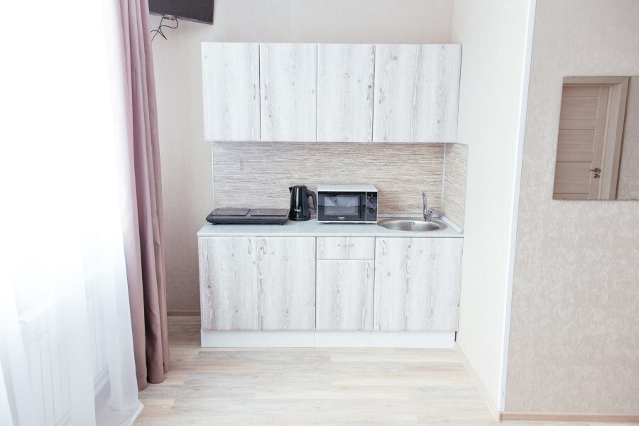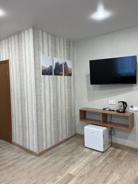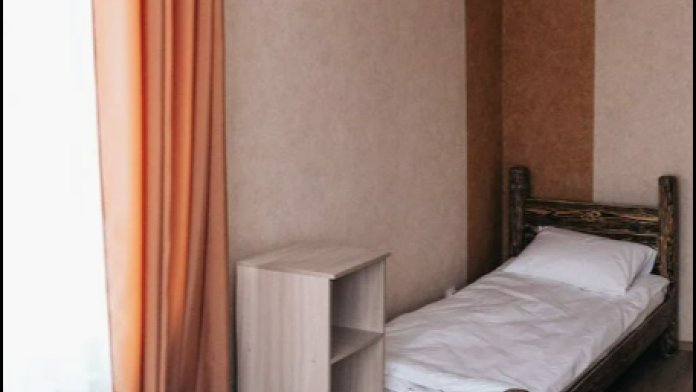 В номере есть стол, вешалка, телевизор и чайник. Общая кухня и санузел на этаже.