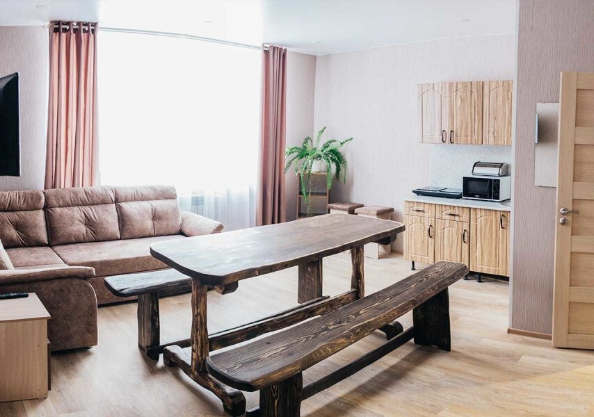 Номер удобен как для семьи, так и для небольшой компании. Две комнаты, большая обеденная зона, Собственные кухня, туалет, душ.