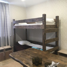 Двухъярусная и двухспальная кровати ручной работы с ортопедическими матрасами. Собственный душ и туалет.