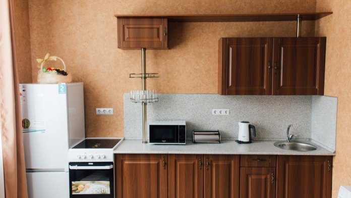 Кухня: гарнитур с посудой на 15 человек, плита с духовкой, холодильник, микроволновка, чайник, большой стол, стулья, телевизор.