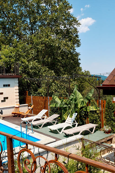Большой бассейн с постоянной фильтрацией воды и лаундж зона с шезлонгами для загара и отдыха. Это отличное место чтобы взбодриться сутра или освежиться после активного дня под ярким июльским солнцем.