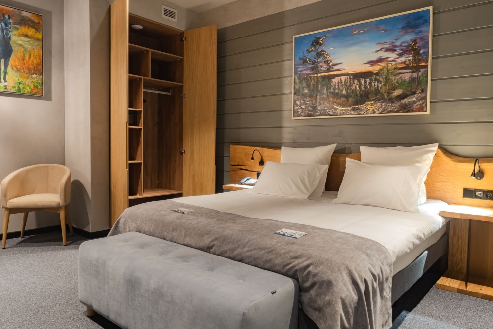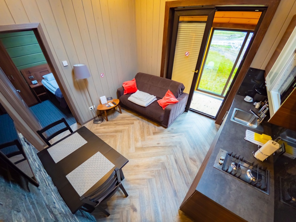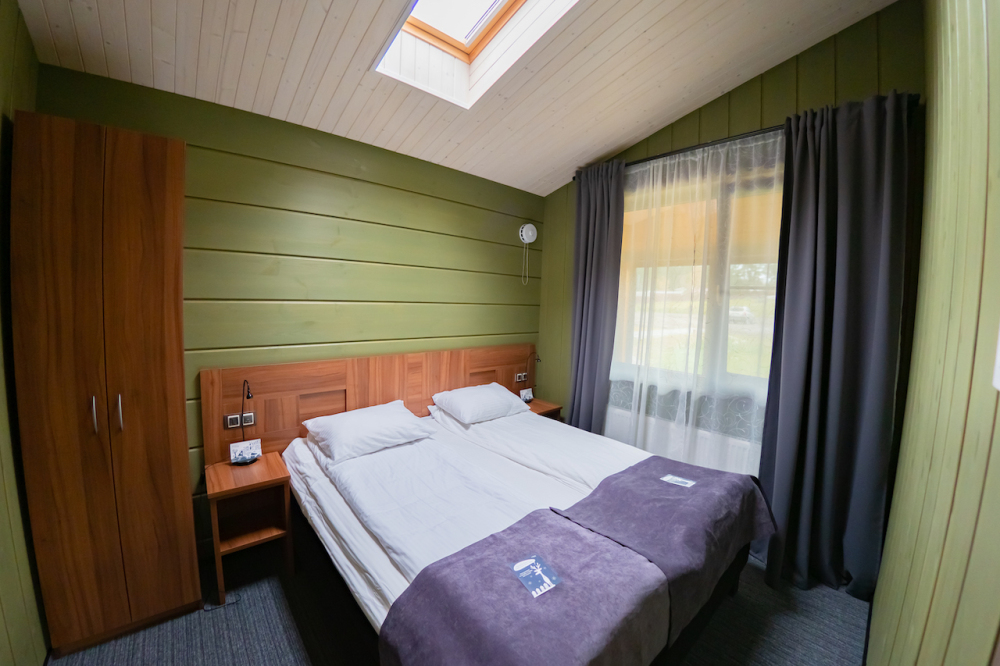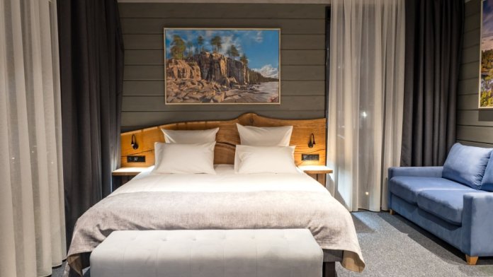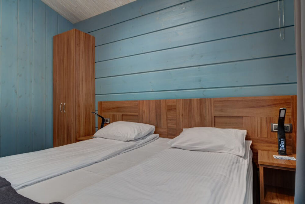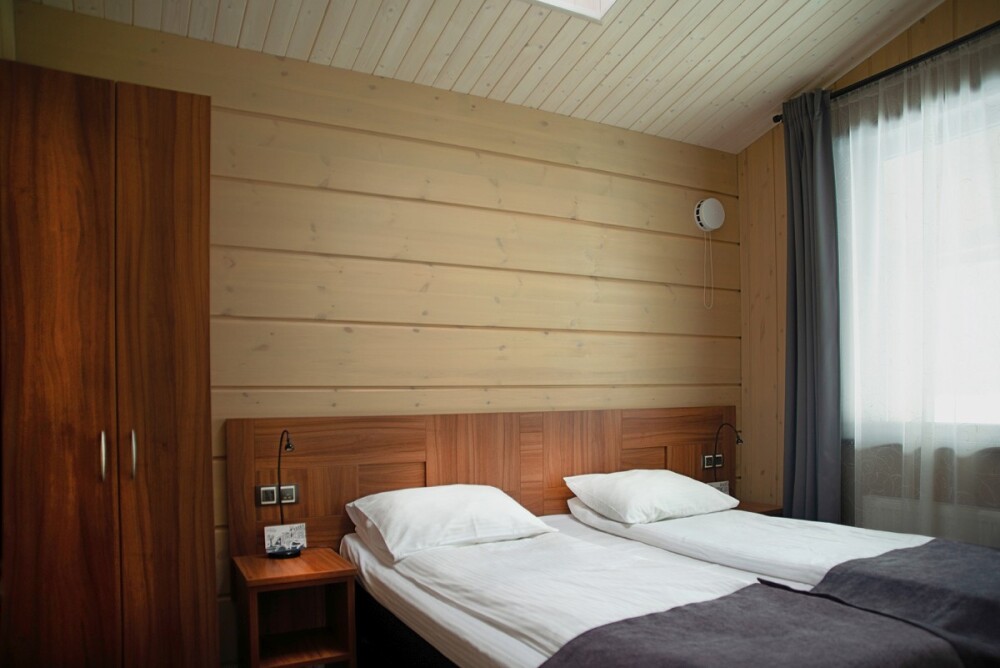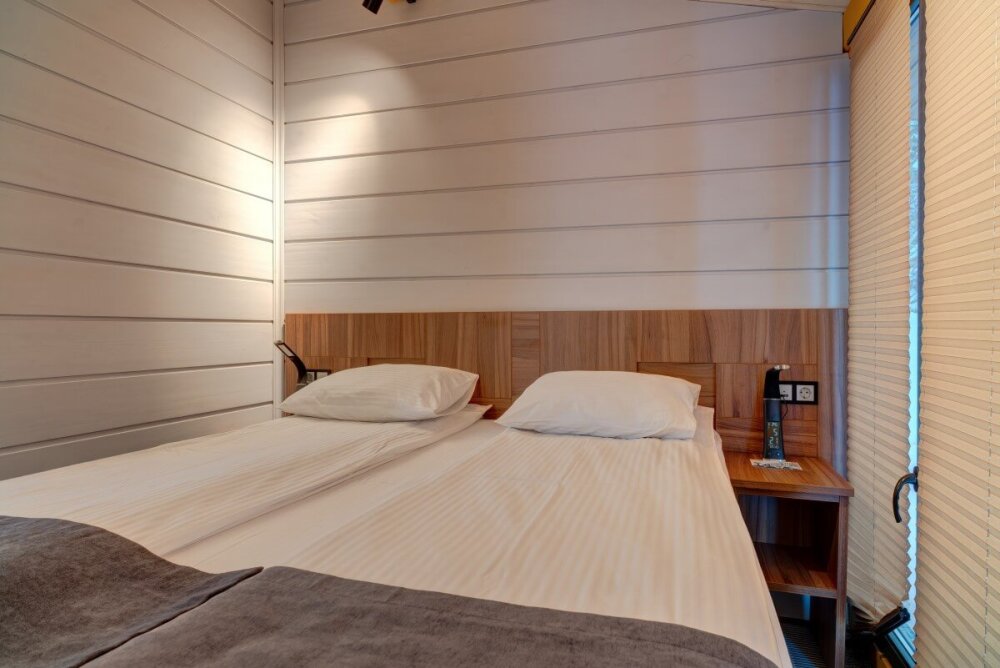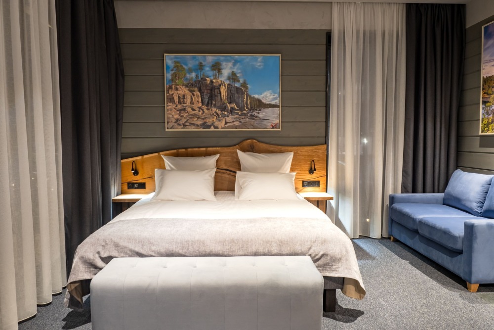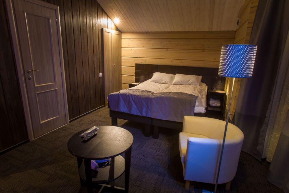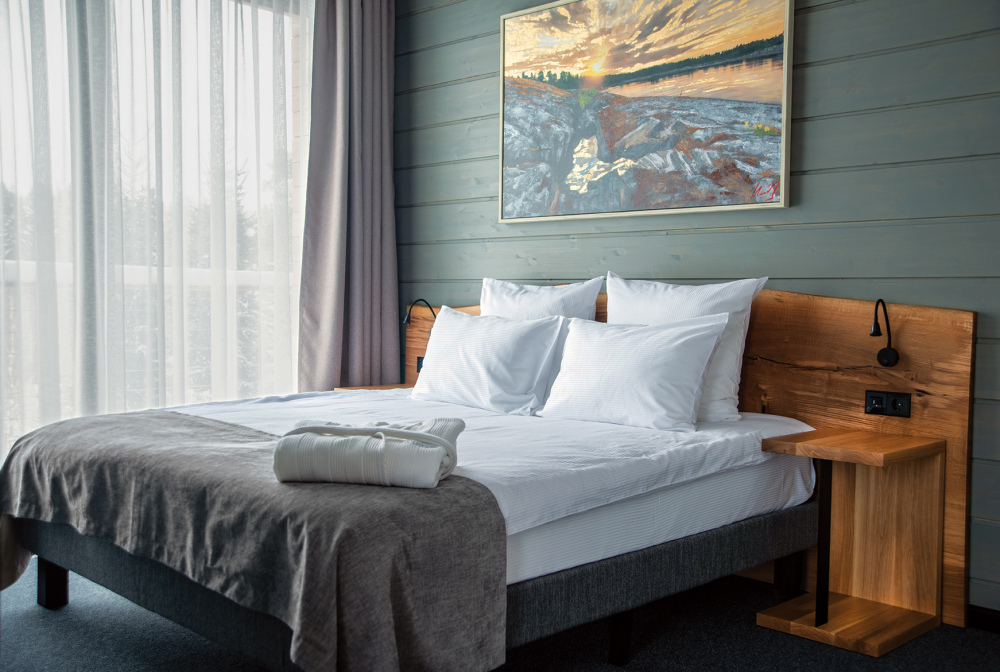 Мы предлагаем 3 варианта размещения - Стандарт Делюкс, Полулюкс, Люкс. Вас ждут: двуспальная, поистине королевская, кровать King-Size; капсульная кофемашина Nespresso; удобный санузел с комфортной душевой кабиной; постельное белье, полотенца, халаты, тапочки; все необходимые косметические принадлежности; мини-кухня (плита, столовая посуда на 2 человек, посудомоечная машина) (кроме Deluxe); роскошная панорама волшебной Ладоги; кондиционер.
