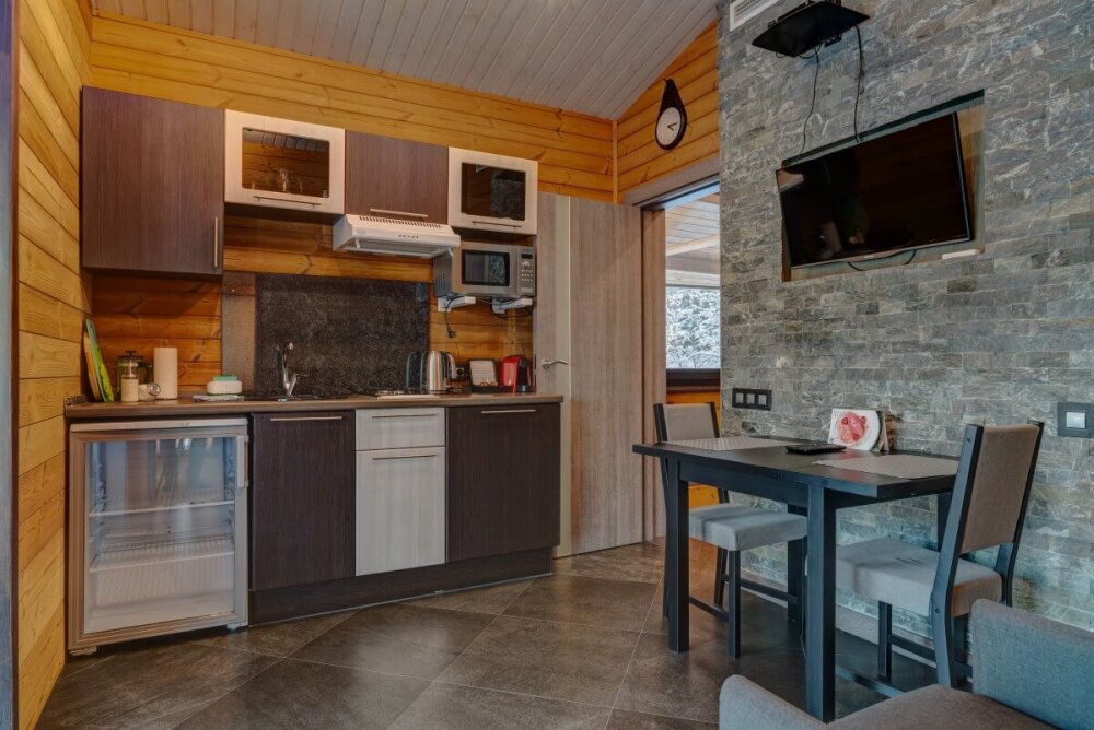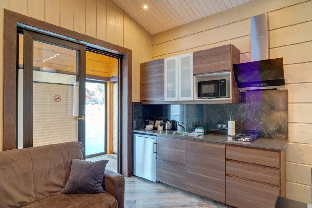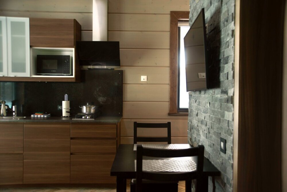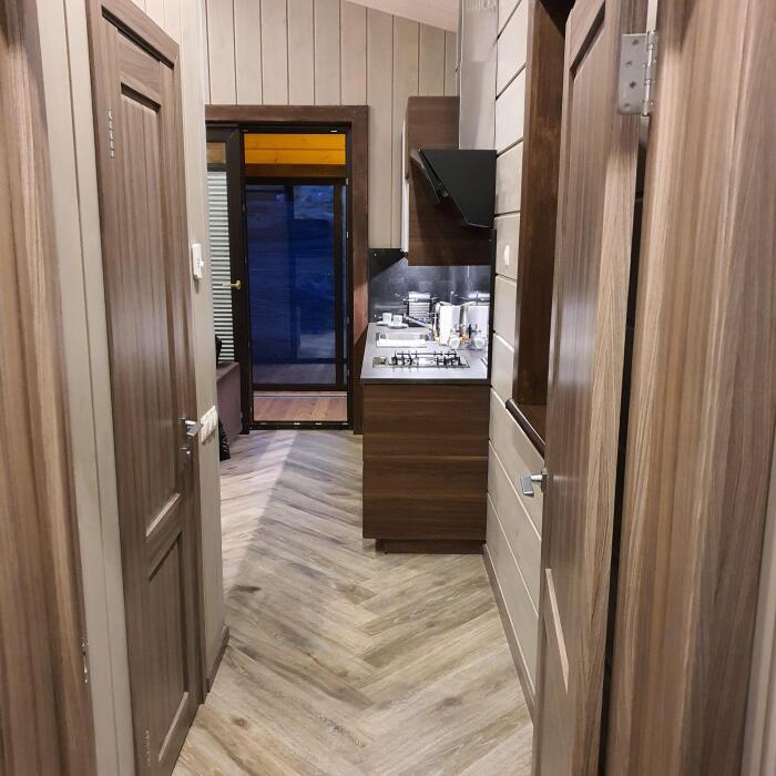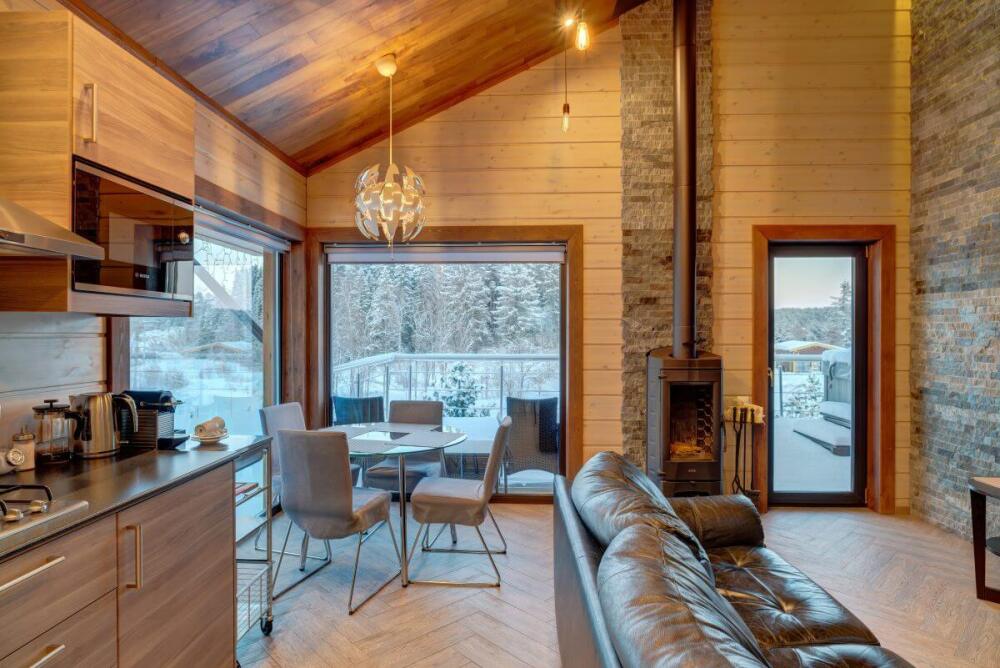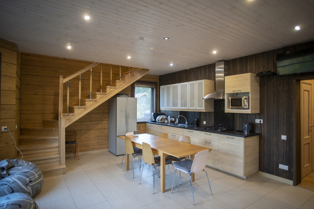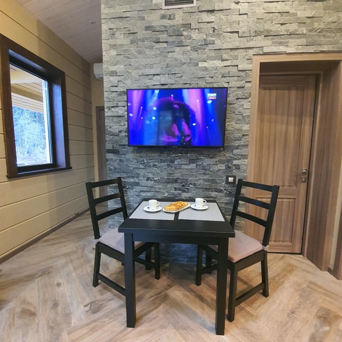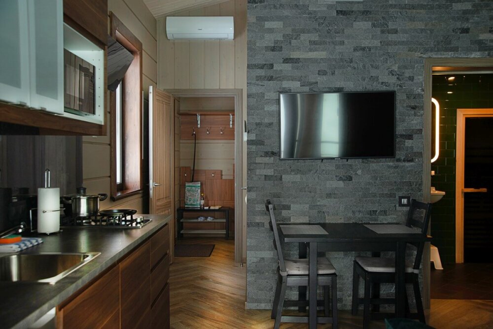 В коттедже есть 2 полноценные спальные комнаты, кухня соединена с гостиной зоной, где особую уютную атмосферу создают панорамные окна, камин и декоративная подсветка.
