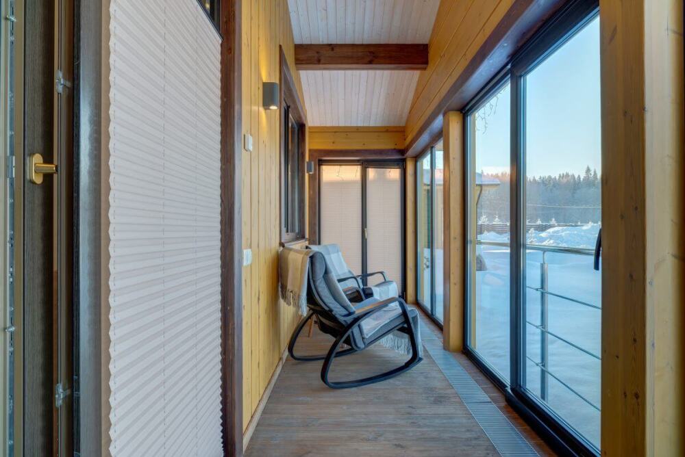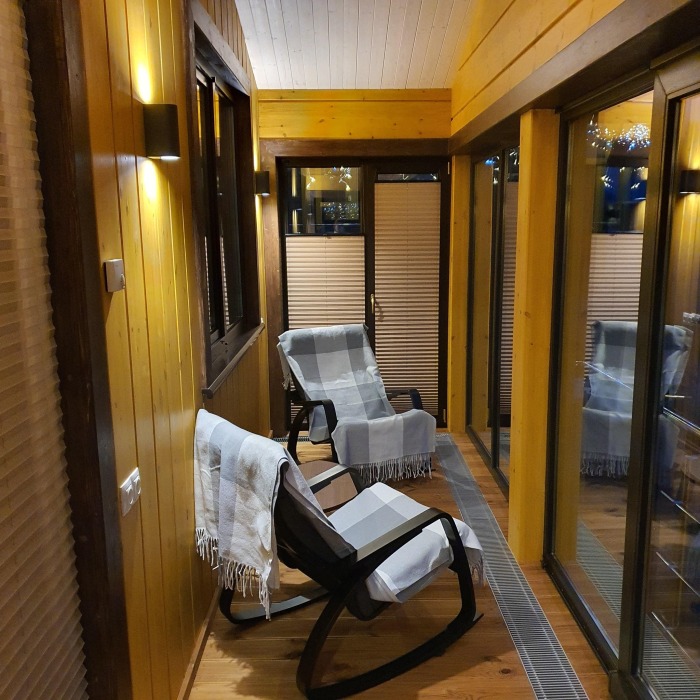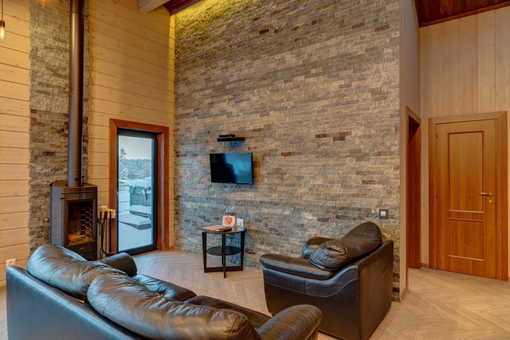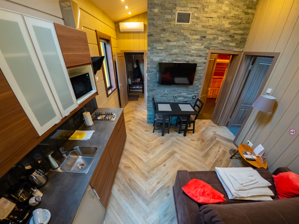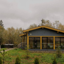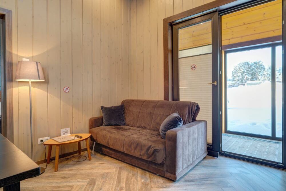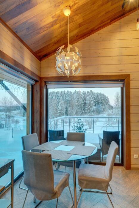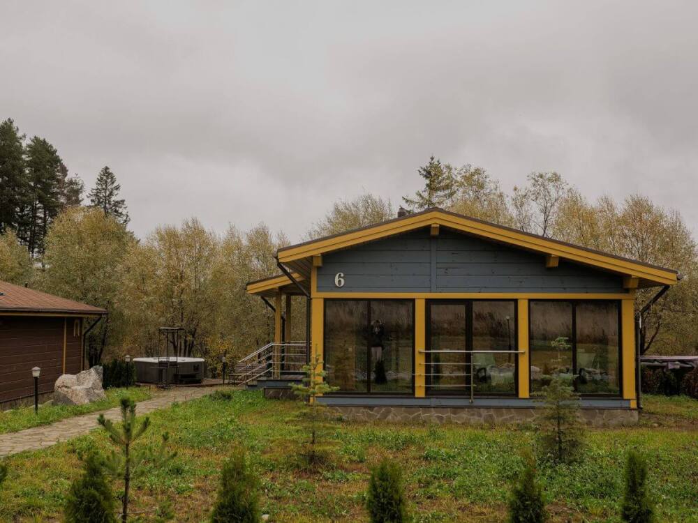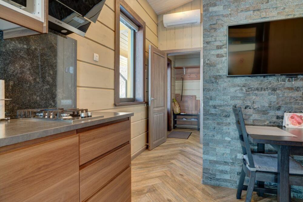 В коттедже есть 2 полноценные спальные комнаты, кухня соединена с гостиной зоной, где особую уютную атмосферу создают панорамные окна, камин и декоративная подсветка.