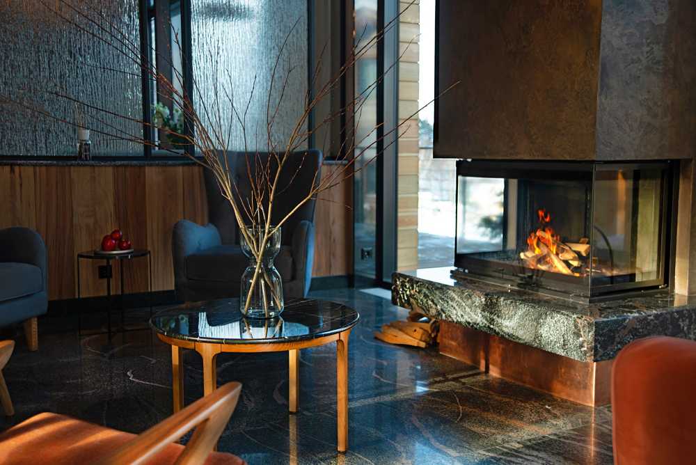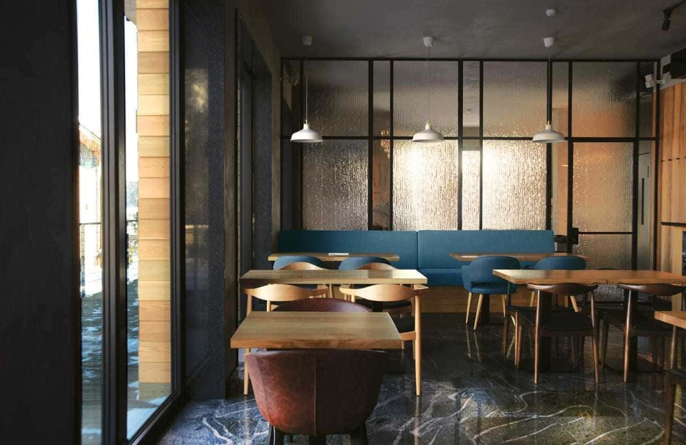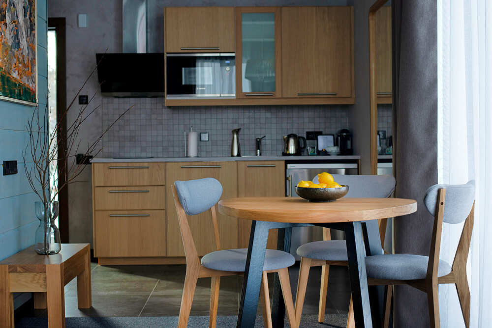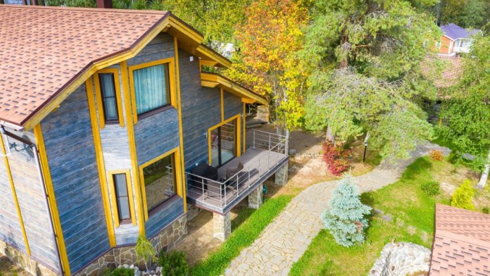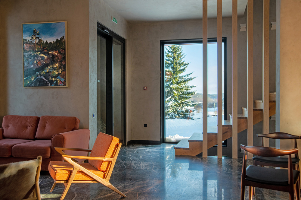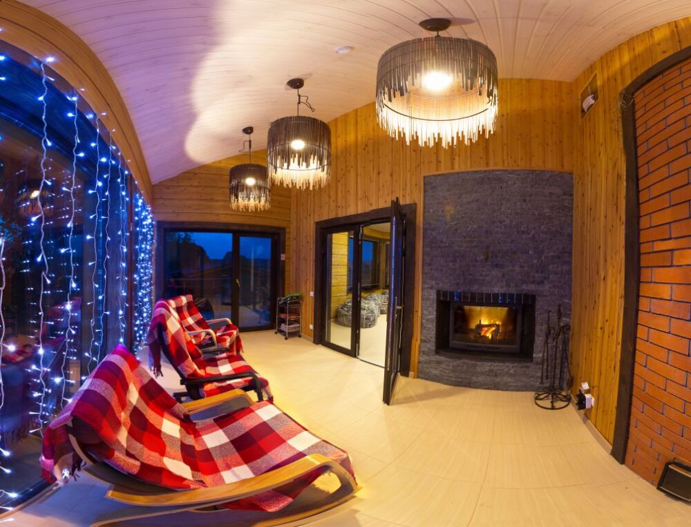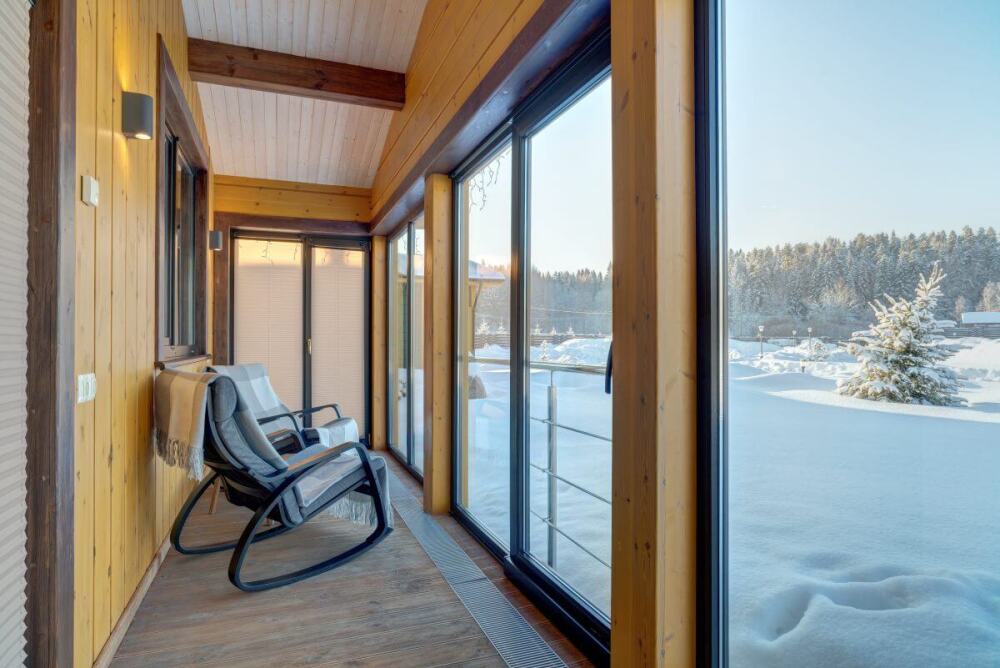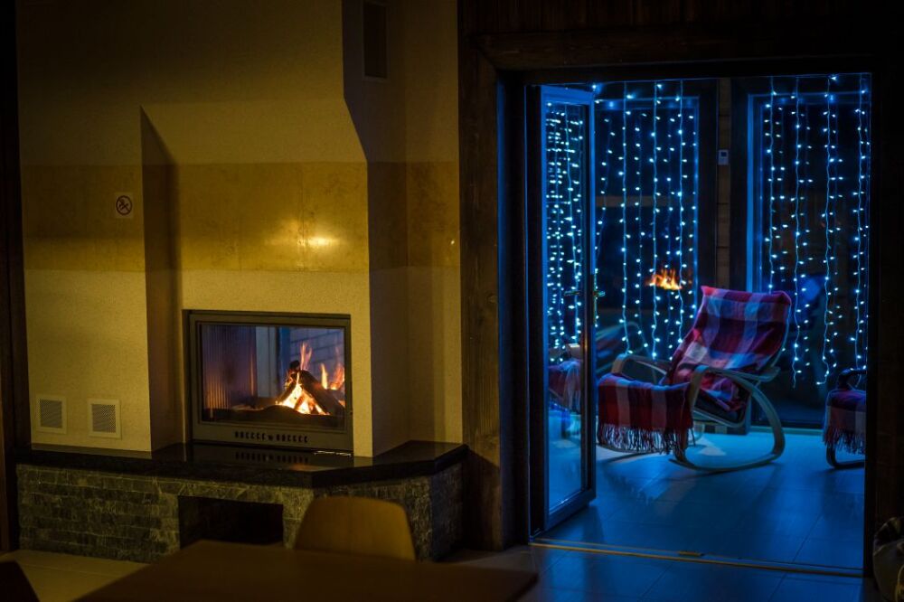 В коттедже есть 2 полноценные спальные комнаты, кухня соединена с гостиной зоной, где особую уютную атмосферу создают панорамные окна, камин и декоративная подсветка.
