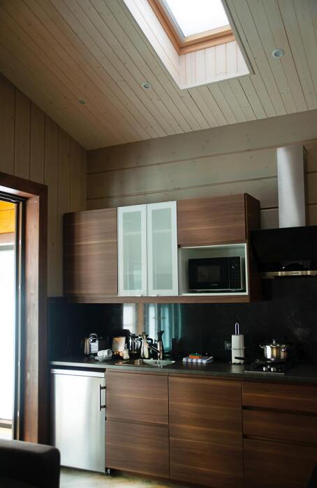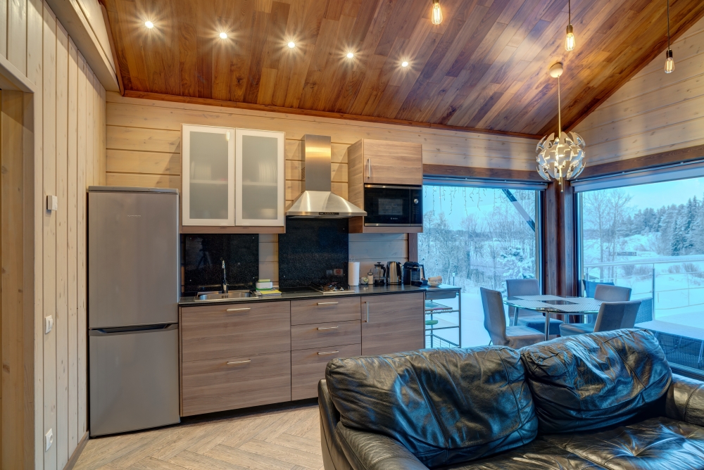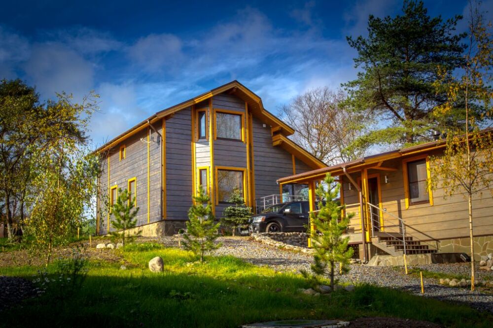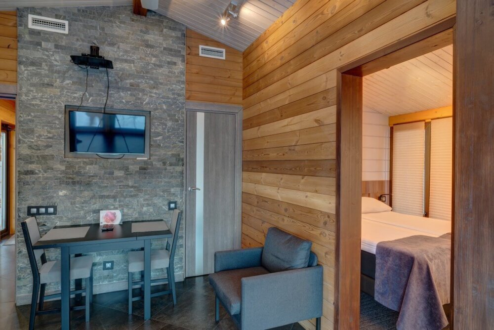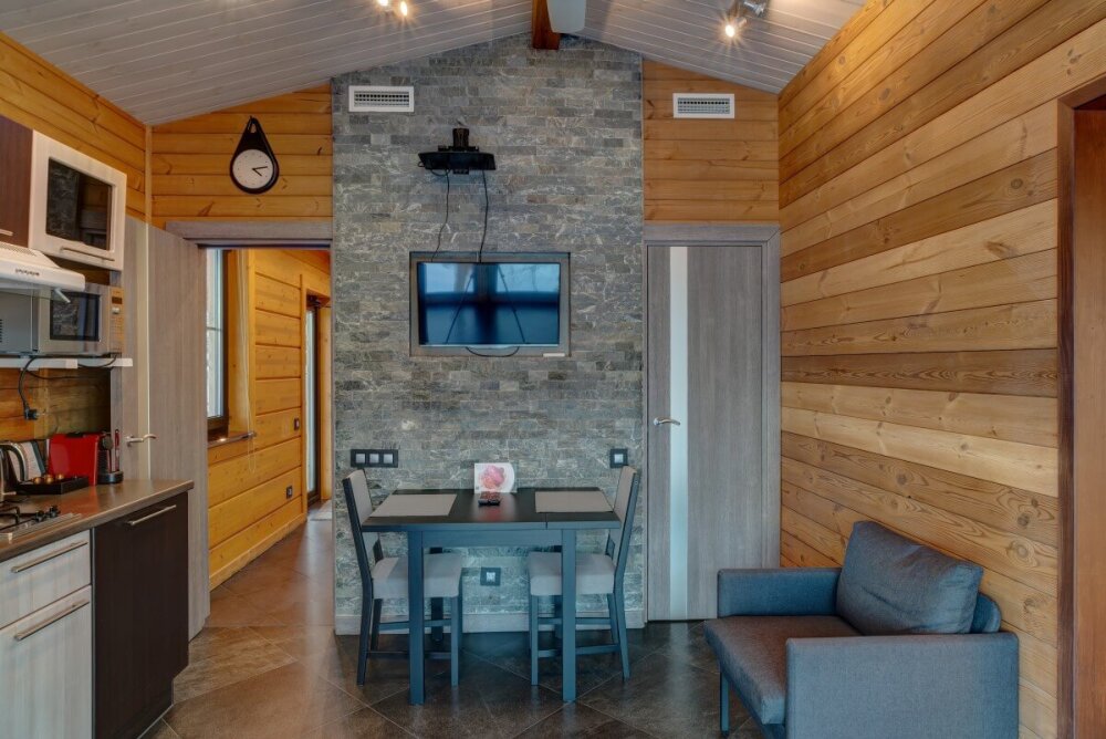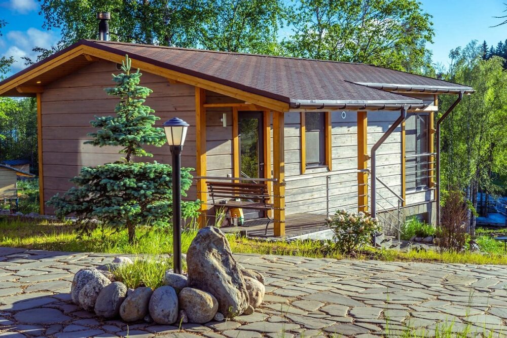 Арендуя домик в нашем комплексе у озера, Вы получаете полный перечень необходимых удобств. В распоряжении будет оборудованная кухня с варочной панелью, набором посуды, холодильником, микроволновой печью, посудомоечной машиной. В домиках грамотная планировка пространства, мягкие спальные места, бесплатный Wi-Fi. К личным услугам сауна, душ, санузел и косметические наборы. Возле каждого строения оборудована зона барбекю, предоставляются принадлежности для приготовления шашлыка. Приятный бонус коттеджей - застекленная просторная терраса с мебелью и панорамным видом на Ладогу.