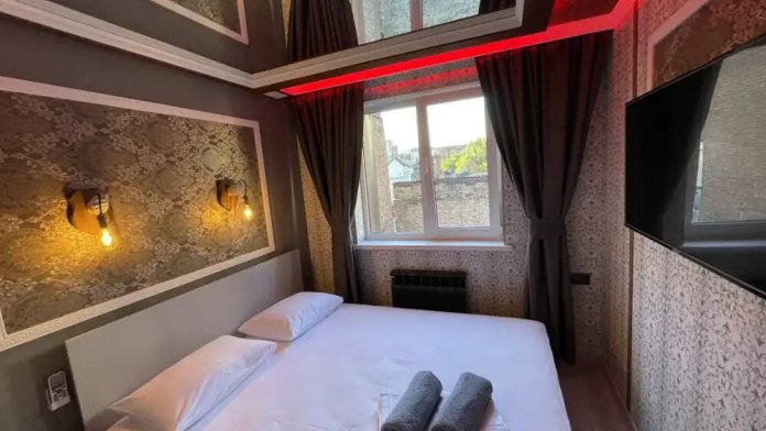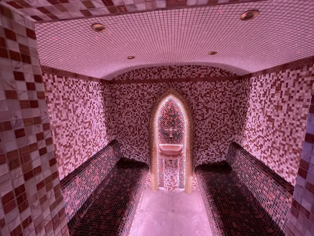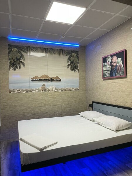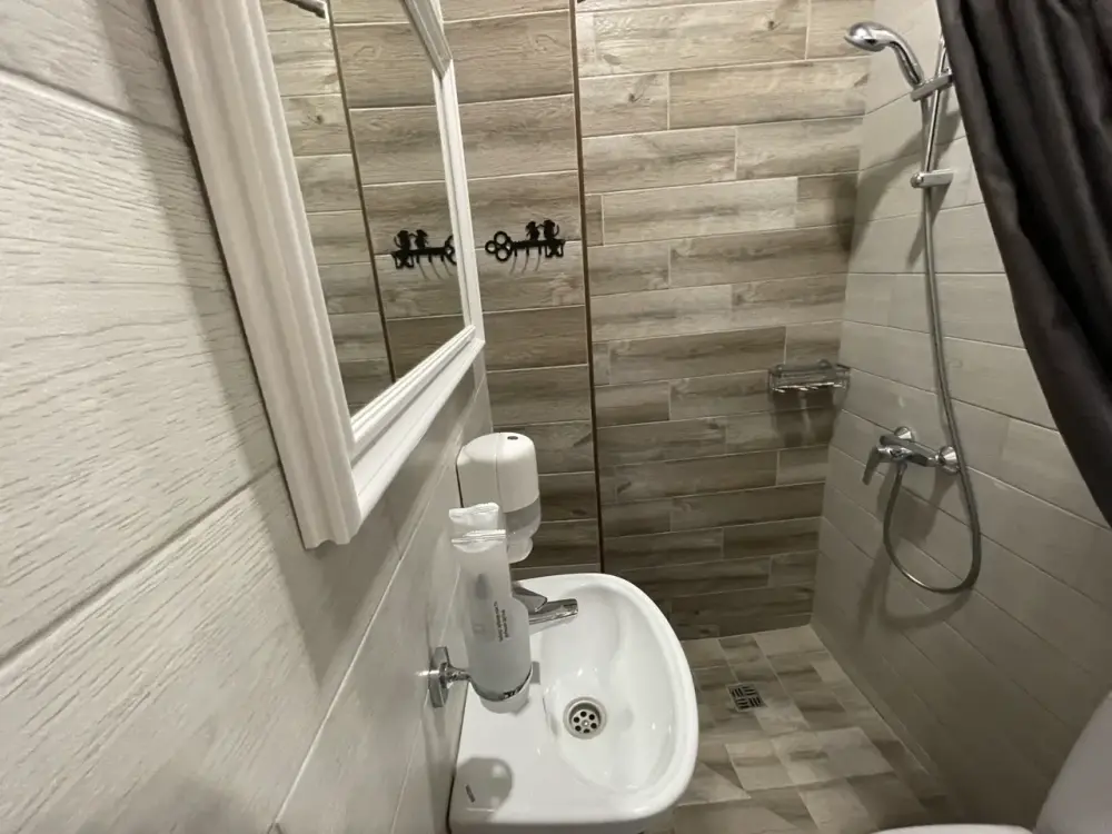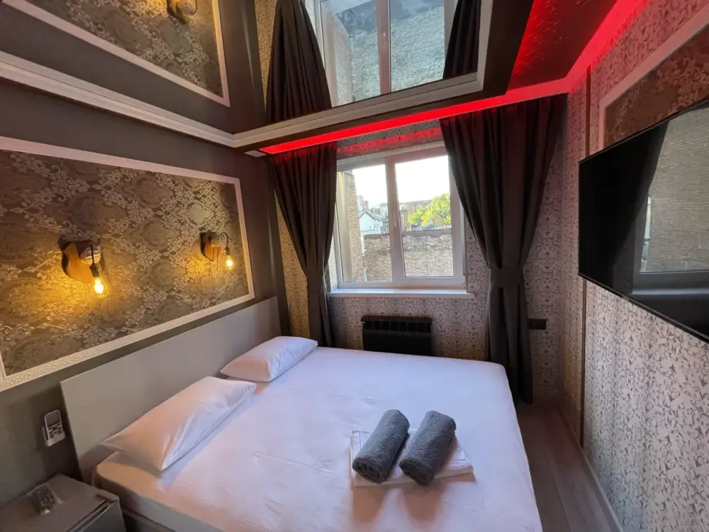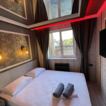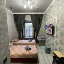 Четырехместный двухкомнатный номер Семейный с хаммамом. Две большие двухспальные кровати, телевизор в каждой комнате, бесплатный WI-FI, со всеми удобствами, свой санузел с предметами личной гигиены, бесплатная закрытая парковка, завтрак включен в стоимость проживания. Хаммам за дополнительную оплату.
