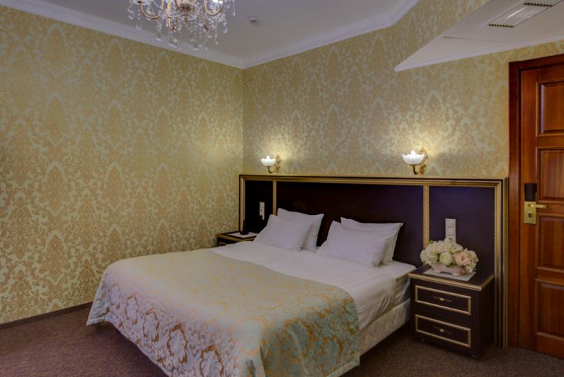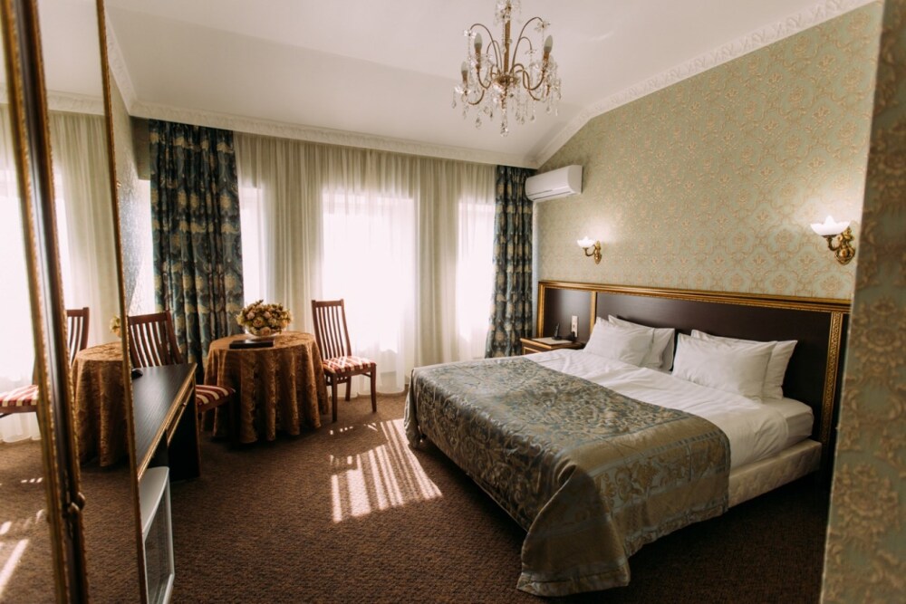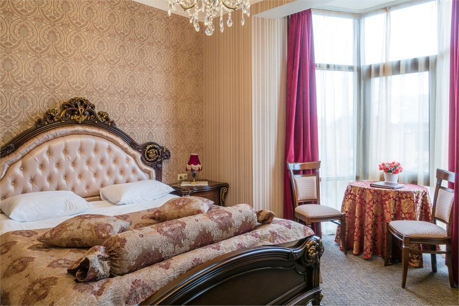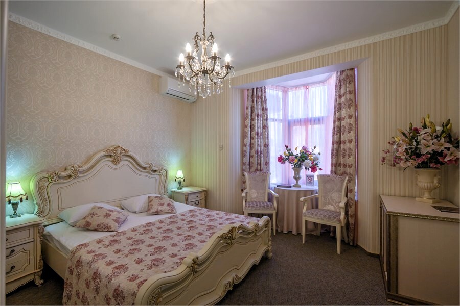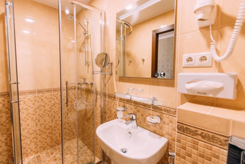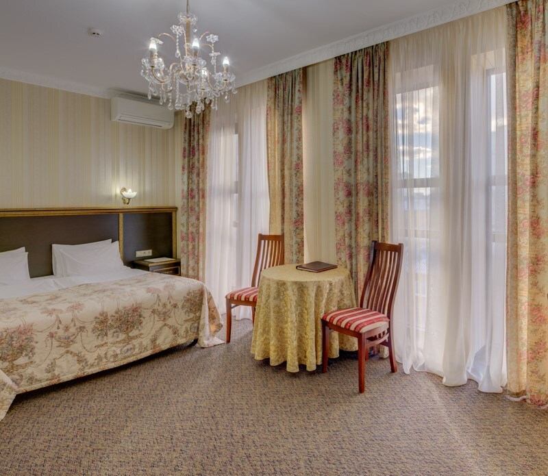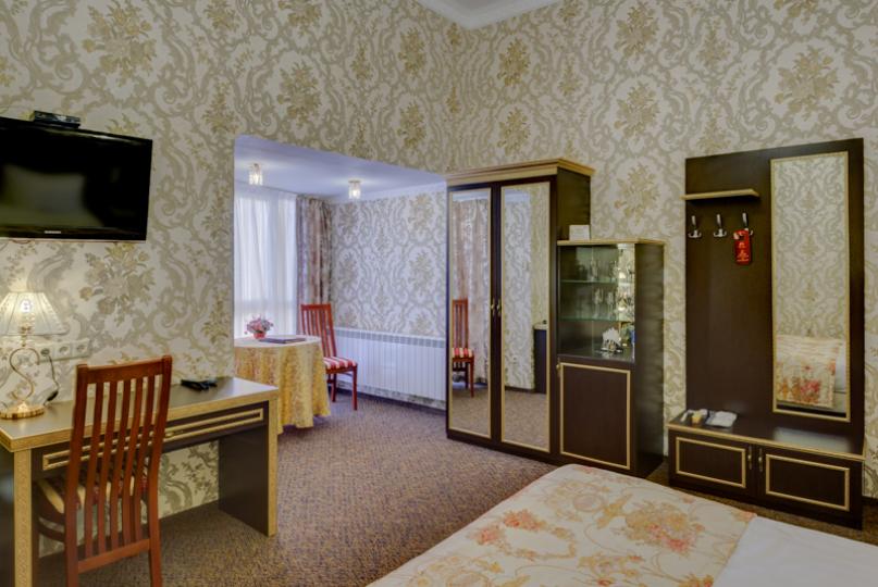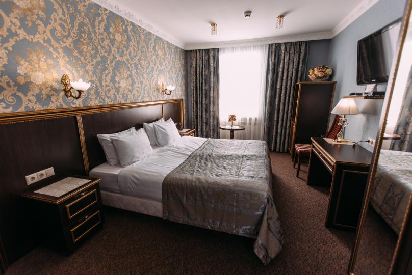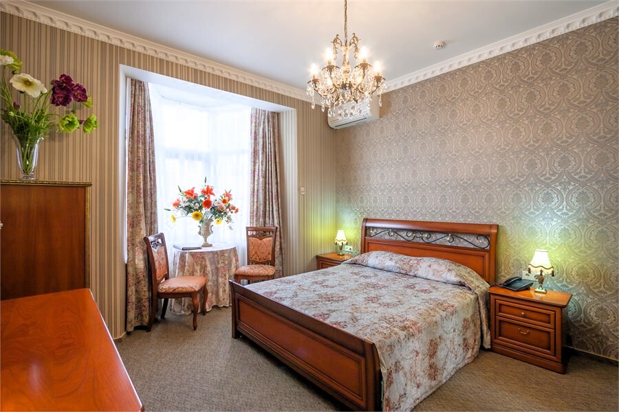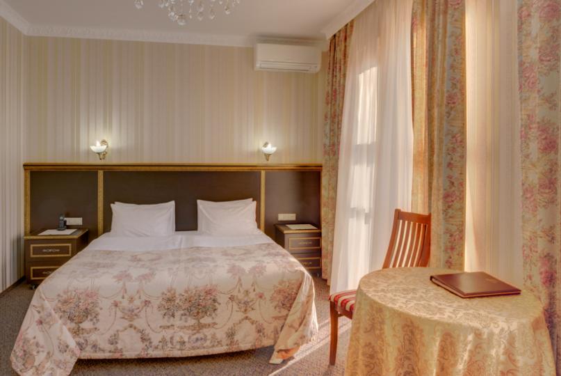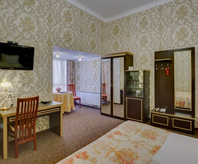 Изысканный просторный однокомнатный номер с классической мебелью, двуспальной кроватью идеально подходит для комфортабельного пребывания в гостинице. В ванной комнате предусмотрена душевая кабина.