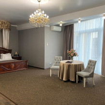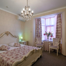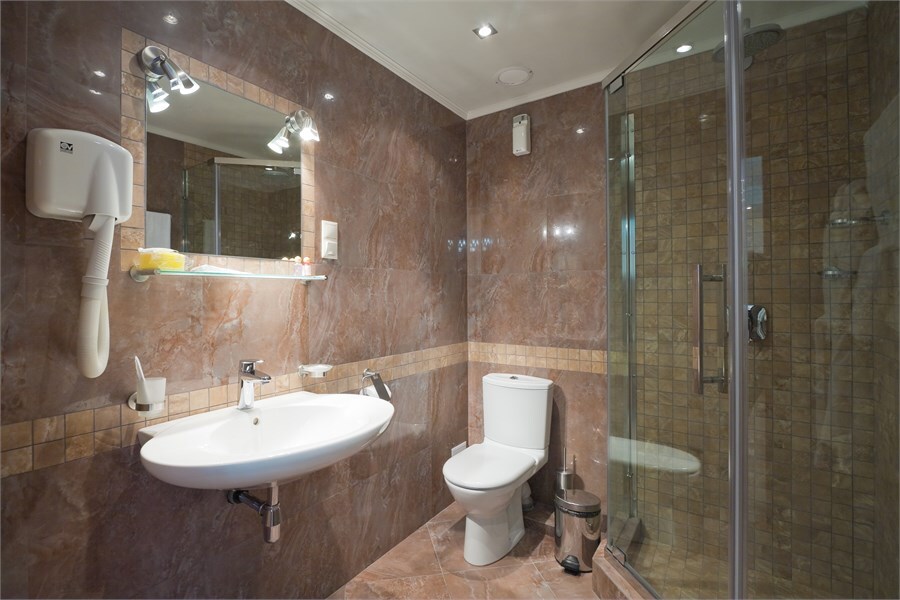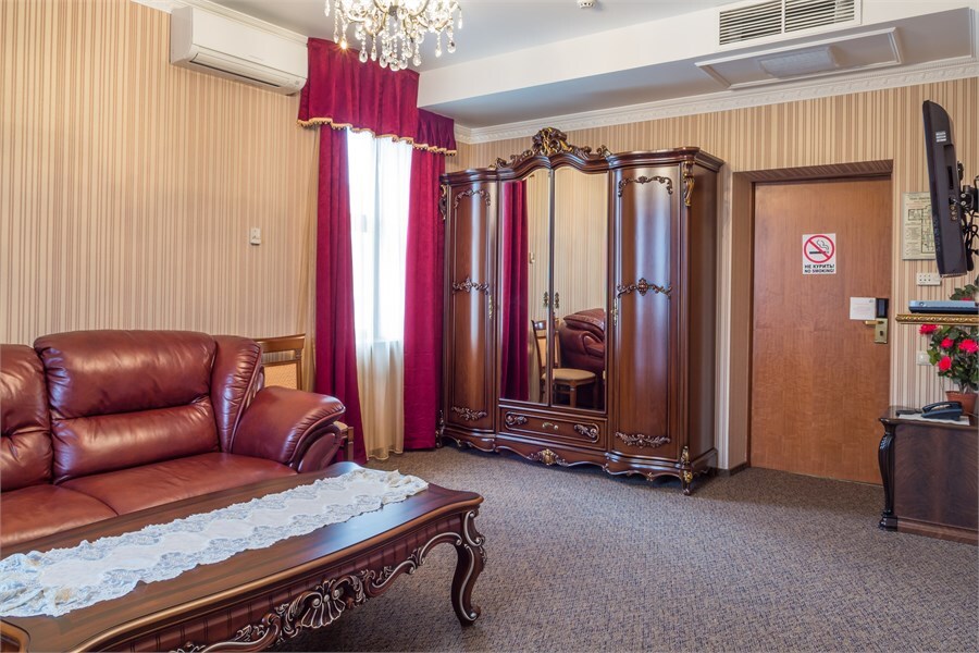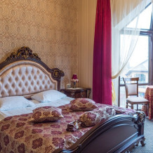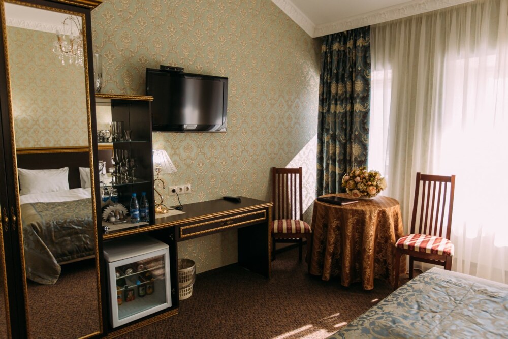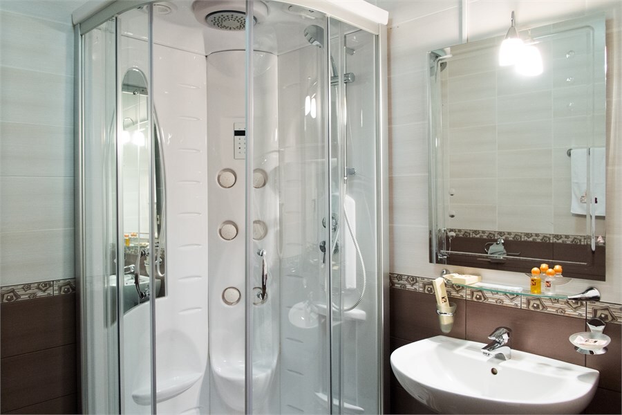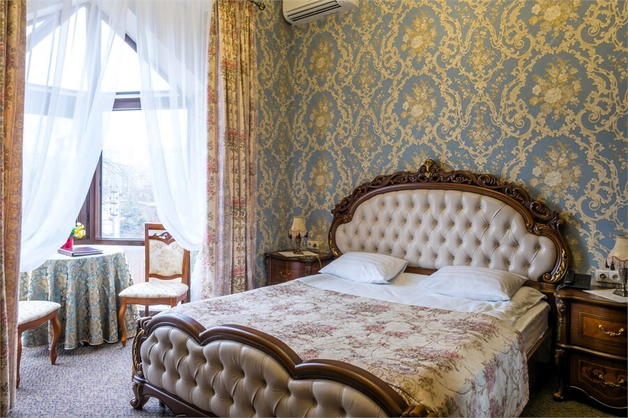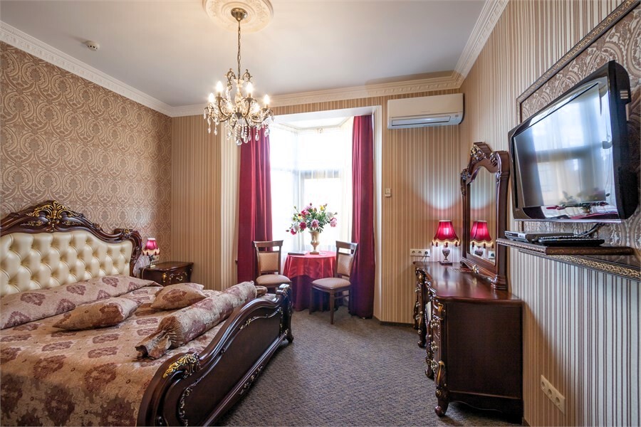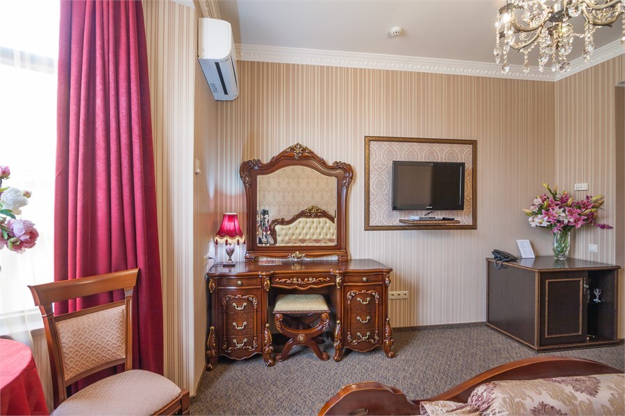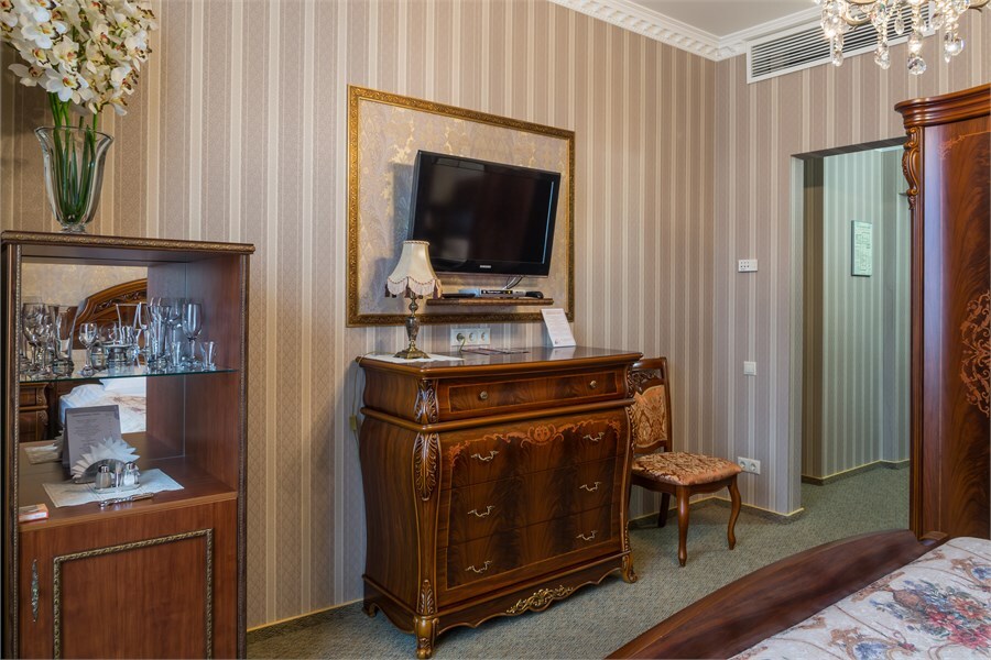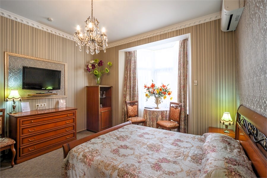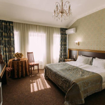 Изысканный просторный однокомнатный номер с классической мебелью, двуспальной кроватью идеально подходит для комфортабельного пребывания в гостинице. В ванной комнате предусмотрена душевая кабина.